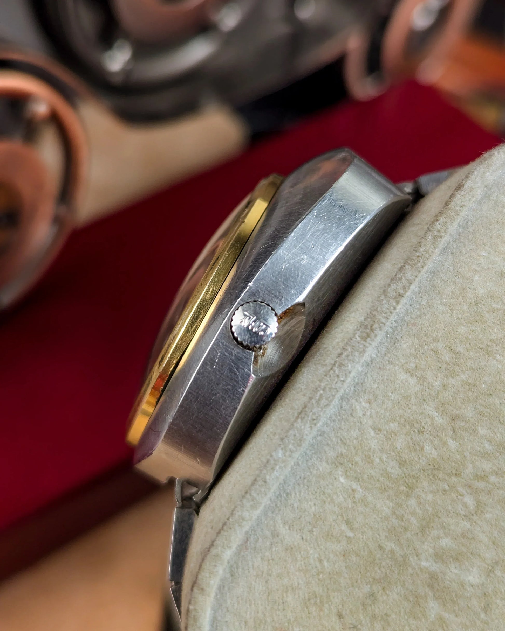 This timepiece is a magnificent artifact of 1970s Swiss avant-garde styling, representing a time when Camy was competing directly with the biggest names in experimental design. The Time Square, reference 7741, is defined by its massive, high-polished stainless steel "UFO" cushion case that frames a mesmerizing smoke-to-chocolate gradient dial. The dial is a masterclass in texture, featuring high-relief, faceted gold-toned hour markers that play brilliantly with the light. It is powered by the legendary ETA 2789, one of the first Swiss automatic movements to offer a quick-set Day-Date complication, operating at a reliable $21,600 \text{ bph}$ with a robust mechanical heart designed for daily endurance.