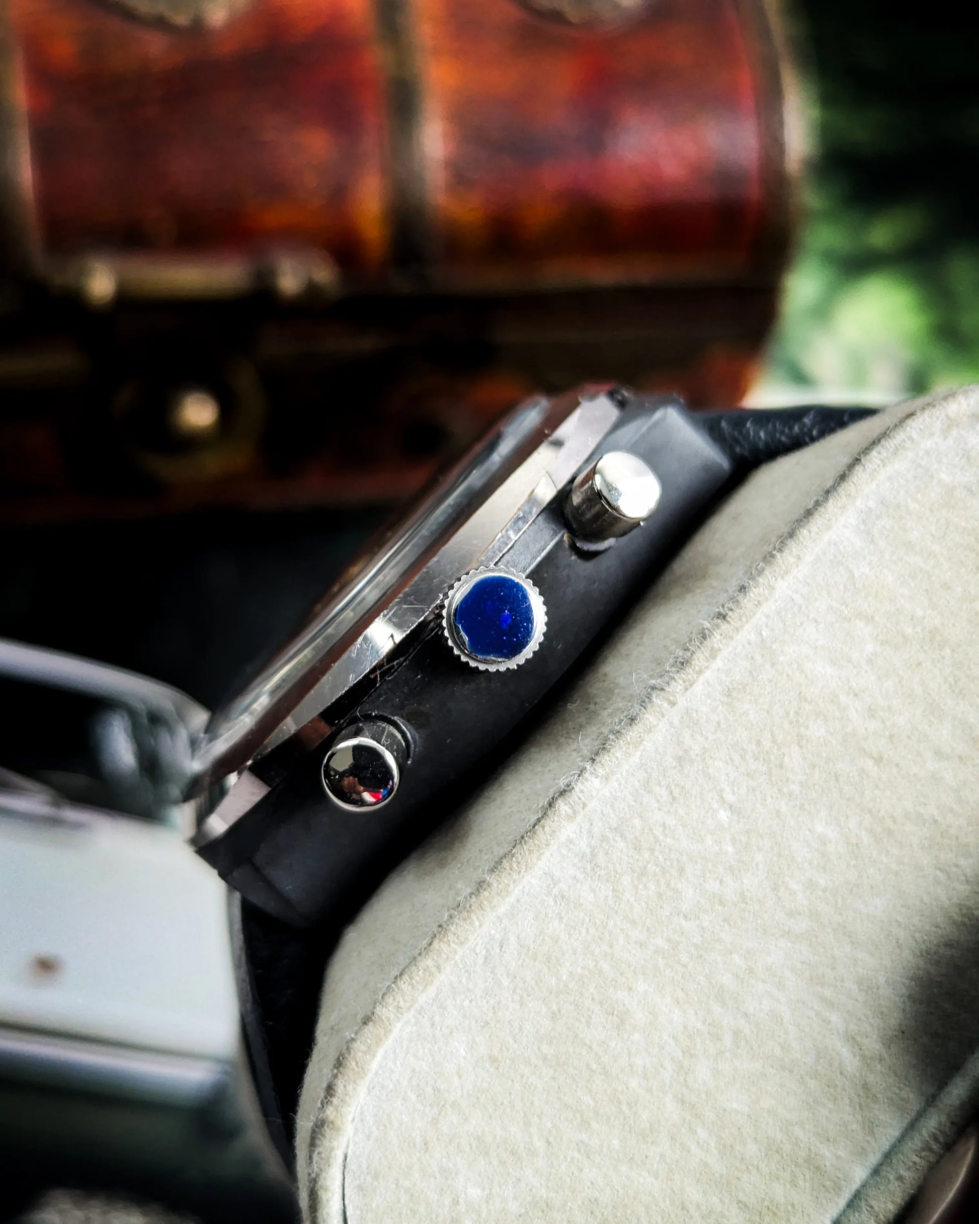 Aesthetically- this is a phenomenal "Reverse Panda" style dial, featuring a striking silver base with the two sub-registers and a minute track in bold blue and orange accents. This high-contrast- colorful design screams 1970s motorsport racing and gives the watch an incredible, aggressive visual punch. The caseback engraving confirms its robust qualities- proving it was built as a serious tool watch.