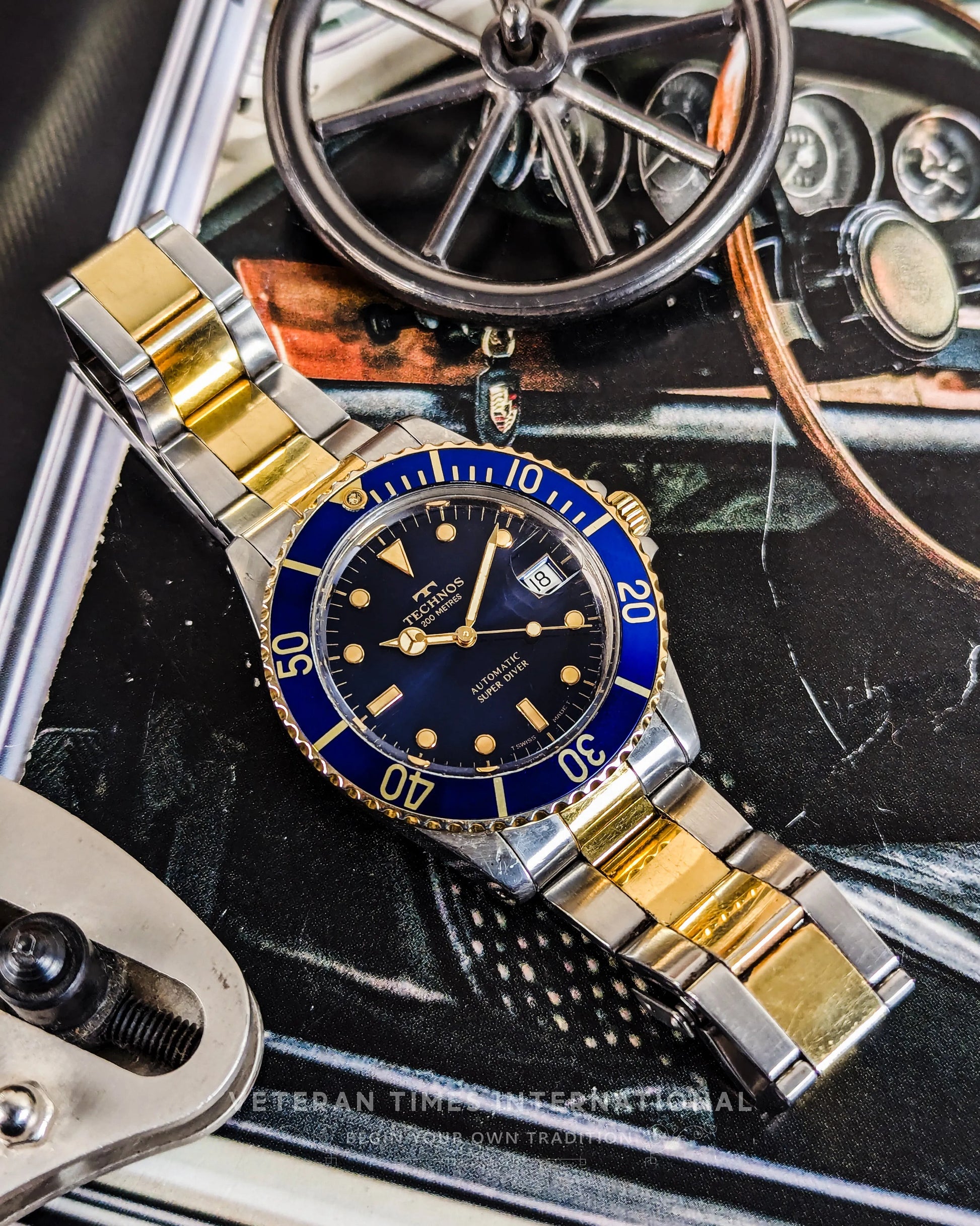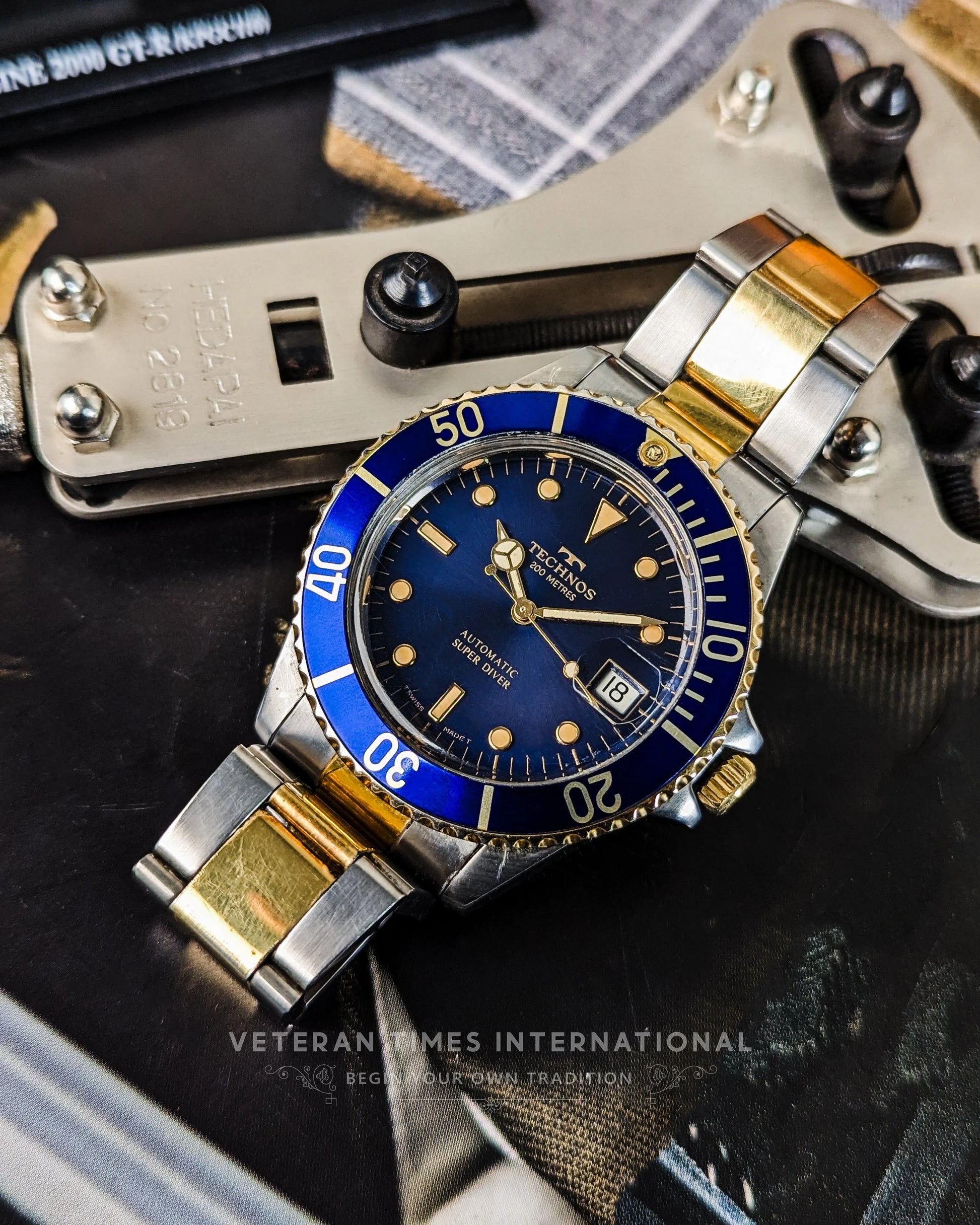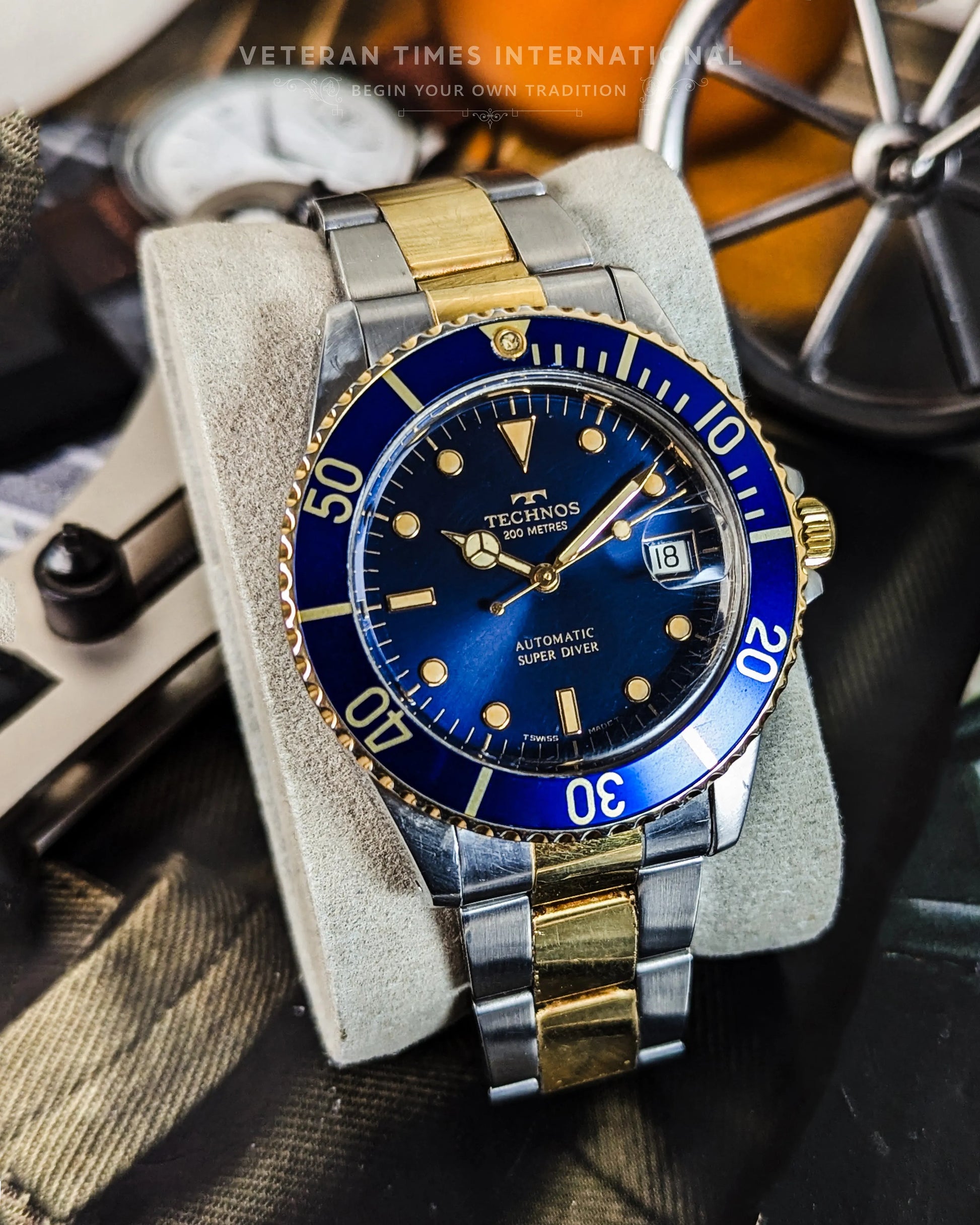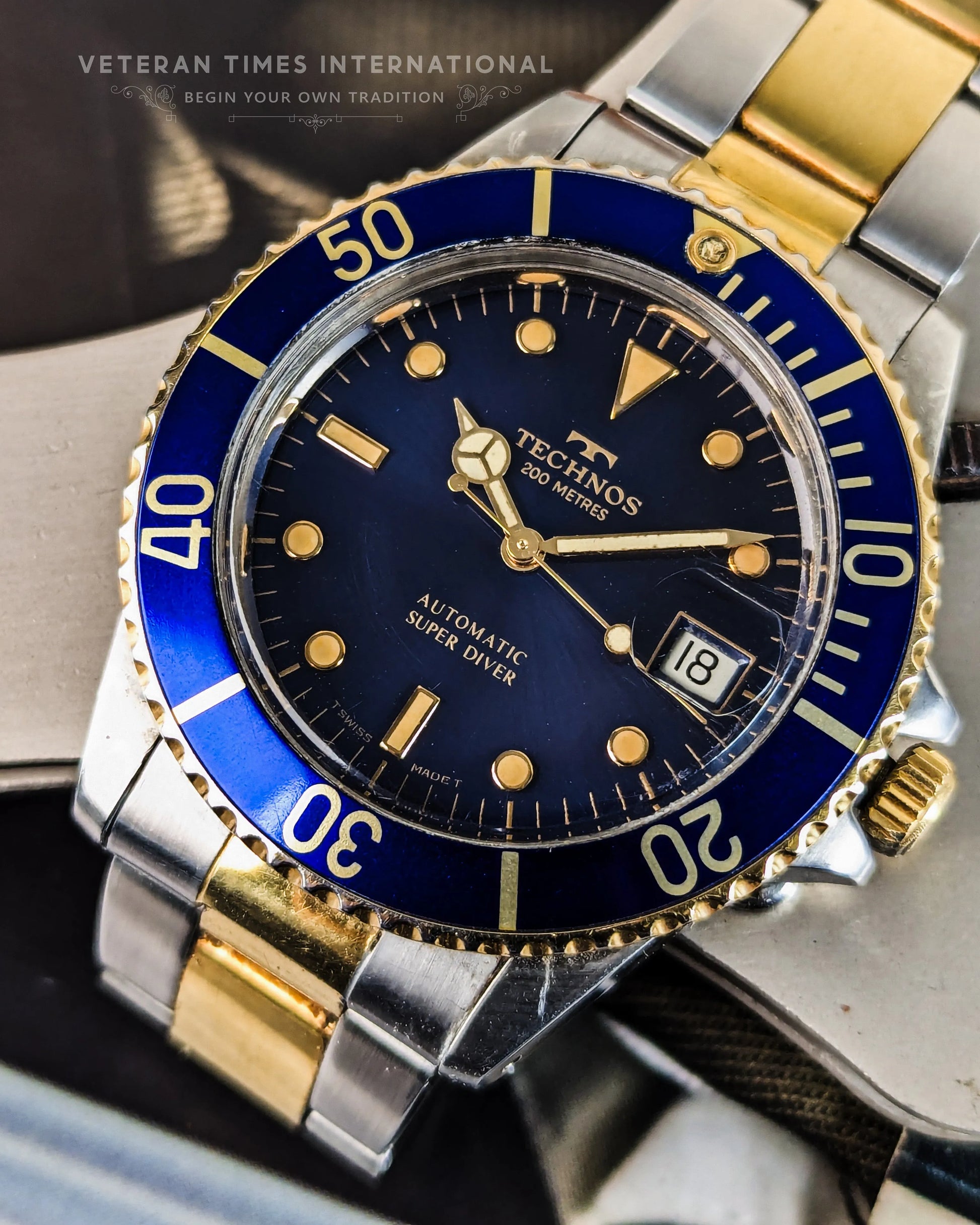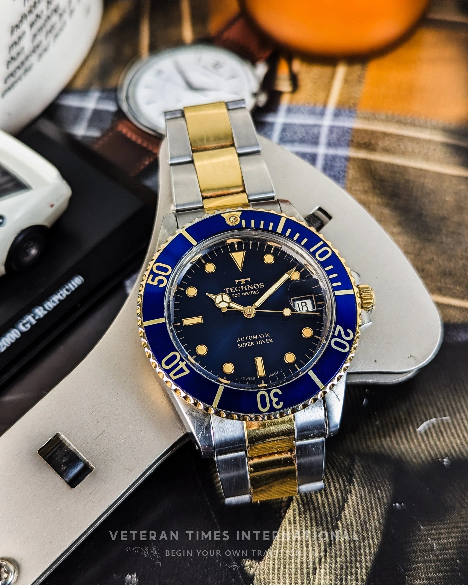 This vintage Technos watch, reference number 14733, hails from the 1970s and embodies the classic sporty aesthetic of the era. The striking blue dial, complemented by a rotating blue bezel, features luminous hands and markers. A date complication is likely positioned at the 3 o'clock mark. The dial proudly displays "Technos," "Automatic," and "Super Diver" branding.
