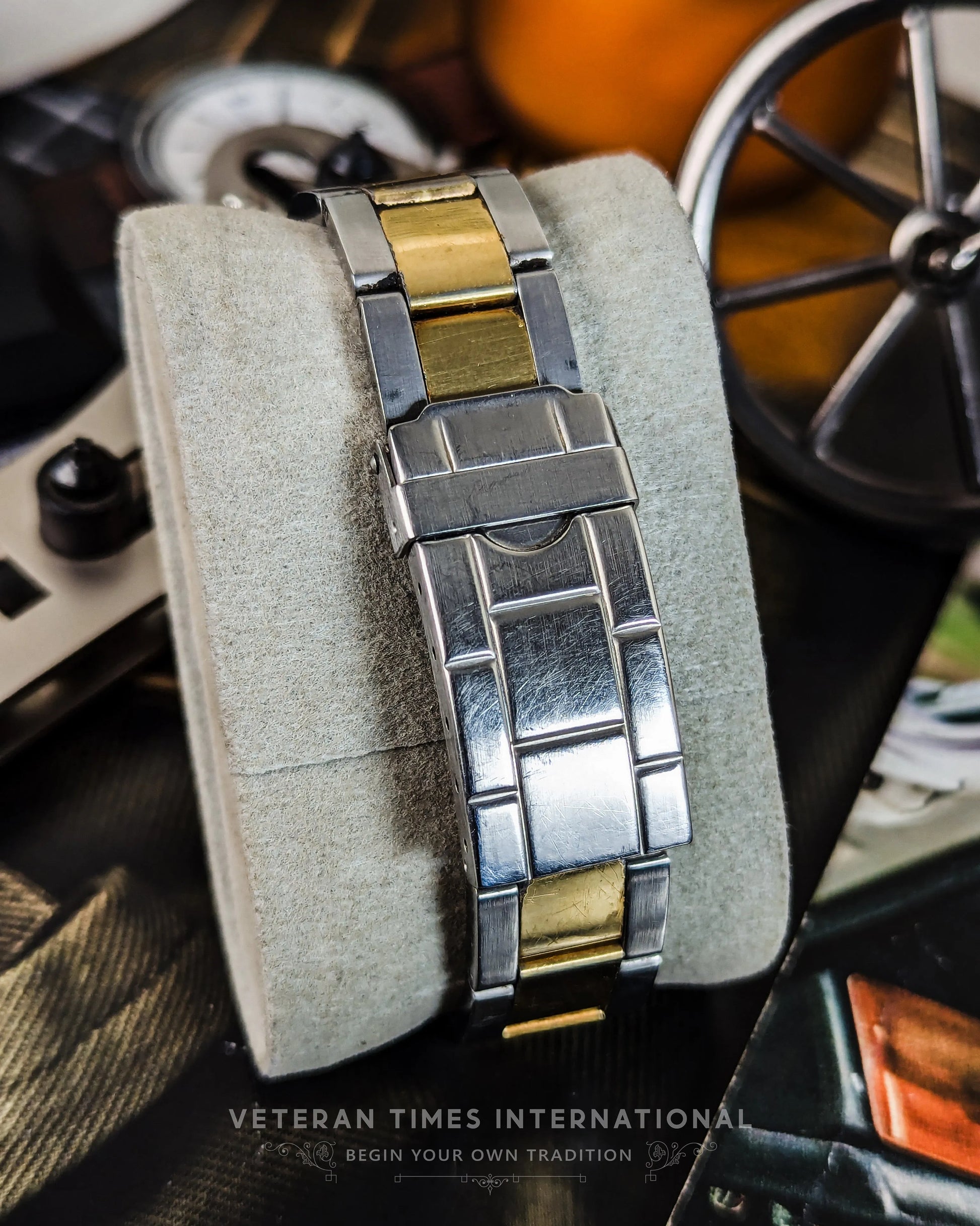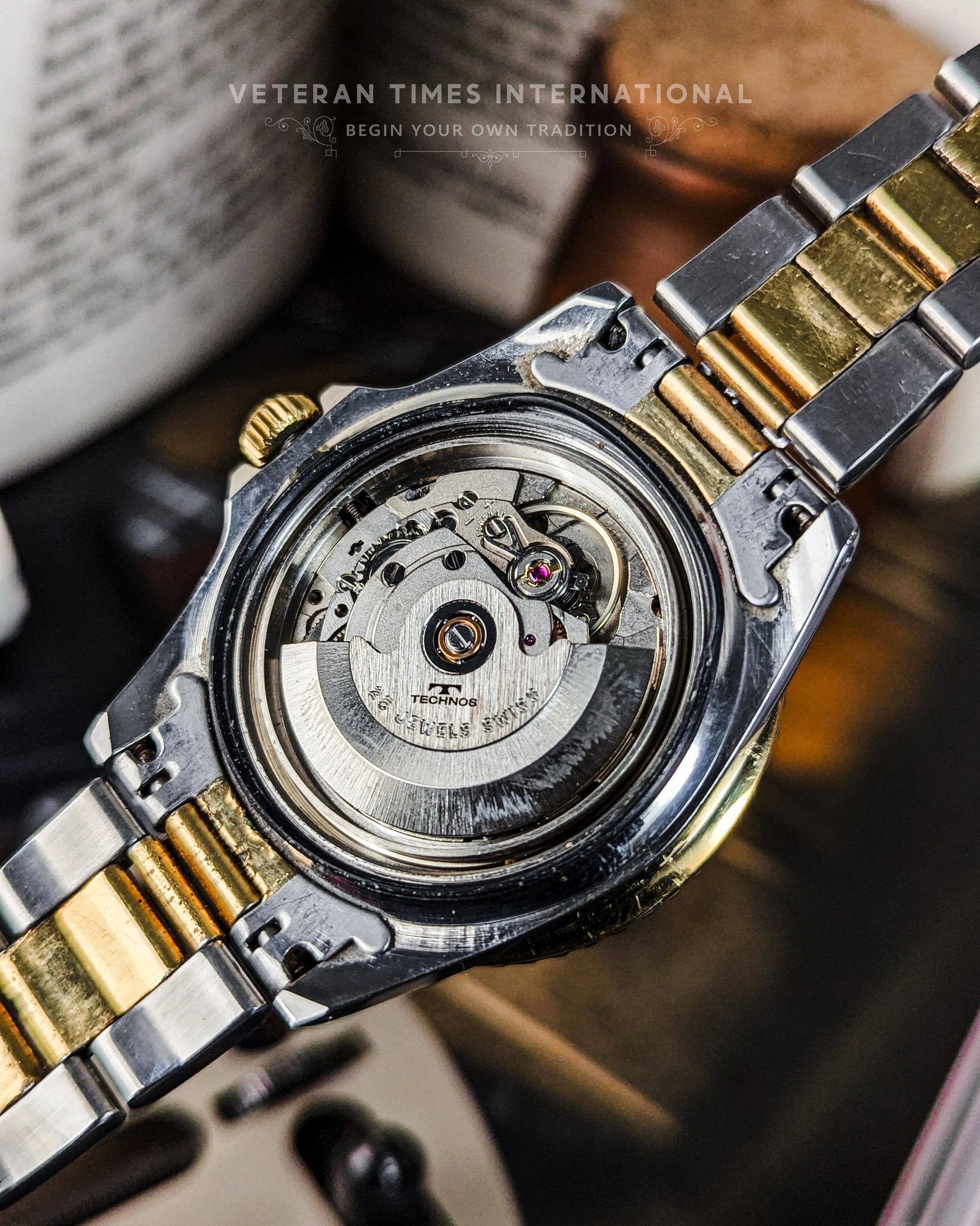 The 42mm stainless steel case, accented with gold tones on the bezel and bracelet, adds a touch of elegance to its sporty design. The two-tone stainless steel bracelet completes the look, offering durability and a secure fit. A 25-jewel automatic movement powers the watch, combining the convenience of self-winding with traditional Swiss watchmaking. This Technos watch, made in Switzerland, is a testament to the brand's history of producing reliable and stylish timepieces. The 20mm lug width and matching bracelet contribute to its balanced proportions.