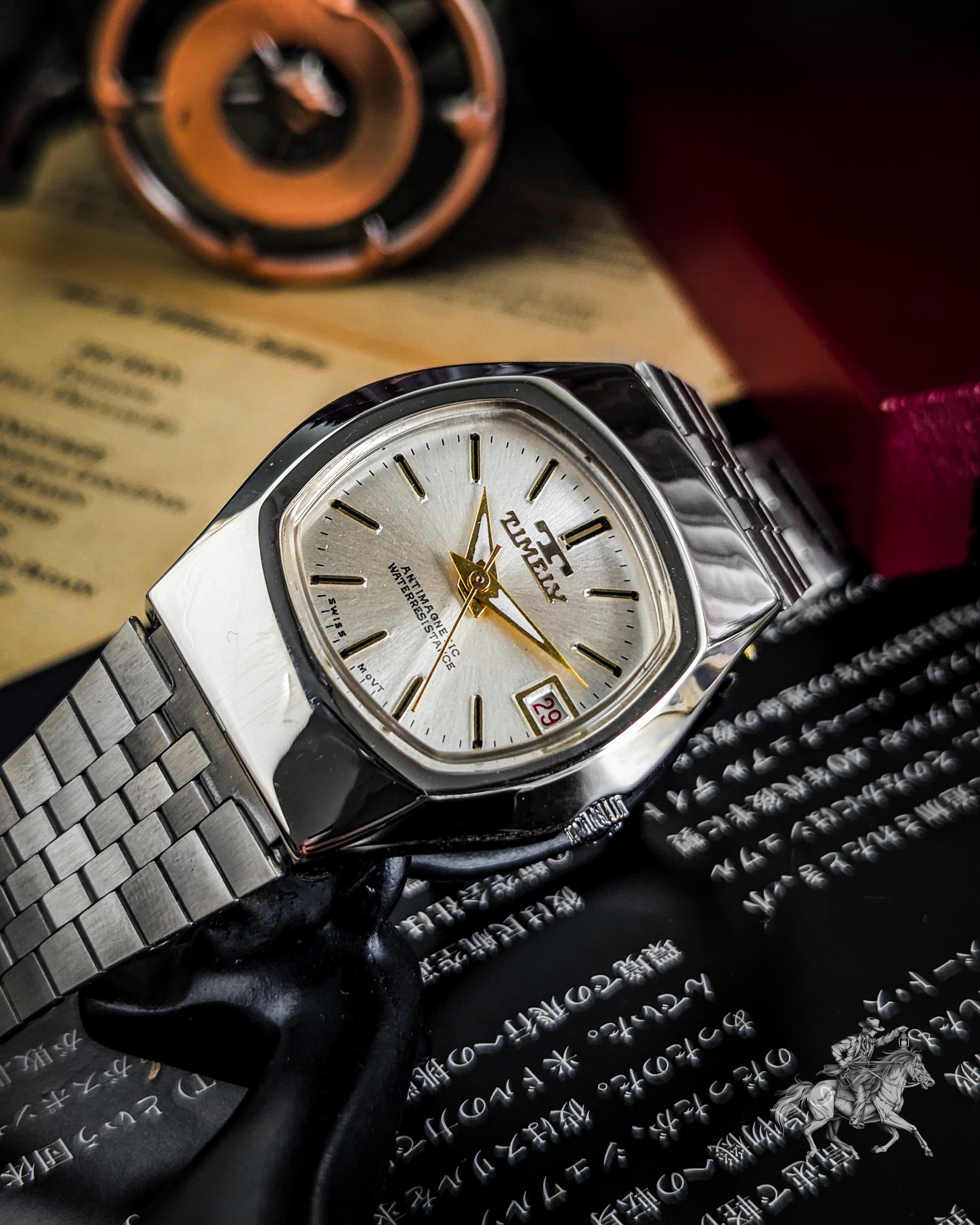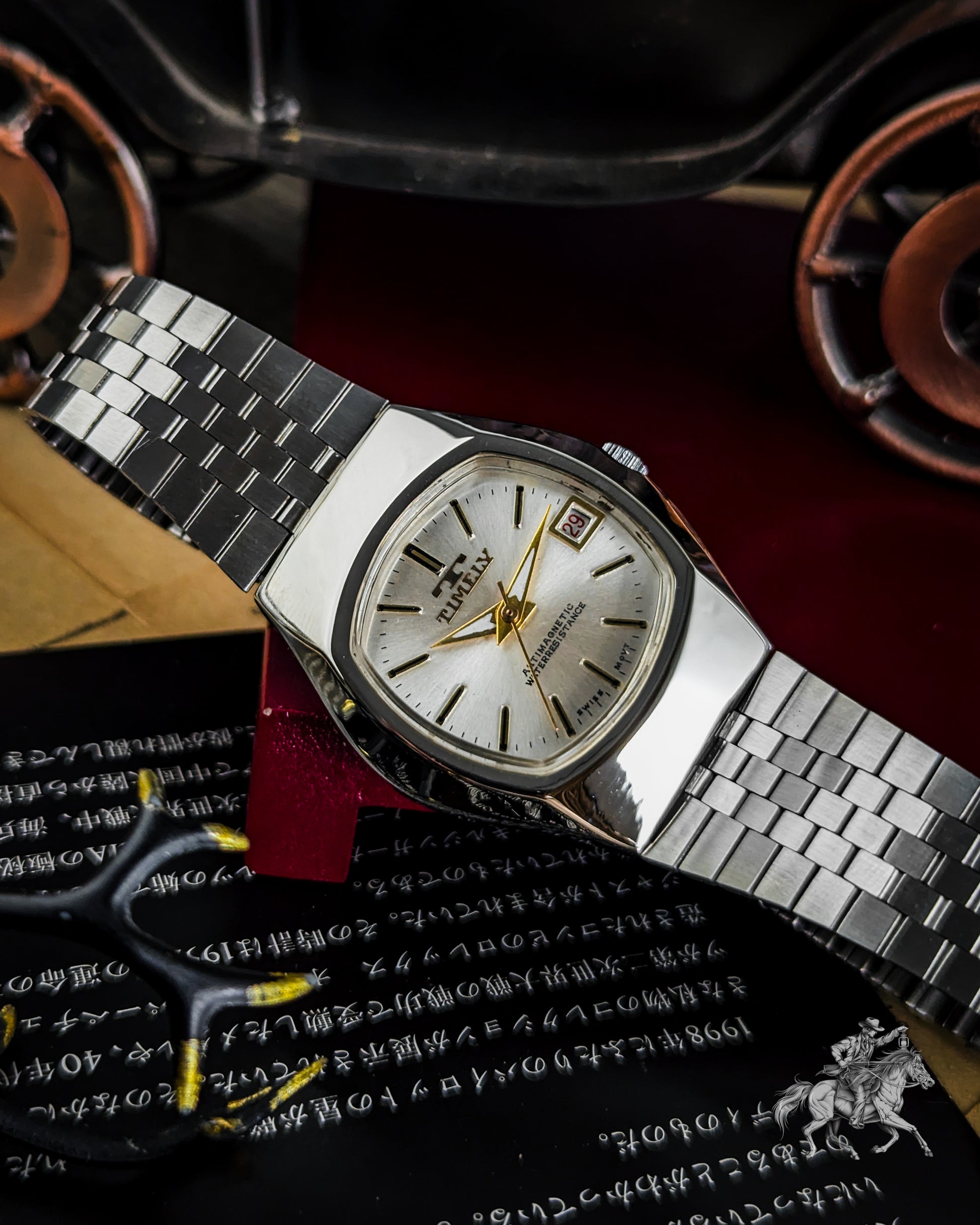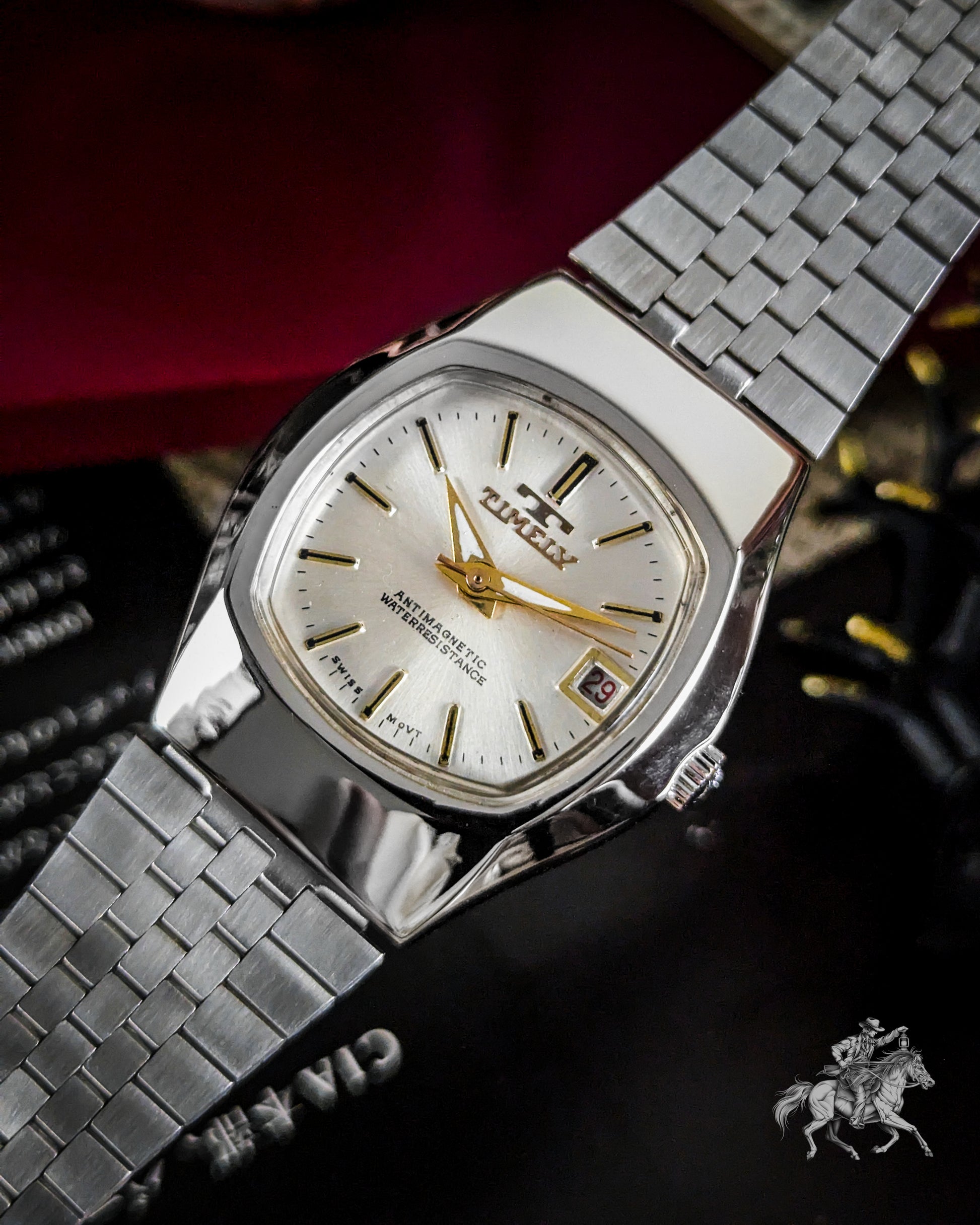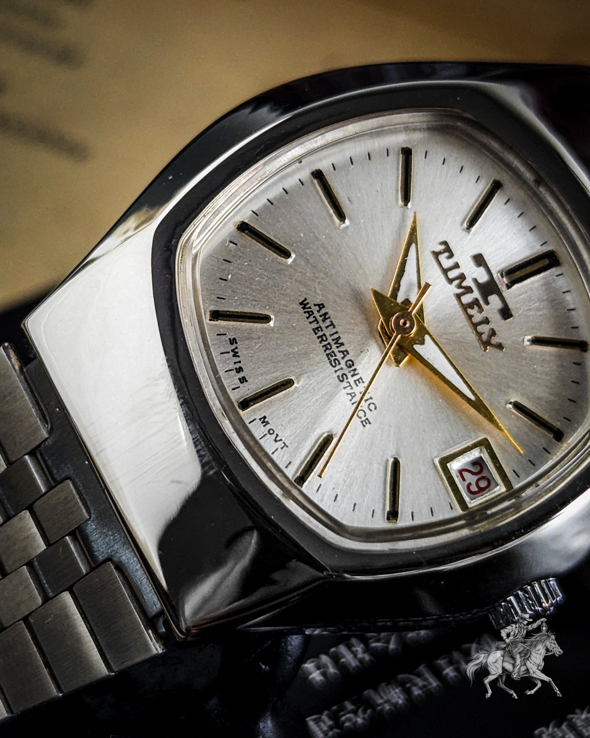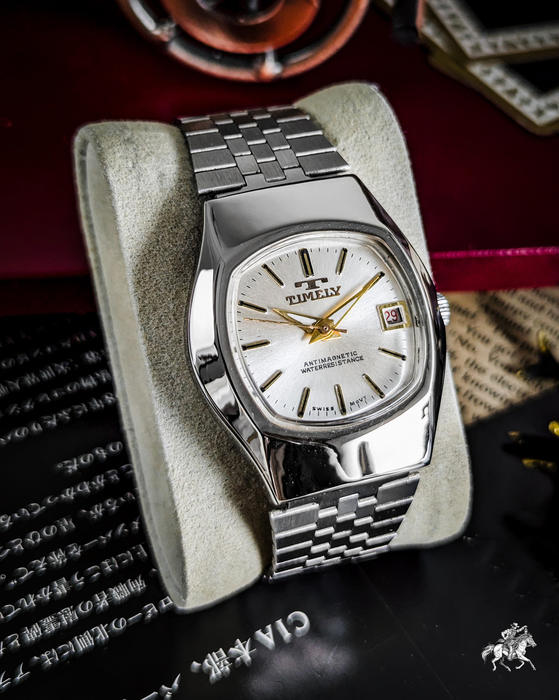 This vintage Timely is an absolute stunner, a quintessential timepiece from the 1970s Swiss era. The tonneau-shaped stainless steel case gives it a bold presence that's both classic and a bit funky, perfectly capturing the design ethos of the time. The beautiful white sunburst dial is complemented by sharp, gold-toned hands and markers, giving it an elegant, high-end look that seriously punches above its weight class. It’s the kind of watch you find that makes you want to get into vintage collecting.
