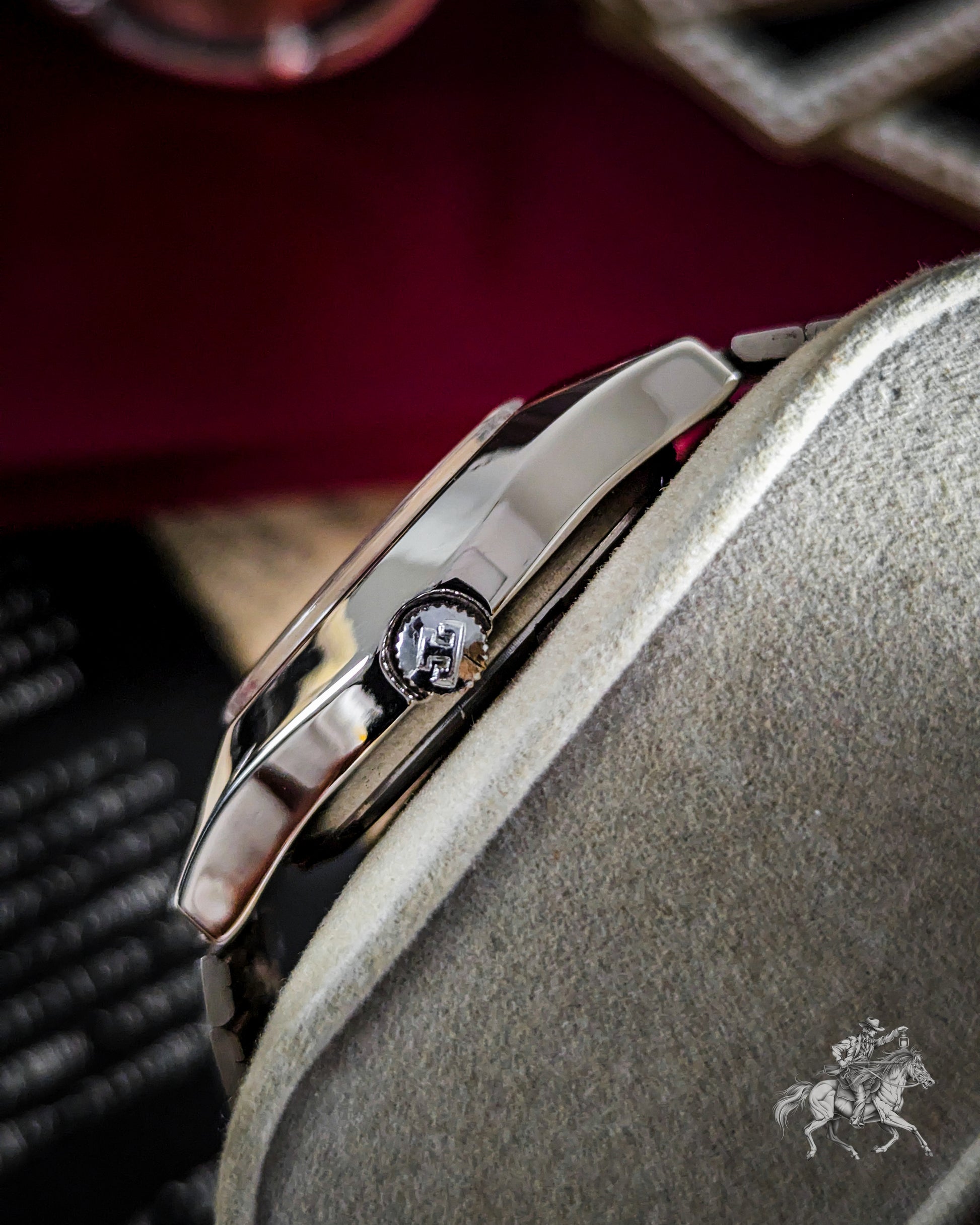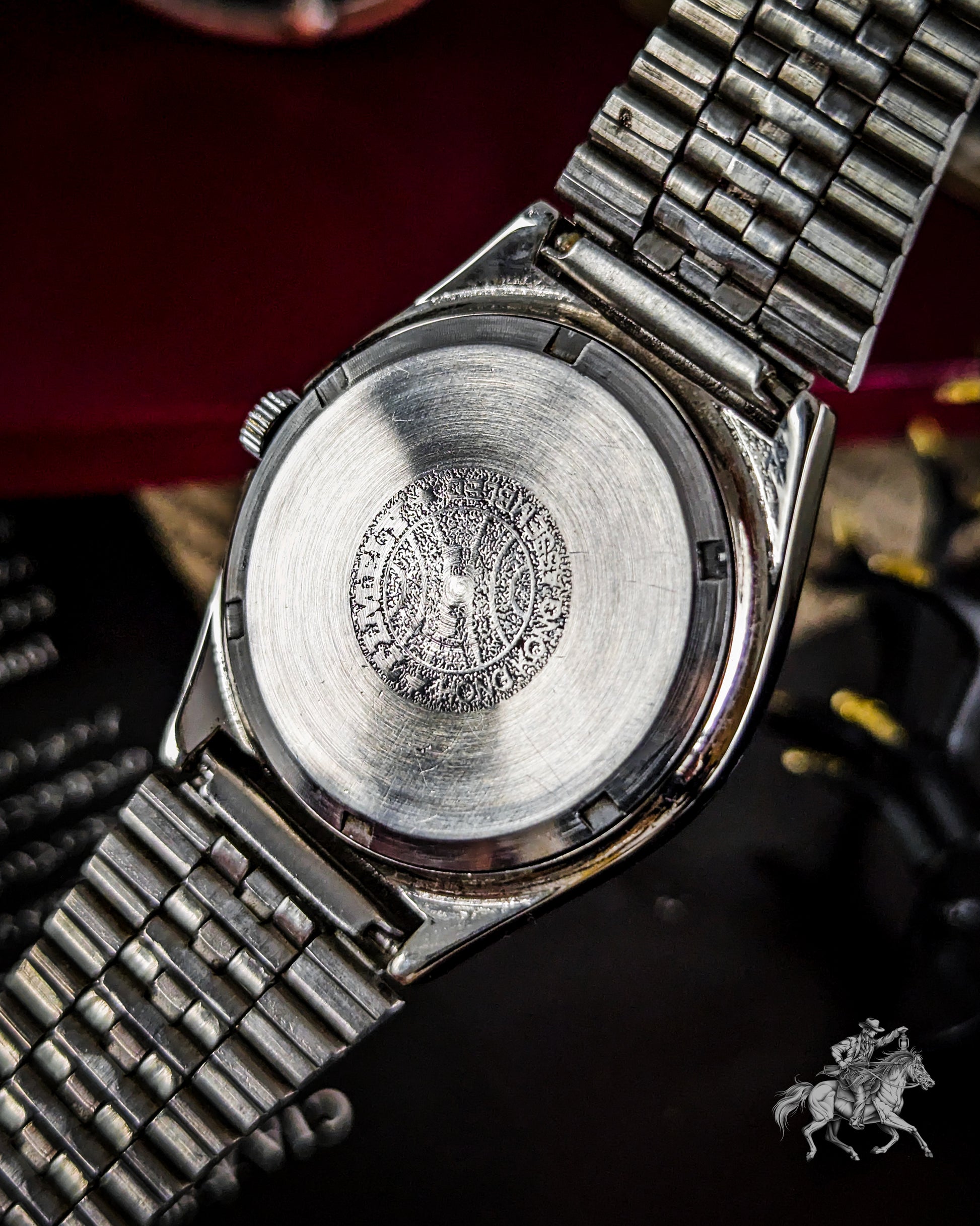 Powering this handsome watch is a reliable Swiss automatic movement, a workhorse from an era when many Swiss companies were producing solid, dependable timepieces. The dial proudly declares its antimagnetic and water-resistant features, a testament to its robust build quality. The watch is in great condition for its age, and the integrated bracelet provides a cohesive aesthetic that feels both substantial and stylish. The detailed crest on the caseback is a cool little touch that adds to its history.