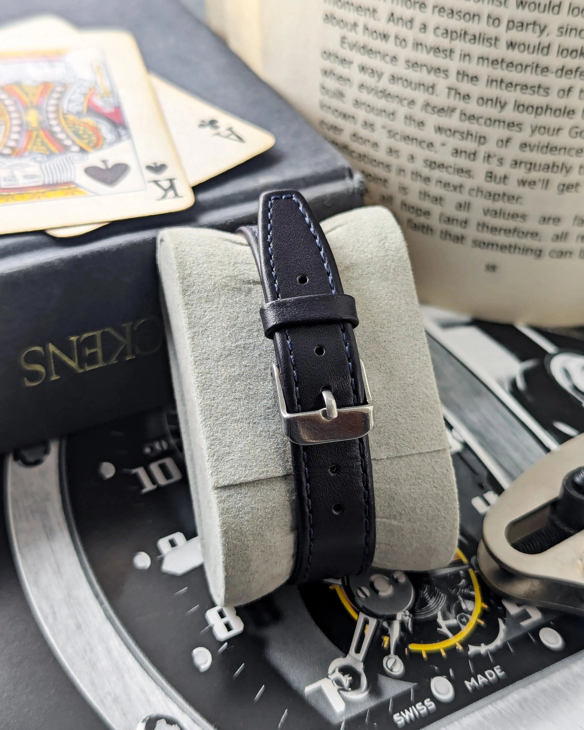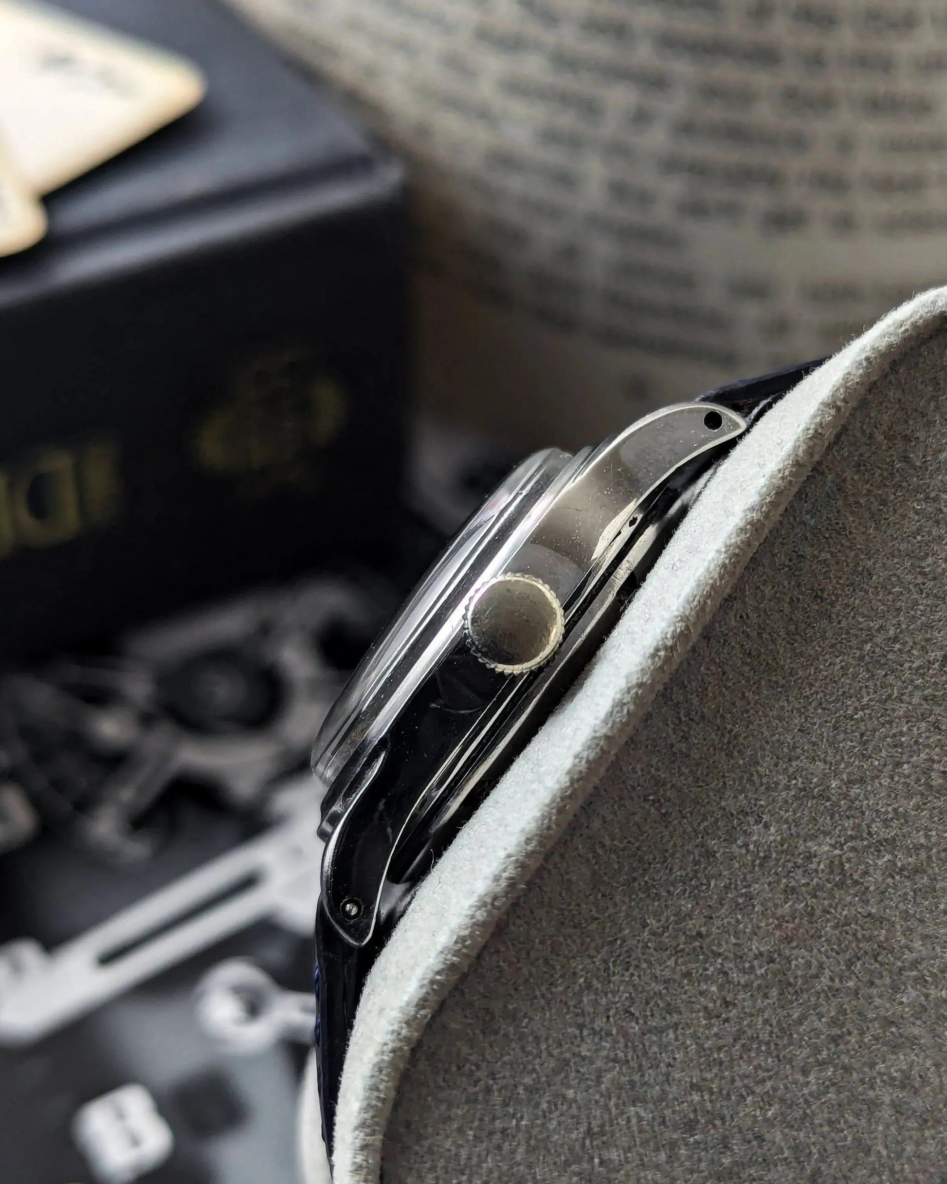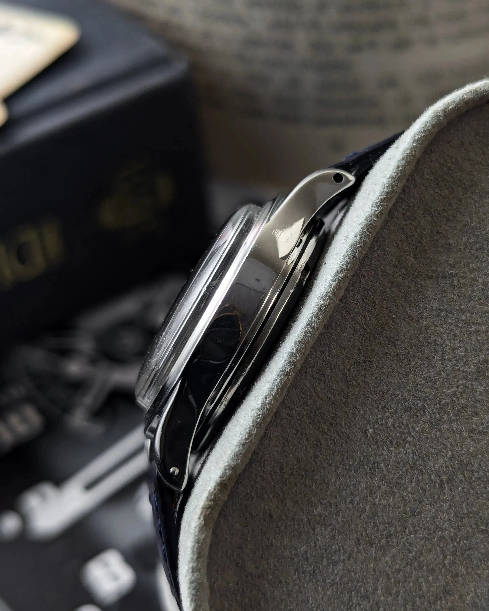 It has just been serviced and keeps excellent time. The un-signed crown is slightly worn but still in its best condition as you see. The stainless-steel case along with black leather strap provides a look of elegance to its wearer. The dial is un-restored and is in lovely original condition.