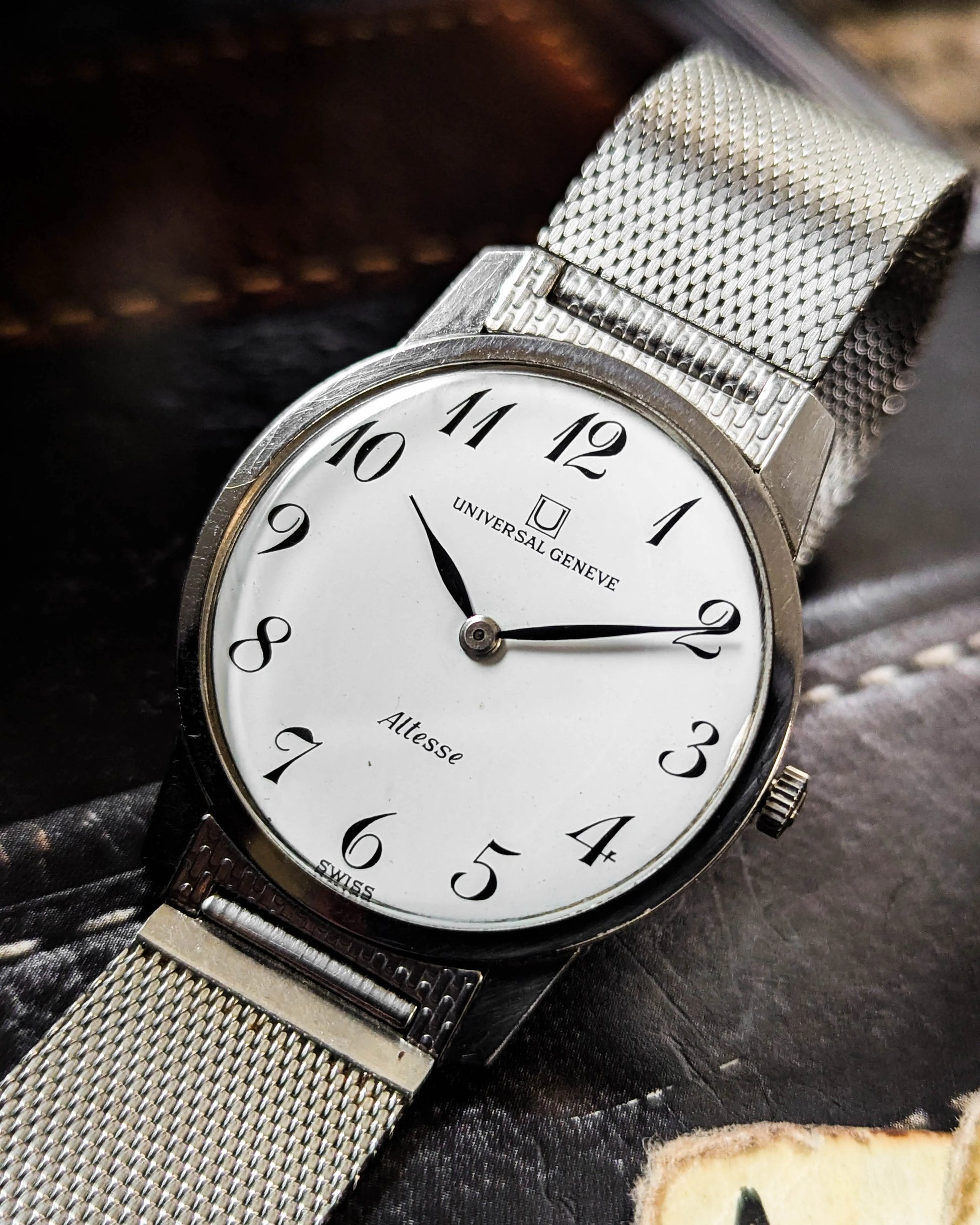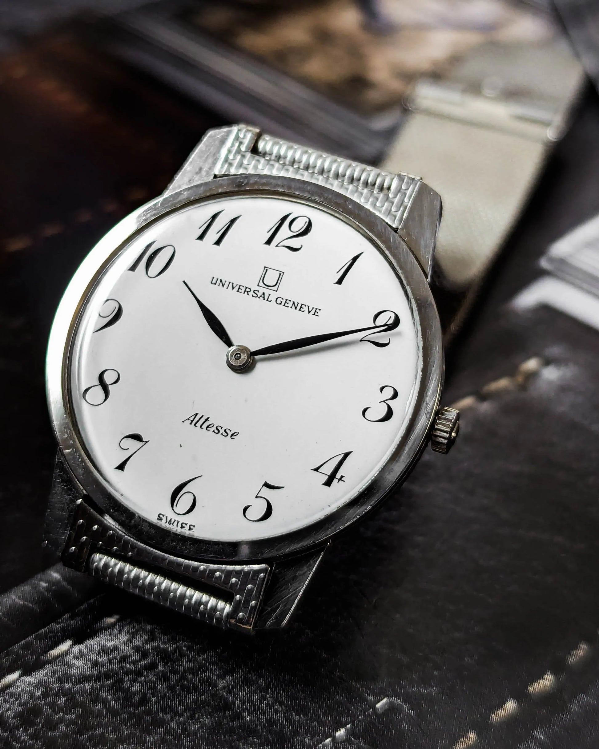 The Altesse has a slim 31mm case, which is a characteristic of vintage style, and a simple dial with the Universal Genève emblem and attached hour markers. It is a favorite among collectors and enthusiasts because to its classic look and dependable manual movement.