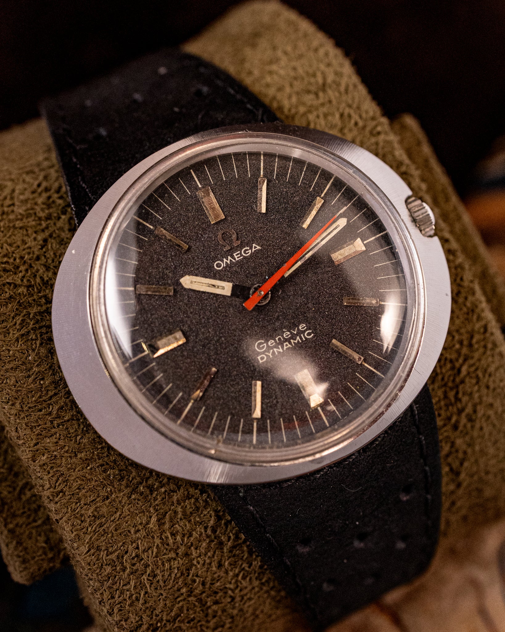 The architecture is quintessentially space-age, utilizing an integrated strap system where the case is actually held in place by a large threaded ring on the back, allowing for a perfectly smooth, lugless profile. The dial is a work of high-contrast Swiss art, often featuring a "Bulls-eye" or racing aesthetic with vibrant colors that prioritize instant legibility. Flipping the watch over reveals the crisp "Tool 107" and "Waterproof" engravings on the smooth caseback, definitively confirming its authentic Swiss heritage. This is an essential acquisition for an elite collector who appreciates avant-garde industrial design, the mechanical soul of a 24-jewel heart, and the bold, aerodynamic presence of the Omega Dynamic.