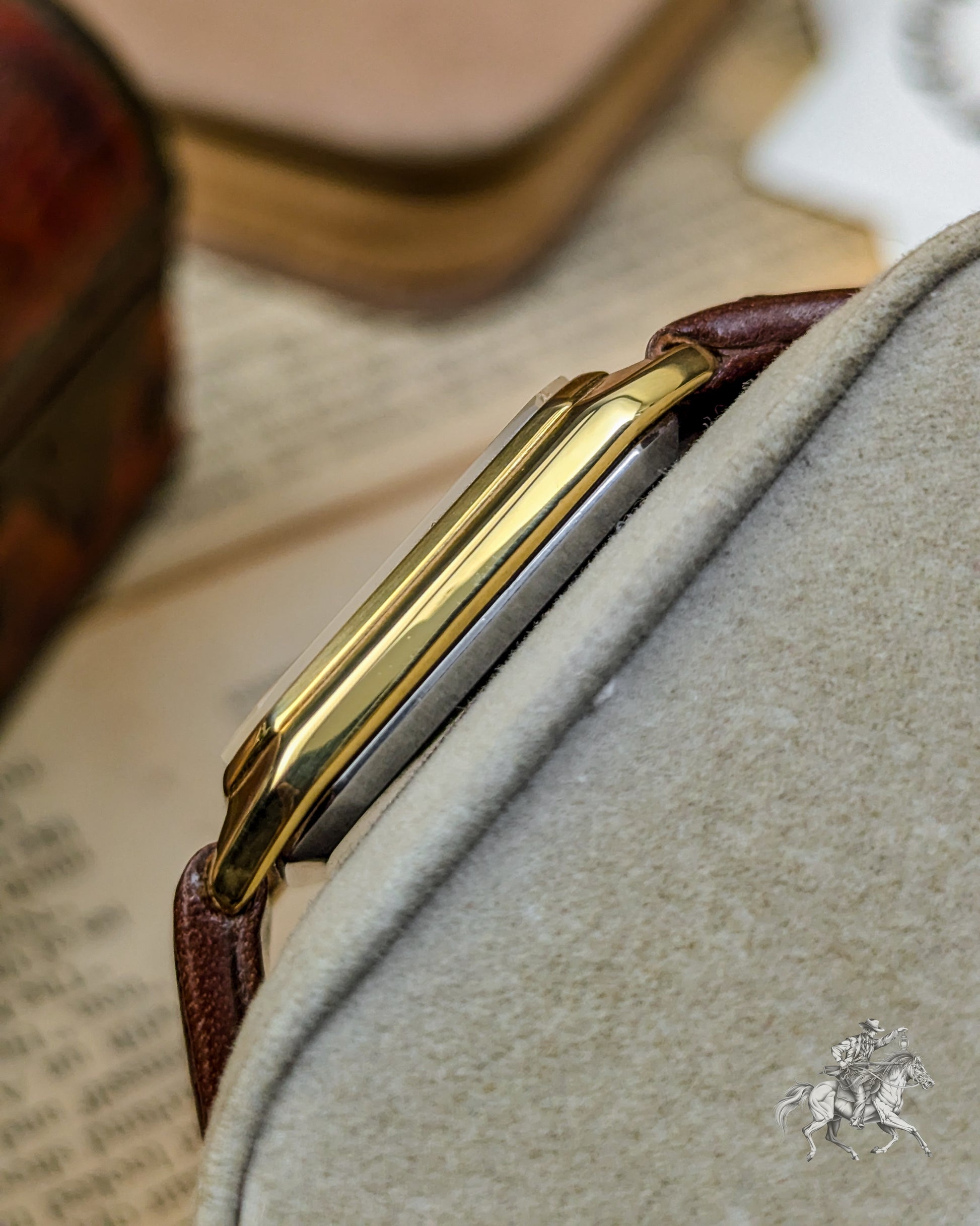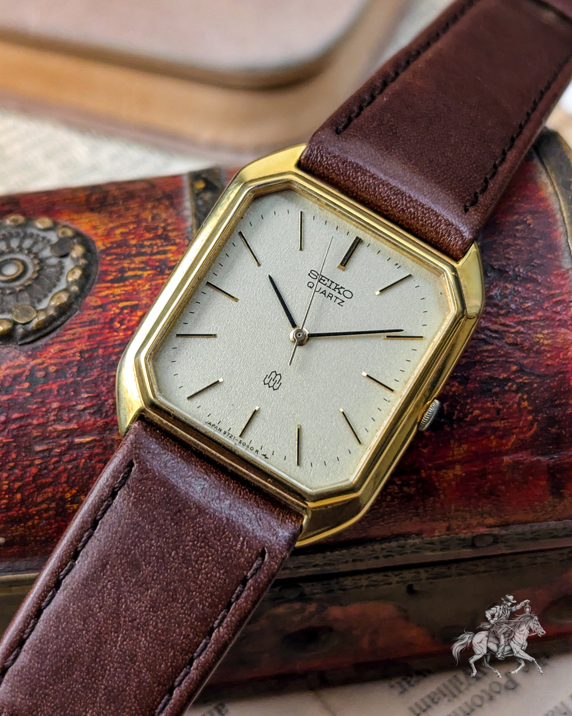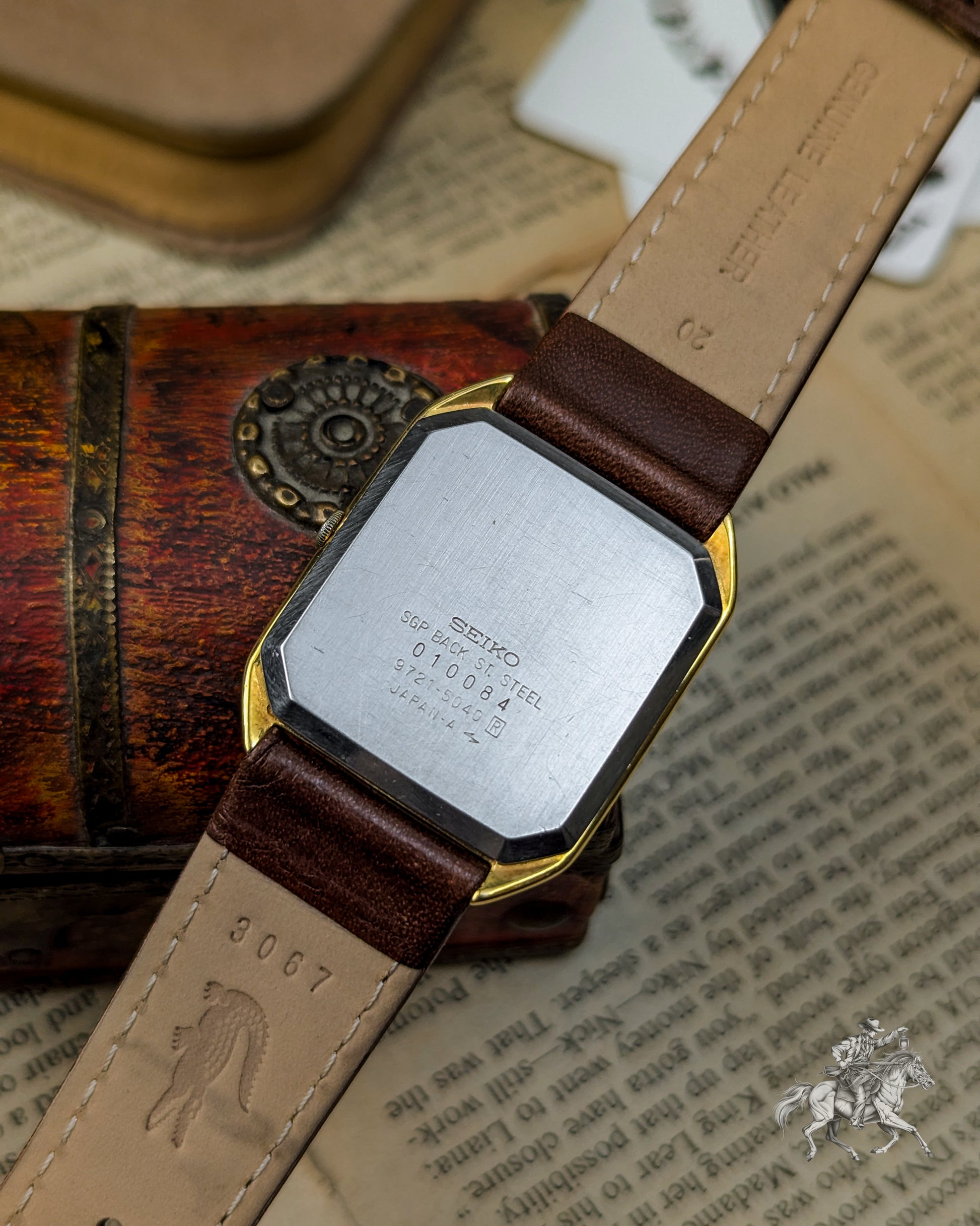 This elegant timepiece embodies the technical perfection and minimalist luxury of the late 1980s, offering a refined aesthetic perfect for a dress setting. This Seiko Quartz, reference 9721-5040, is defined by its classic rectangular "Tank" style case and a beautiful gold-plated finish, which was highly popular for premium dress watches in the Japanese Domestic Market (JDM). It is powered by the dependable Seiko Caliber 9721, a high-quality quartz engine that provides excellent grab-and-go accuracy with exceptional reliability and allows the case to be exceptionally slim and discreet on the wrist- a key characteristic of a luxury dress watch. Aesthetically, the dial is uncluttered, featuring simple gold-toned baton indices and a refined, two-hand display (no seconds hand), achieving a pure, elegant aesthetic that speaks volumes about its sophistication. The serial number suggests a production date around 1989 (based on the first digit, 9xxxx), placing it at the zenith of the premium quartz dress watch era.