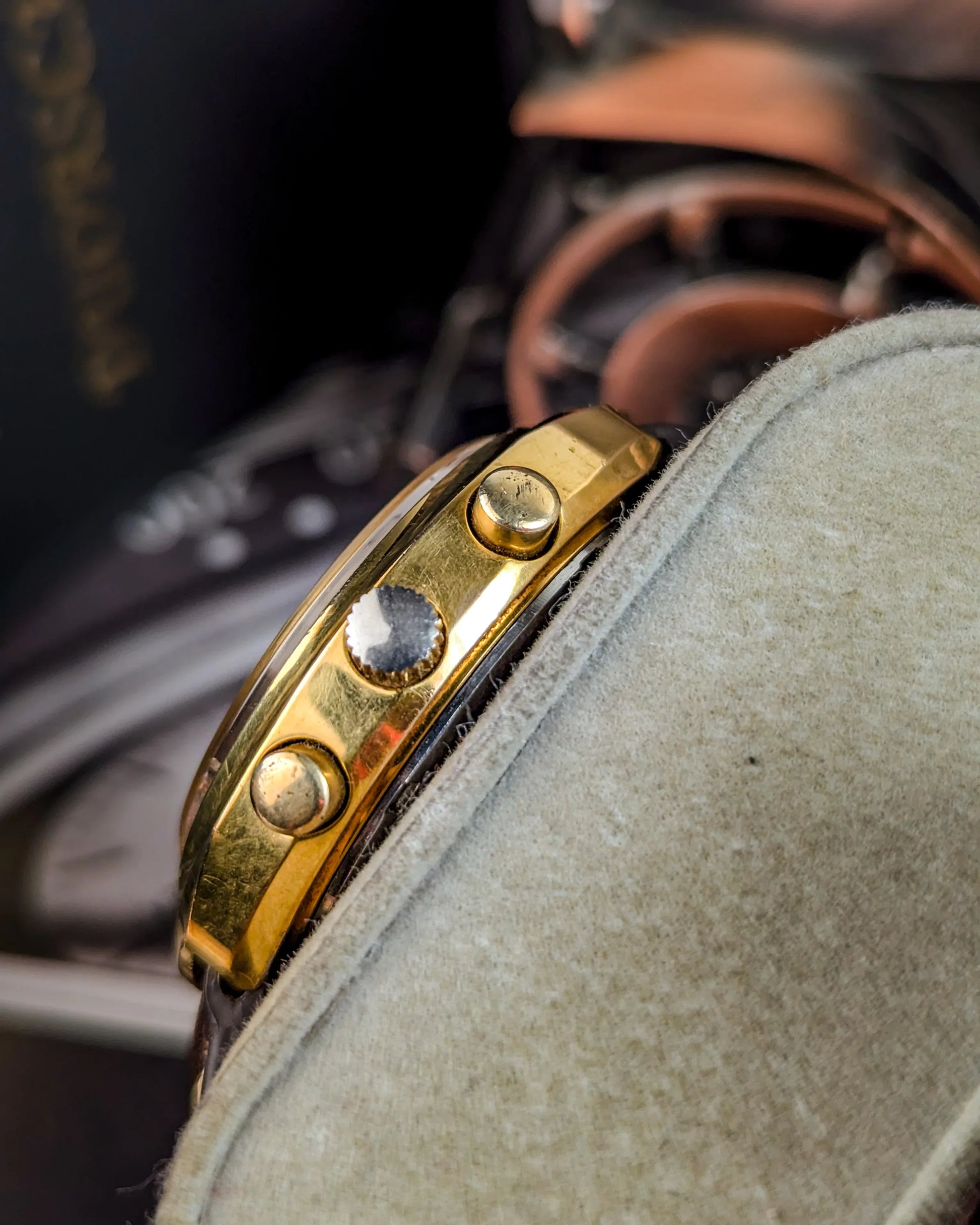 This timepiece is a magnificent artifact of the golden age of mechanical chronographs, representing the bold, functional elegance that defined 1970s Swiss tool watches. The Monceau Chronograph, reference 664751, is defined by its substantial 18k gold-plated cushion case and a breathtaking champagne sunburst dial featuring high-contrast black "reverse-panda" sub-registers. It is powered by the legendary Valjoux 7734 movement, a manual-wind engine world-renowned for its ruggedness and precision, featuring a 30-minute recorder and a date window at 6 o'clock for perfect visual symmetry.