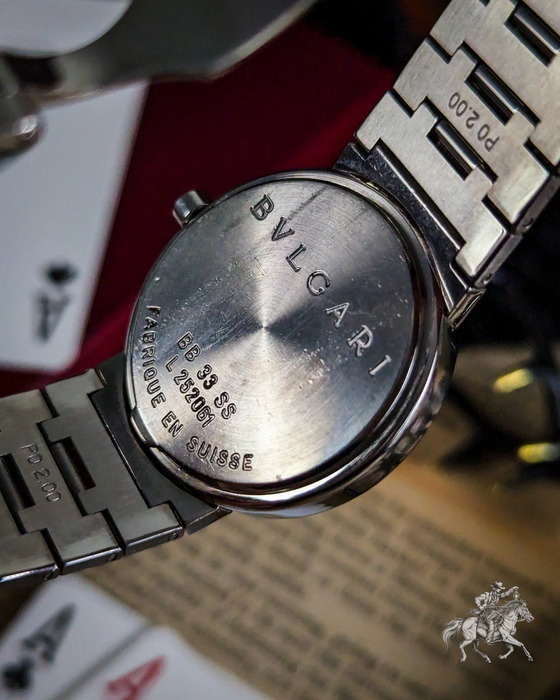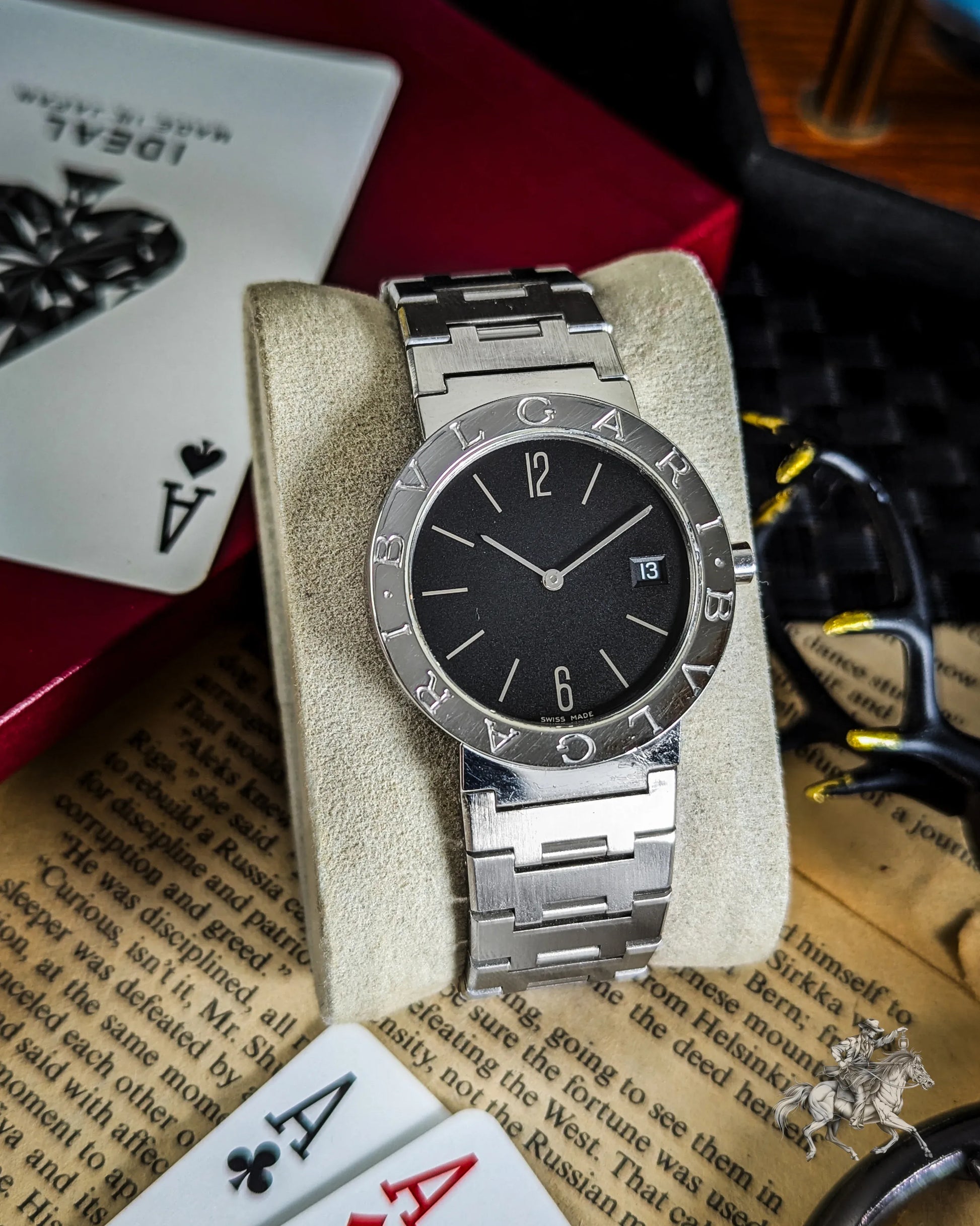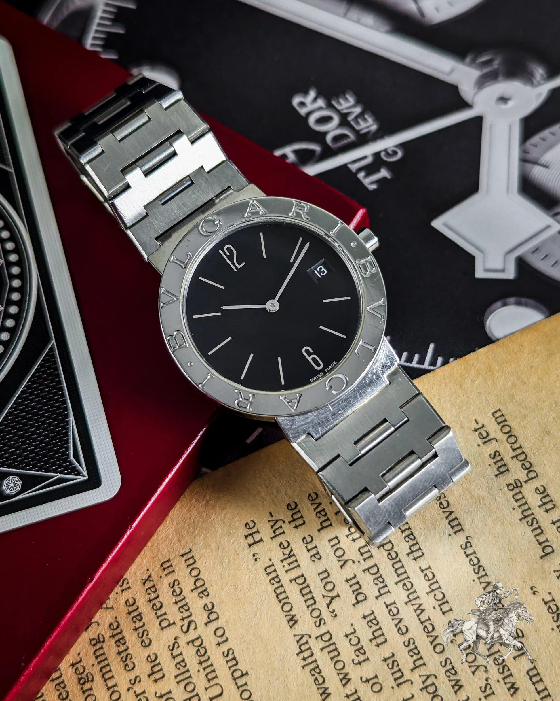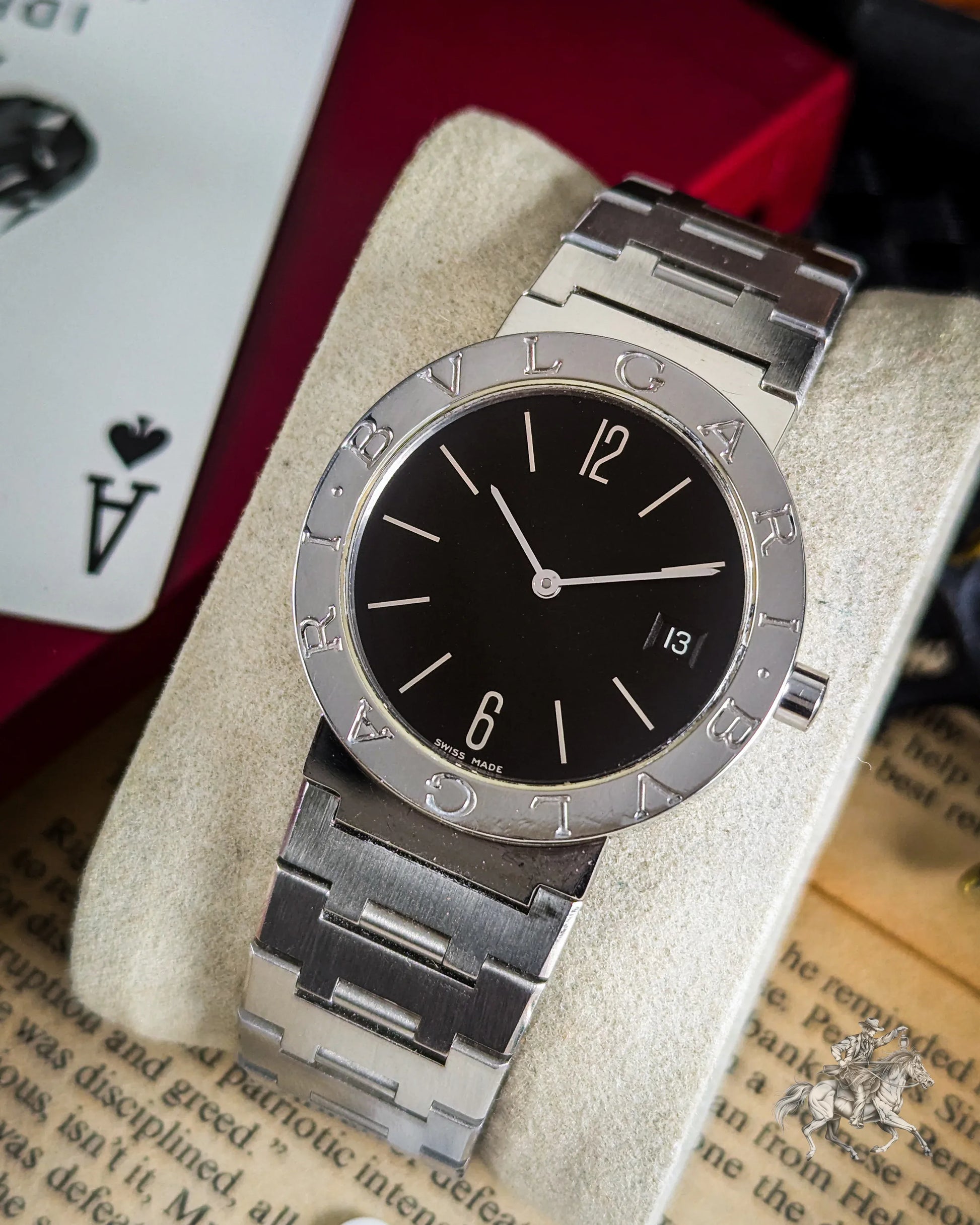 An iconic Bulgari Bulgari timepiece from the 2000s Swiss era, this watch embodies understated luxury and distinctive design. It features a sleek Black Dial housed within a signature Stainless Steel Case, instantly recognizable by its bold bezel.