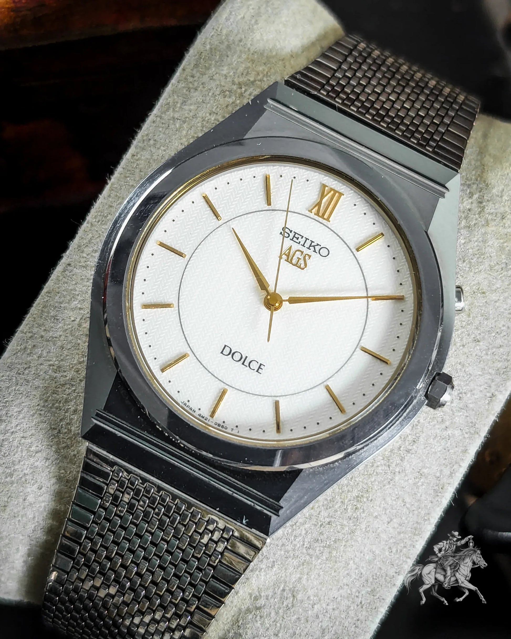 A Unique Seiko Dolce AGS 4M21-0E90 from 1996 JDM, this timepiece is a perfect blend of classic elegance and cutting-edge technology. It features a sophisticated Honeycomb Dial and a case made of durable Tungsten Carbide and stainless steel.