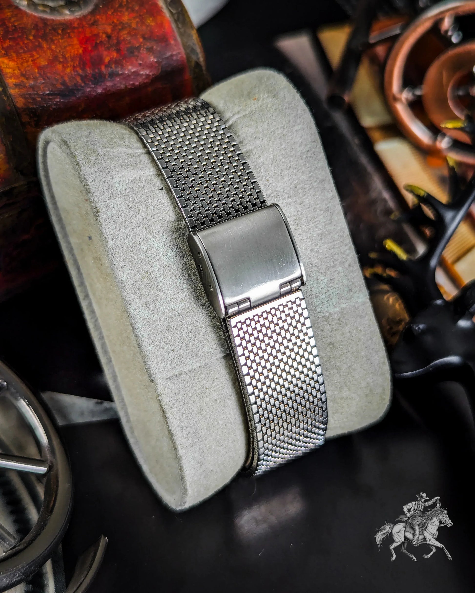 The classic white dial is adorned with gold toned Roman numerals at the twelve and six o'clock positions, with a clean layout of stick markers and hands. Its angular stainless steel case is both robust and stylish, and is complemented by a sleek stainless steel mesh bracelet, creating a distinguished appearance on the wrist.