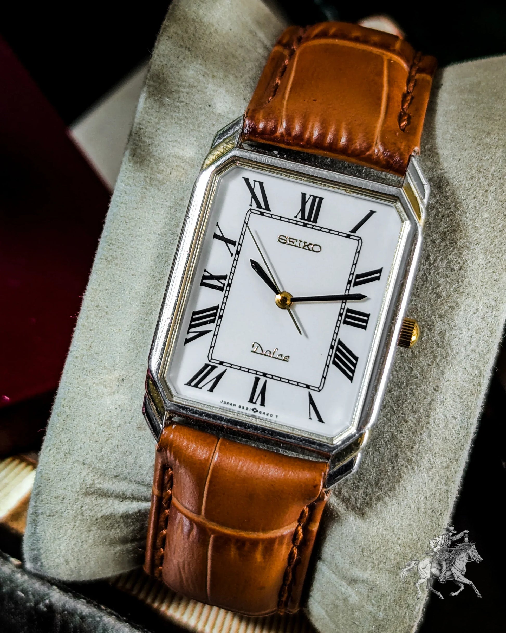 This is a fantastic find that brings together classic style and modern engineering. This Seiko Dolce 5S21-5A10 is a superb example of a high-end dress watch from the late 1980s JDM era. With its sophisticated "Tank" case and a timeless white dial adorned with classic Roman numerals, it has an elegant and refined presence on the wrist. This watch is a true testament to Seiko's commitment to precision and design.