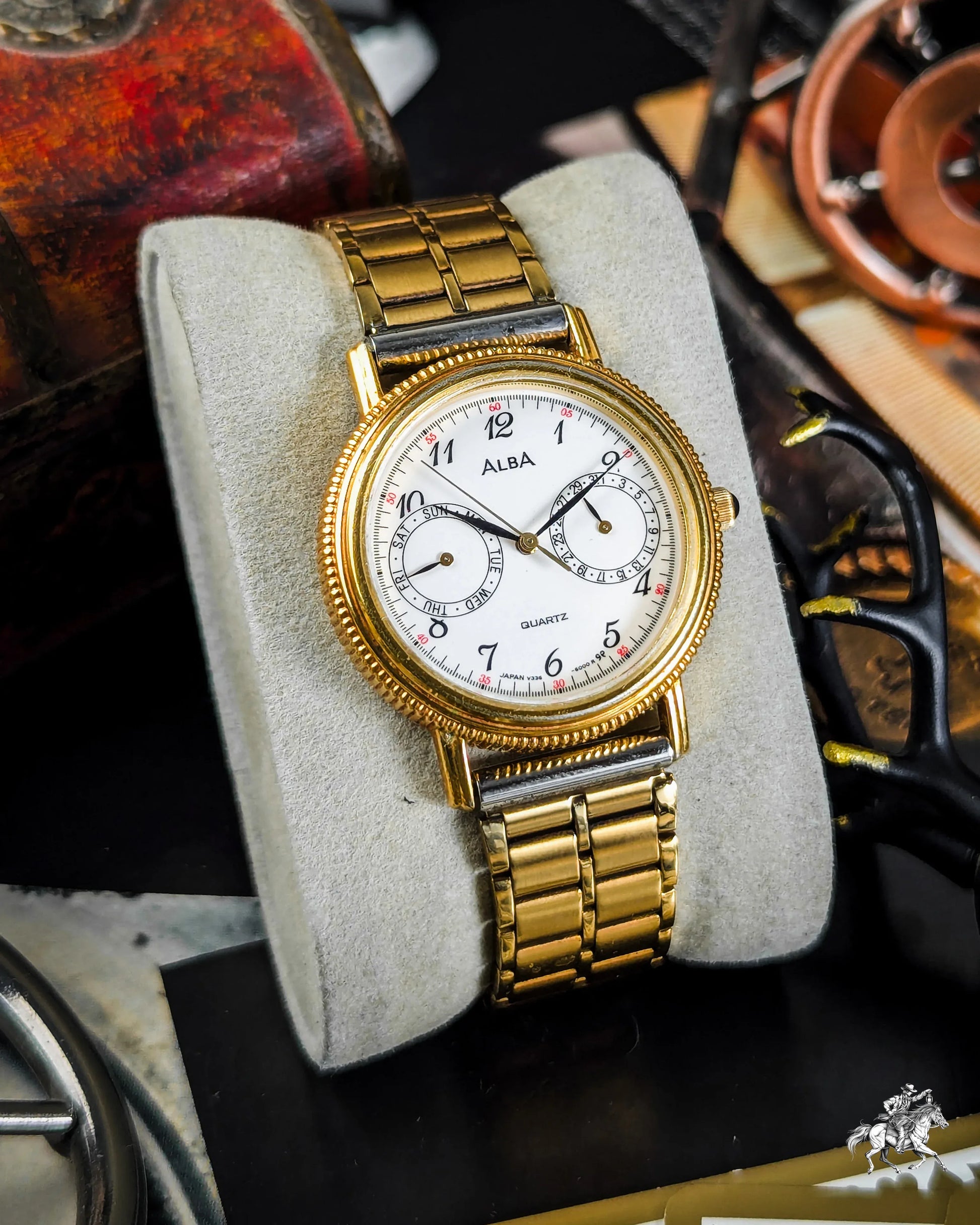 A sophisticated Alba Quartz V336-6000 from 1987 JDM, this timepiece offers a rich and elegant design. It features a distinguished gold-toned case and a multi subdial layout that provides both style and functionality.