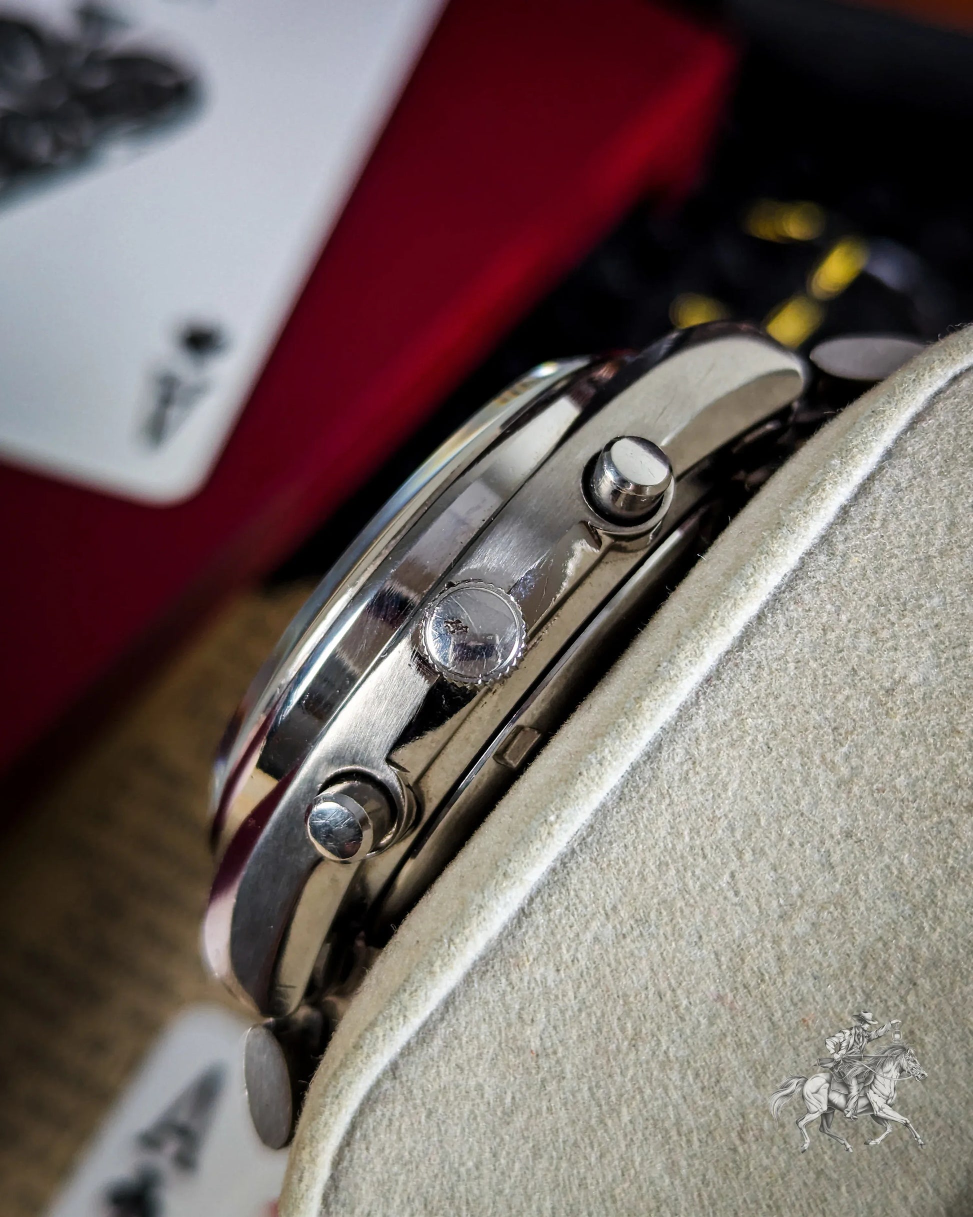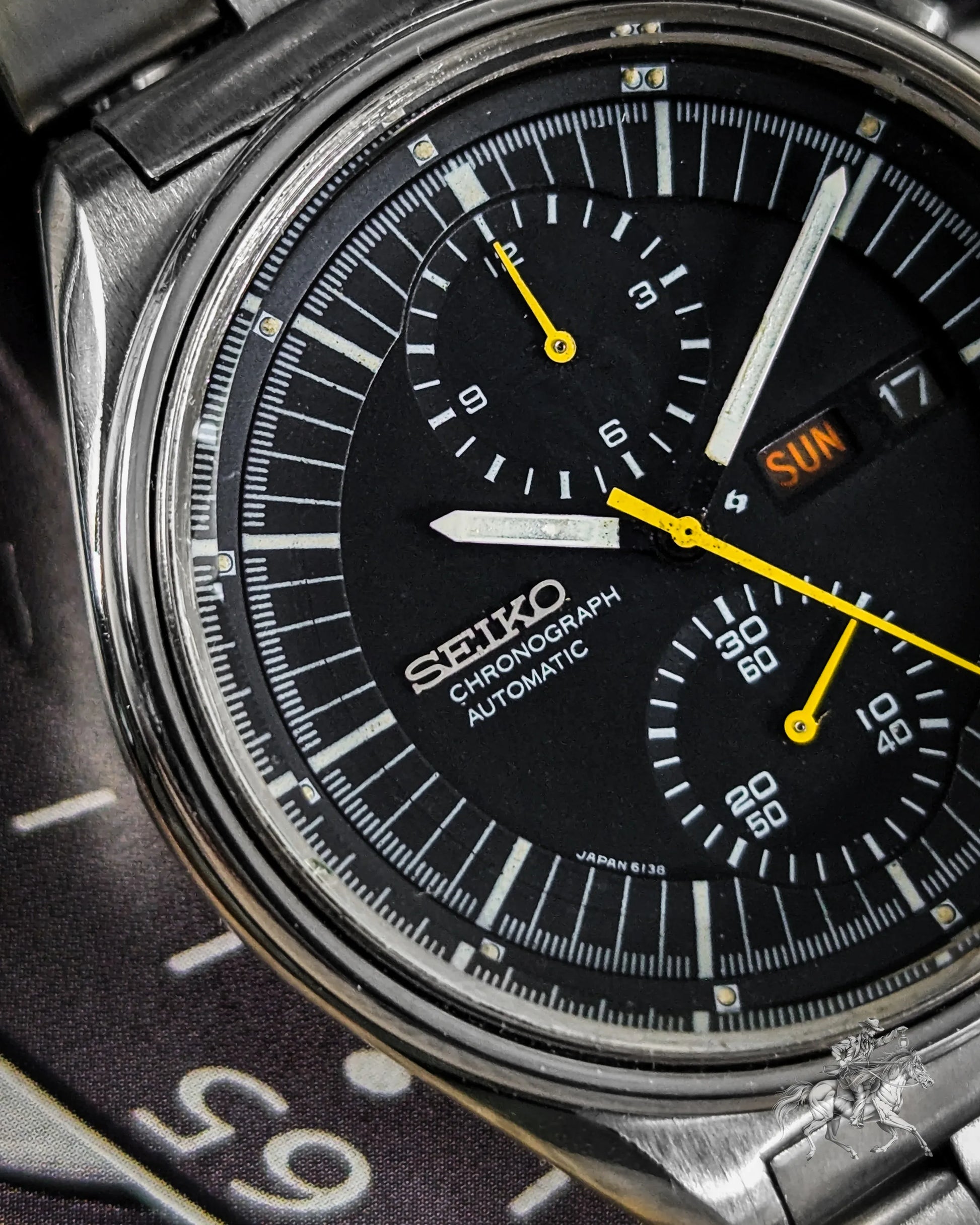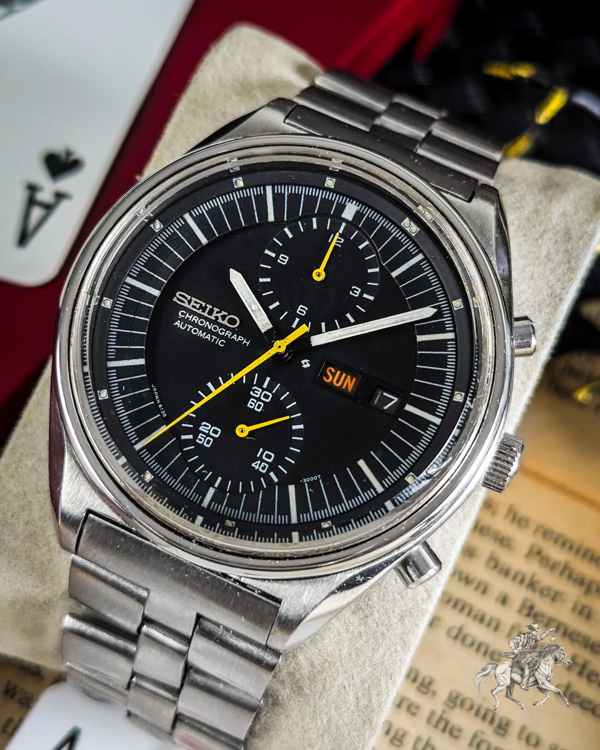 A robust and highly sought-after Seiko Jumbo Chronograph 6138-3002 from 1977 JDM, this timepiece is a true icon among vintage chronographs. It features a bold black dial with contrasting sub dials, giving it a distinctive and purposeful look.