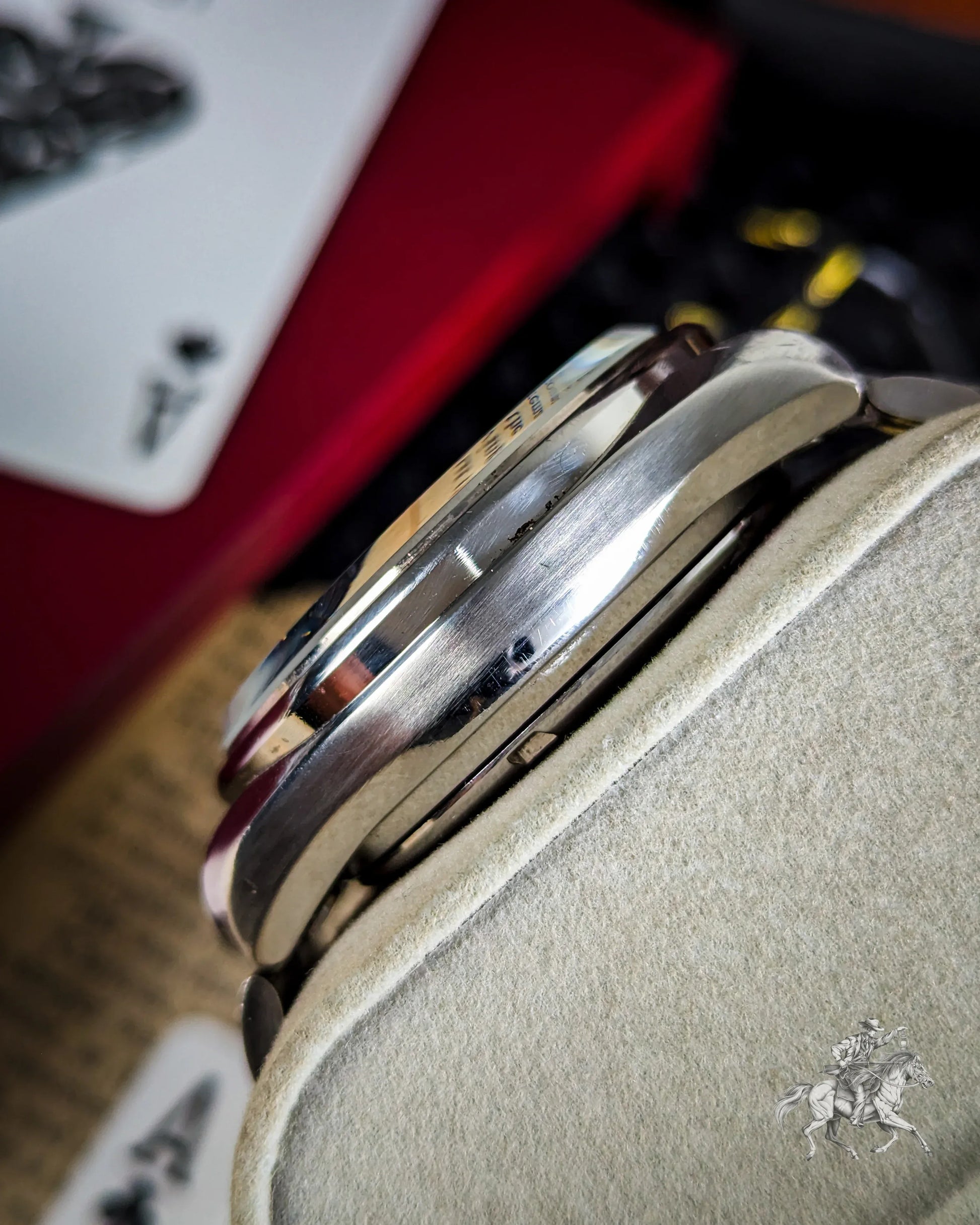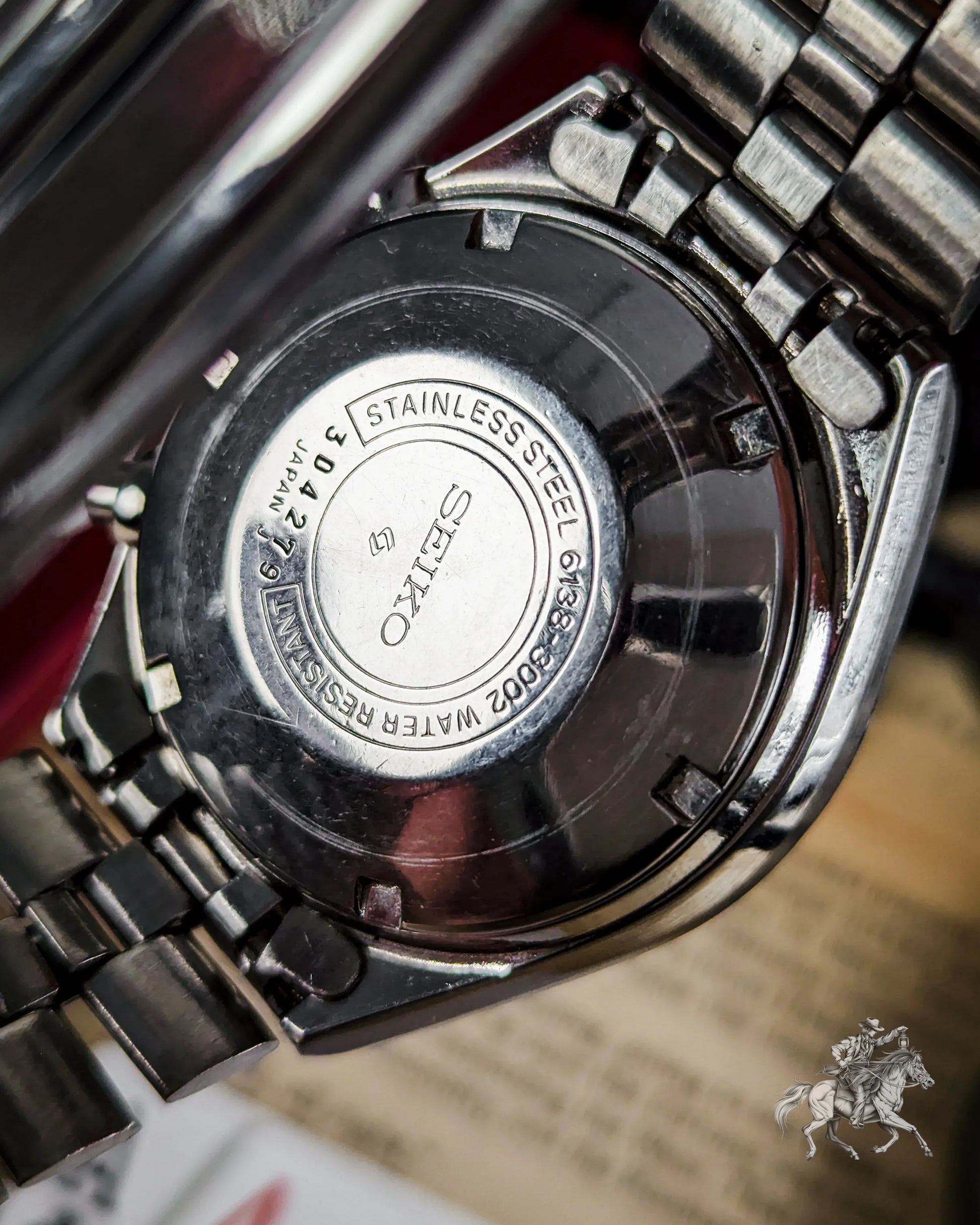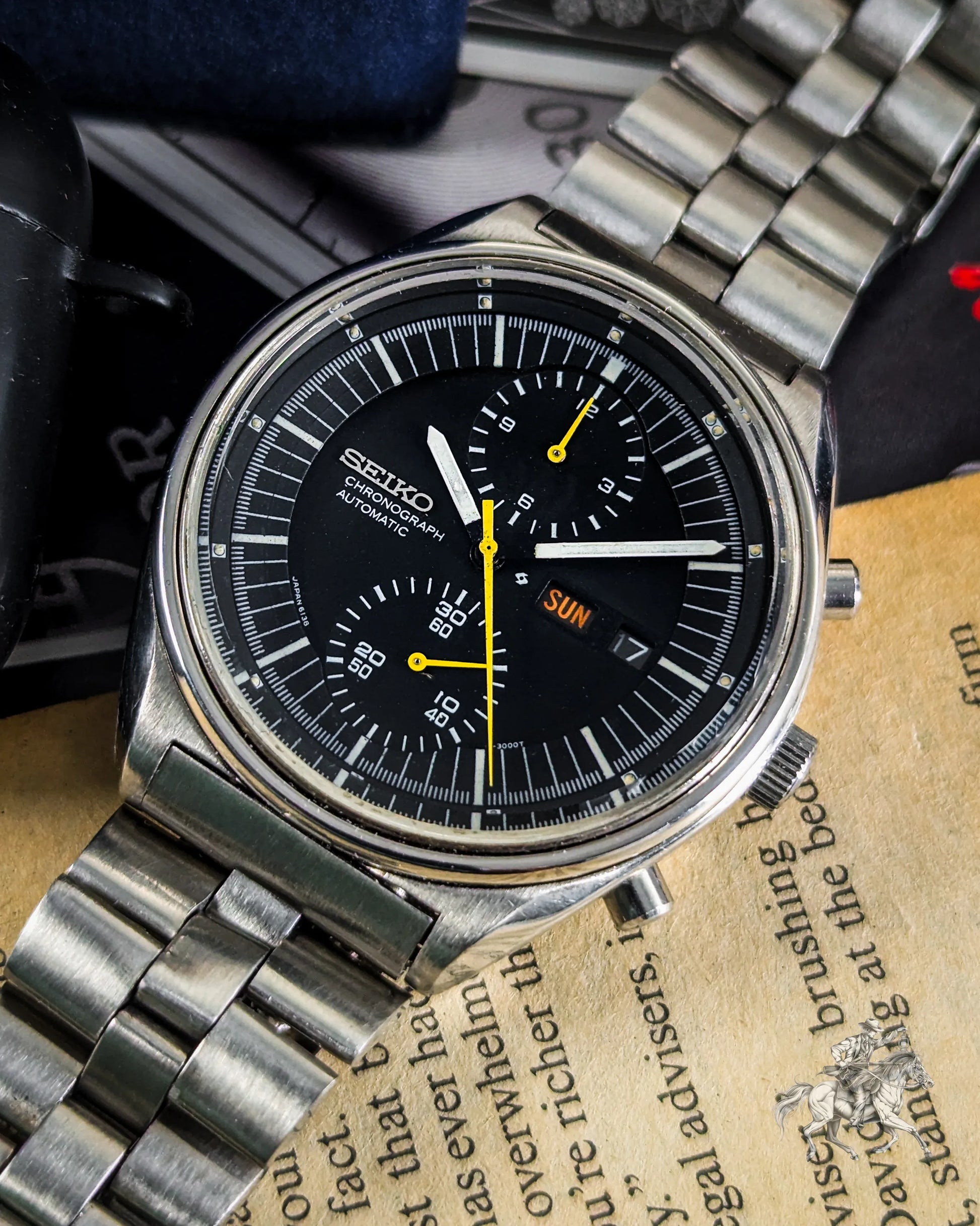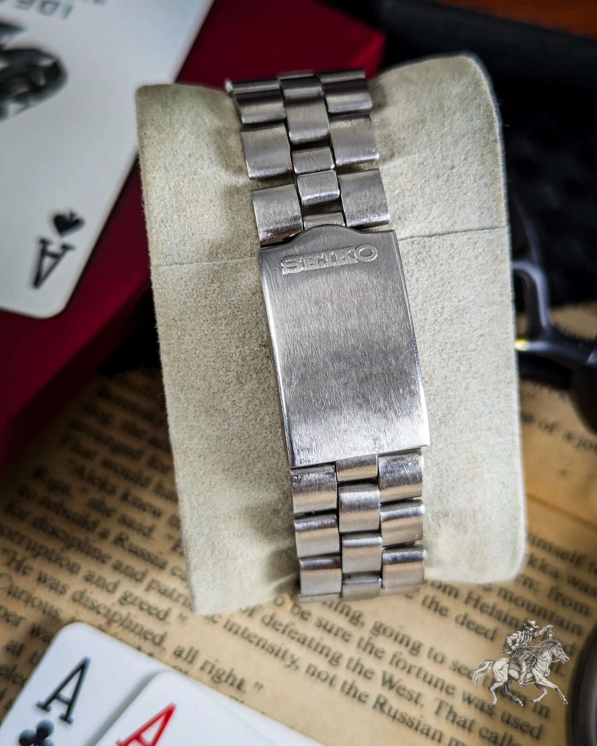 A robust and highly sought-after Seiko Jumbo Chronograph 6138-3002 from 1977 JDM, this timepiece is a true icon among vintage chronographs. It features a bold black dial with contrasting sub dials, giving it a distinctive and purposeful look.