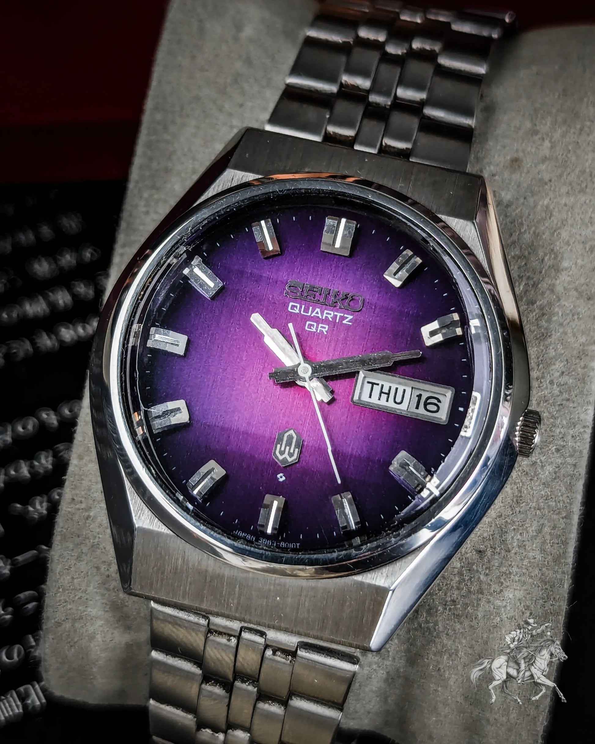 This is one of those pieces that will make any serious vintage Seiko collector do a double-take. This Seiko Quartz QR 3863-8010 is an incredibly rare find from 1974, and it's a front-row ticket to the Quartz Revolution. What makes this watch so special is that vibrant and lovely original violet dial, a color that you almost never see in this reference. It’s in fantastic, well-preserved condition and truly looks like a piece of living history.