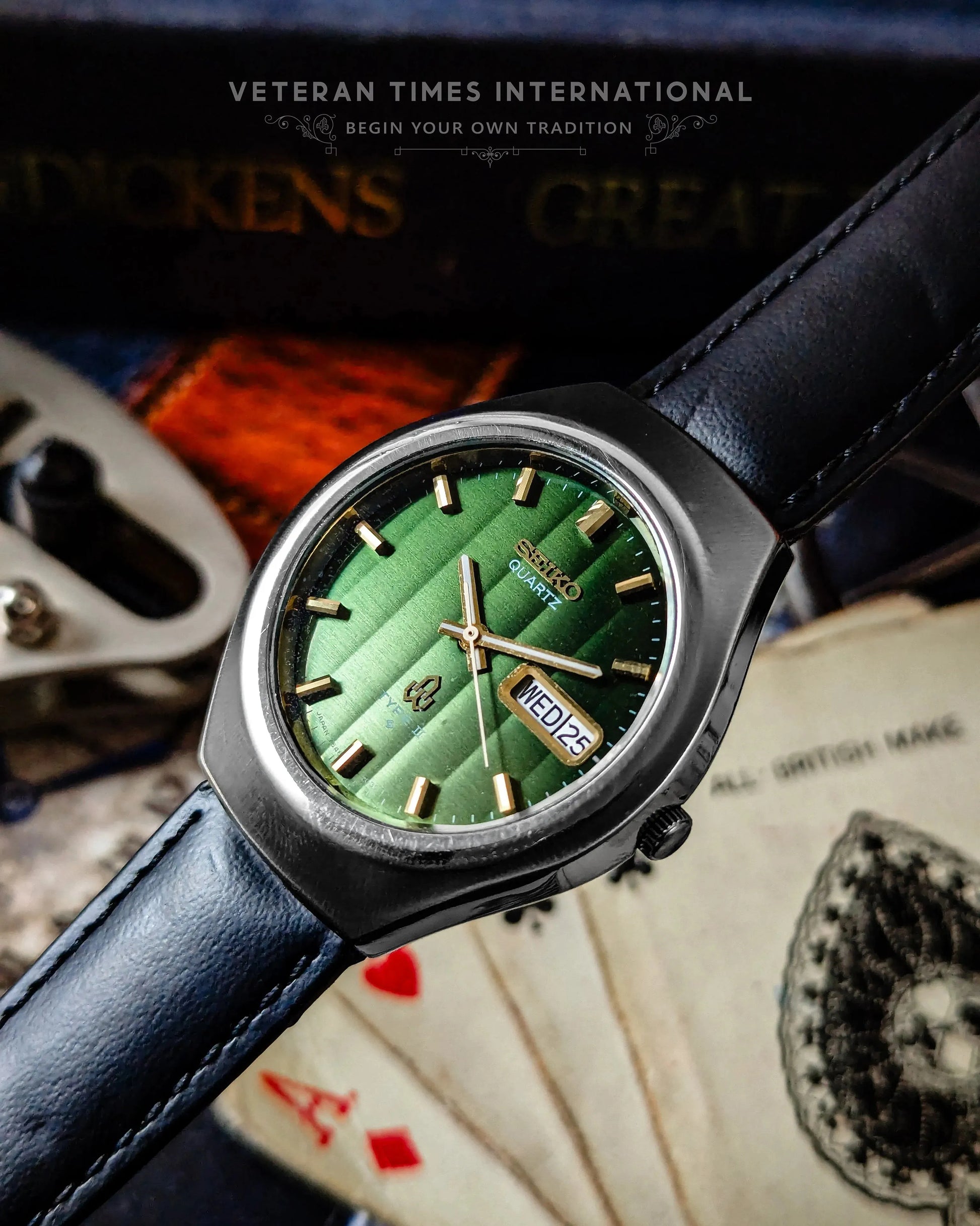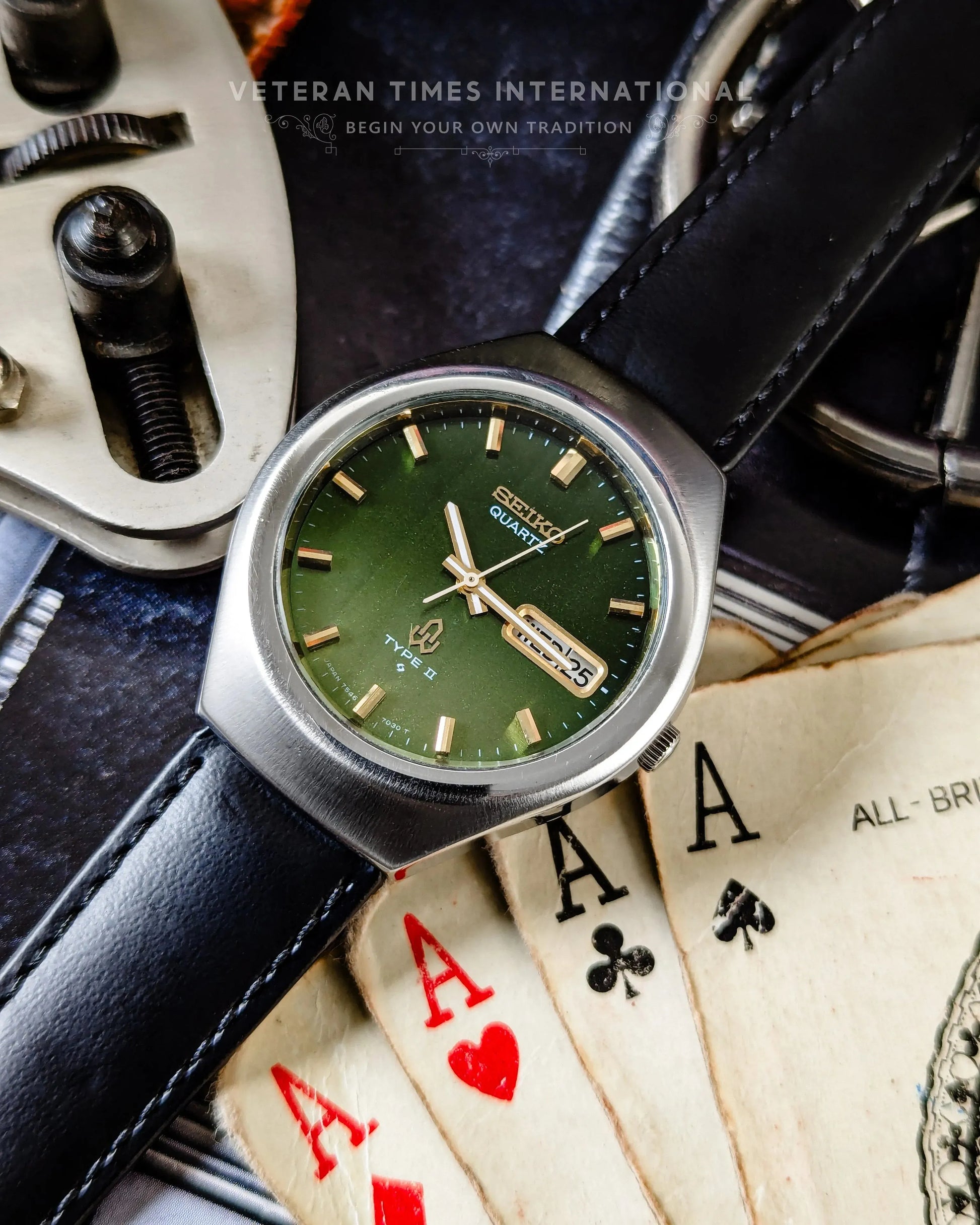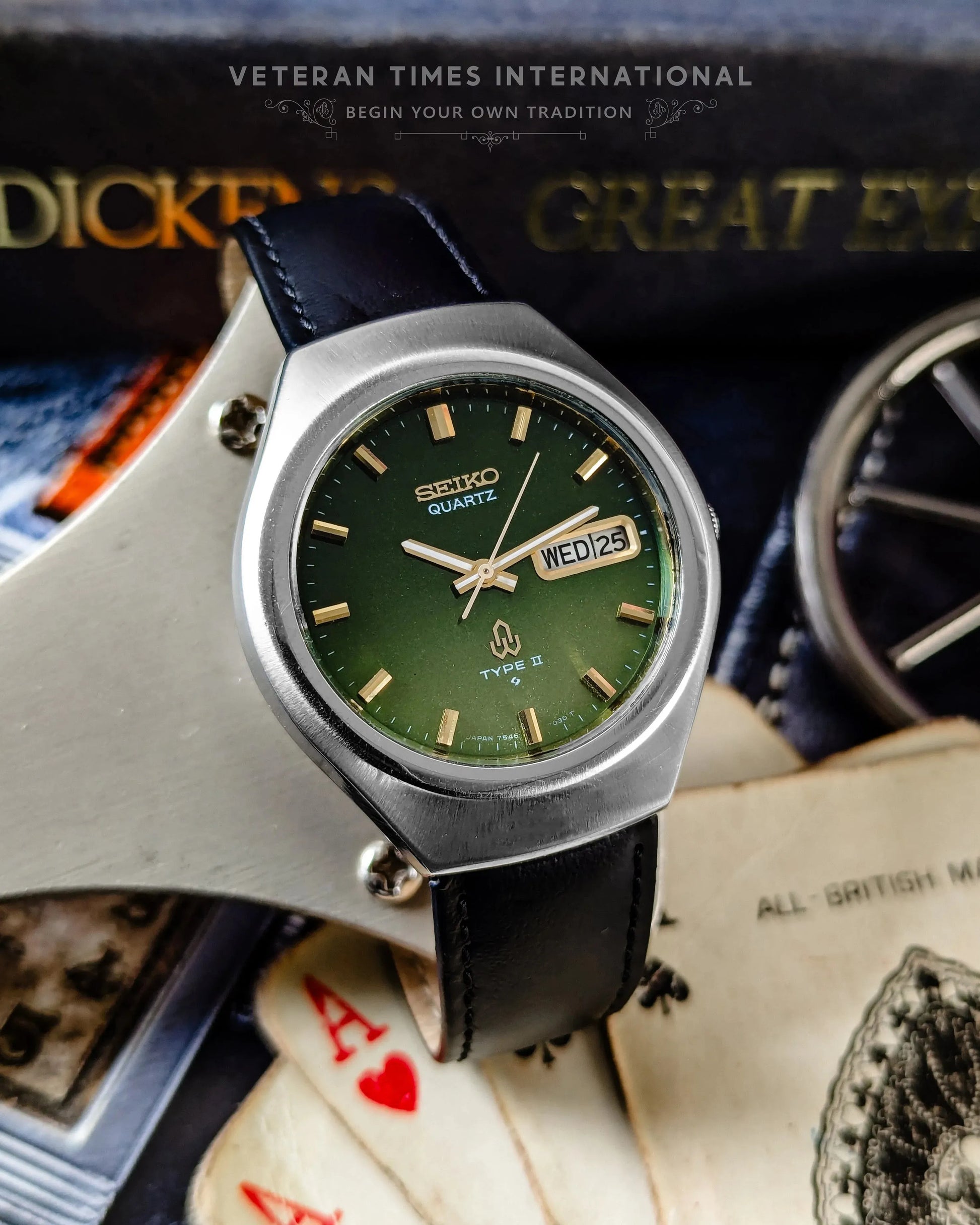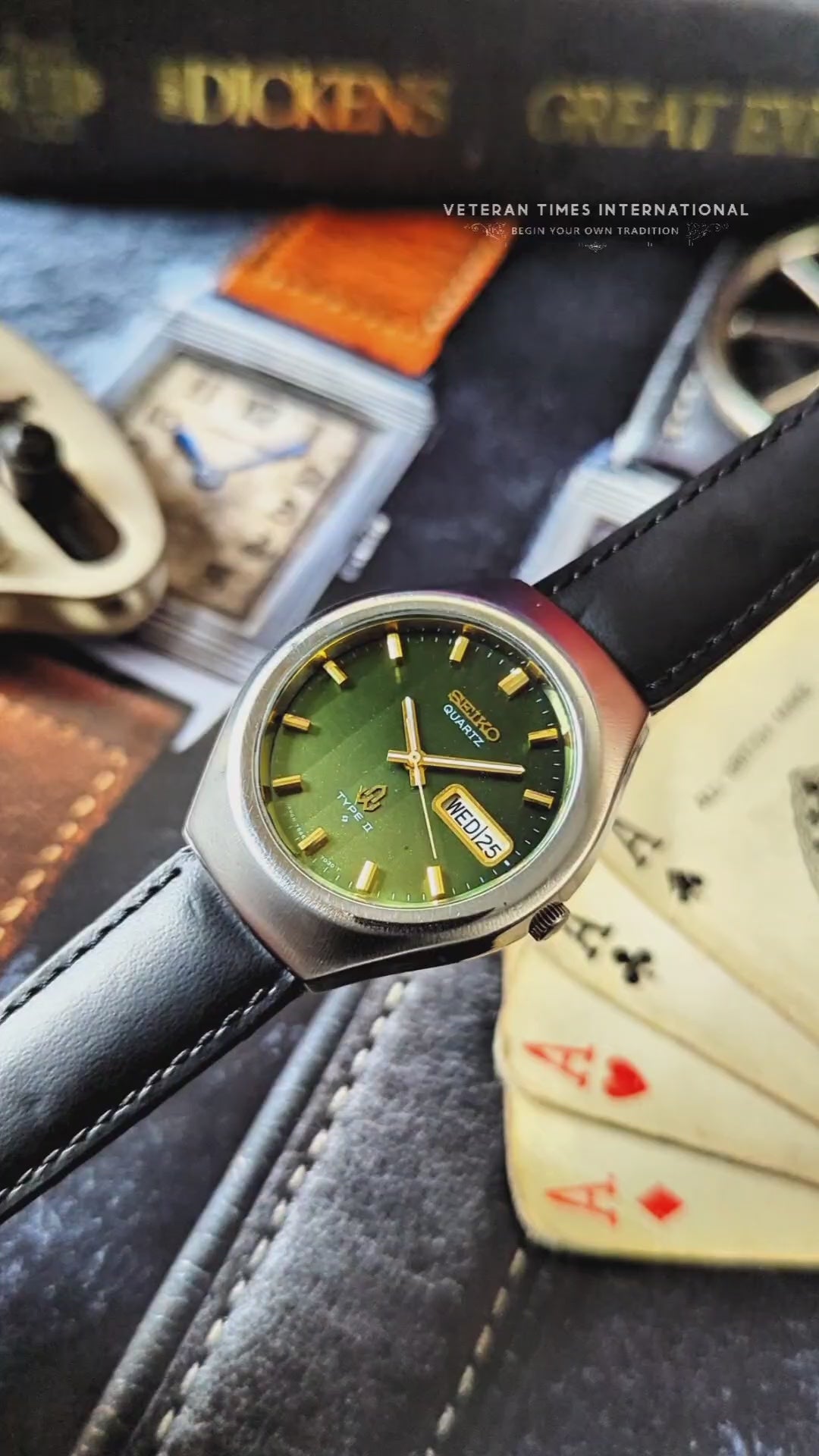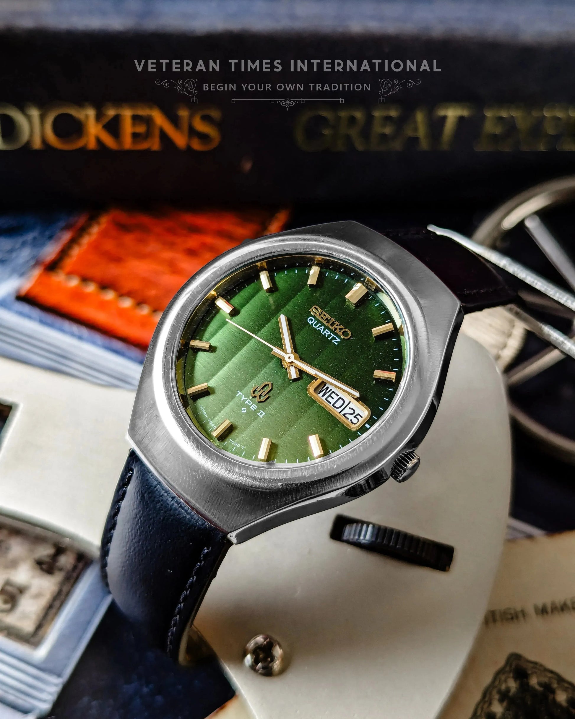 Seiko Quartz Type 2 - a classic masterpiece that combines precision and style. The gradient green dial of the Seiko Quartz Type 2 serves as a sophisticated backdrop for the Sword hands and stick indices. The elegant design offers a clear, uncluttered display, allowing you to read the time with ease.