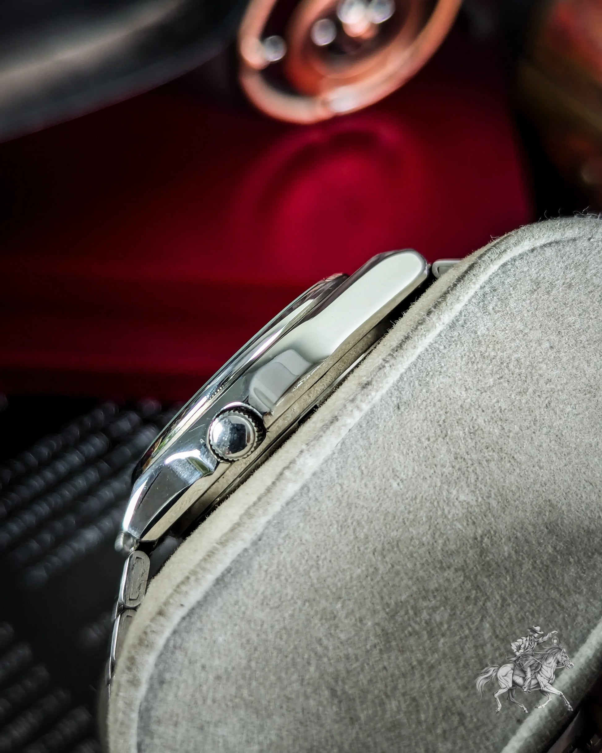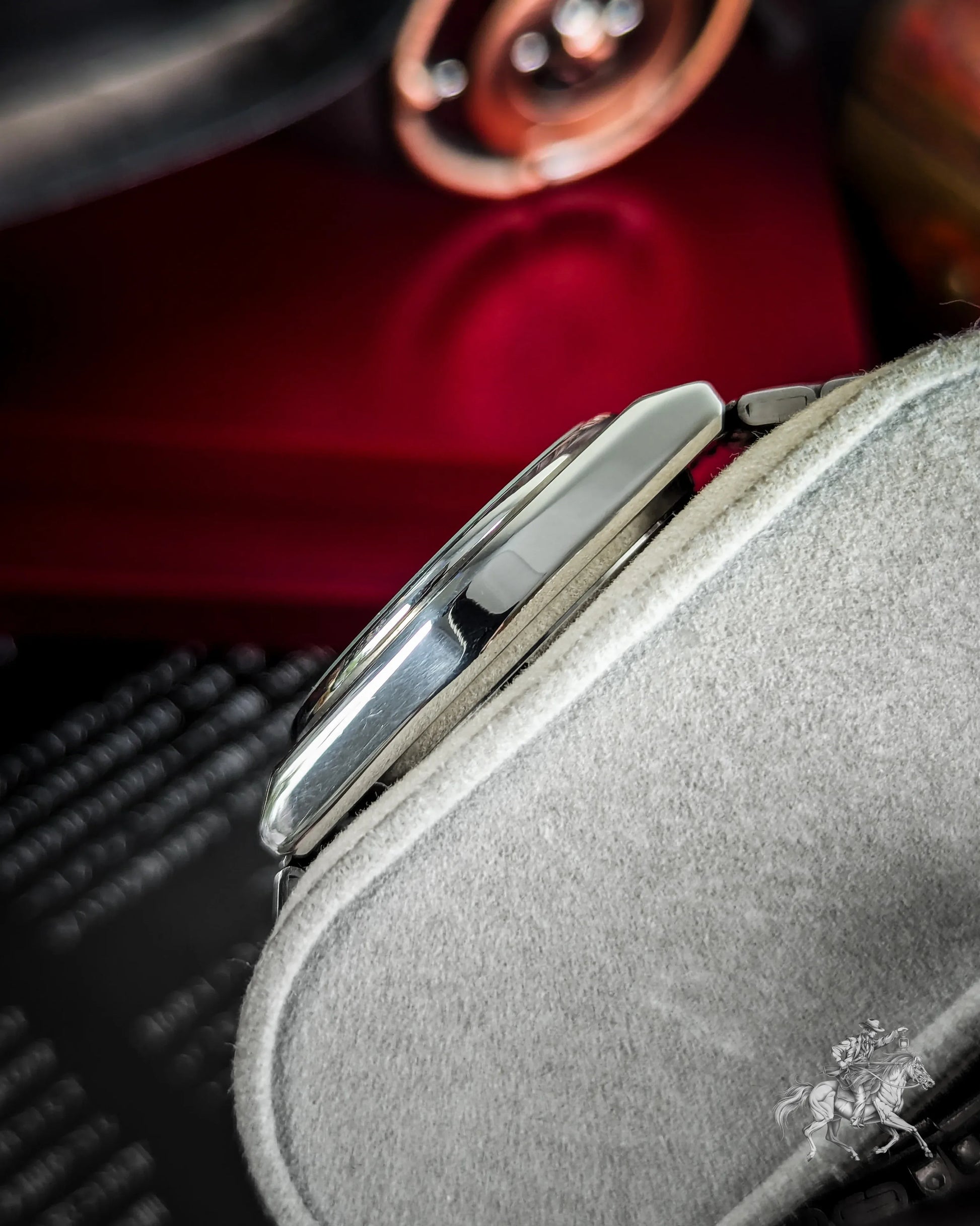 The white dial is adorned with applied stick hour markers and hands. A practical Day and Date window at the three o'clock position provides useful functionality. The angular stainless steel case and an integrated jubilee style bracelet create a cohesive and elegant aesthetic. The caseback is engraved with a distinctive symbol, a unique touch for this model.