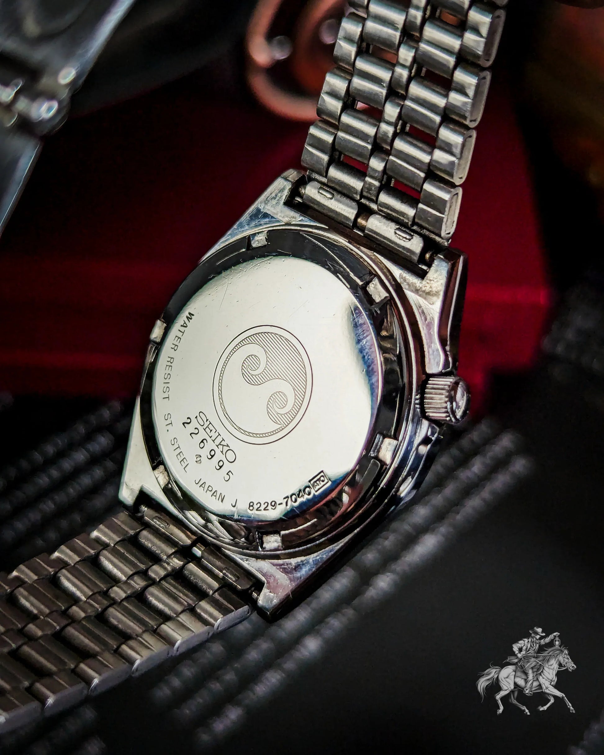 A classic Seiko SilverWave 8229-7040 from the 1980s JDM, this timepiece is a prime example of Seiko's early water resistant quartz watches. It features a sophisticated White Dial and a robust stainless steel case.