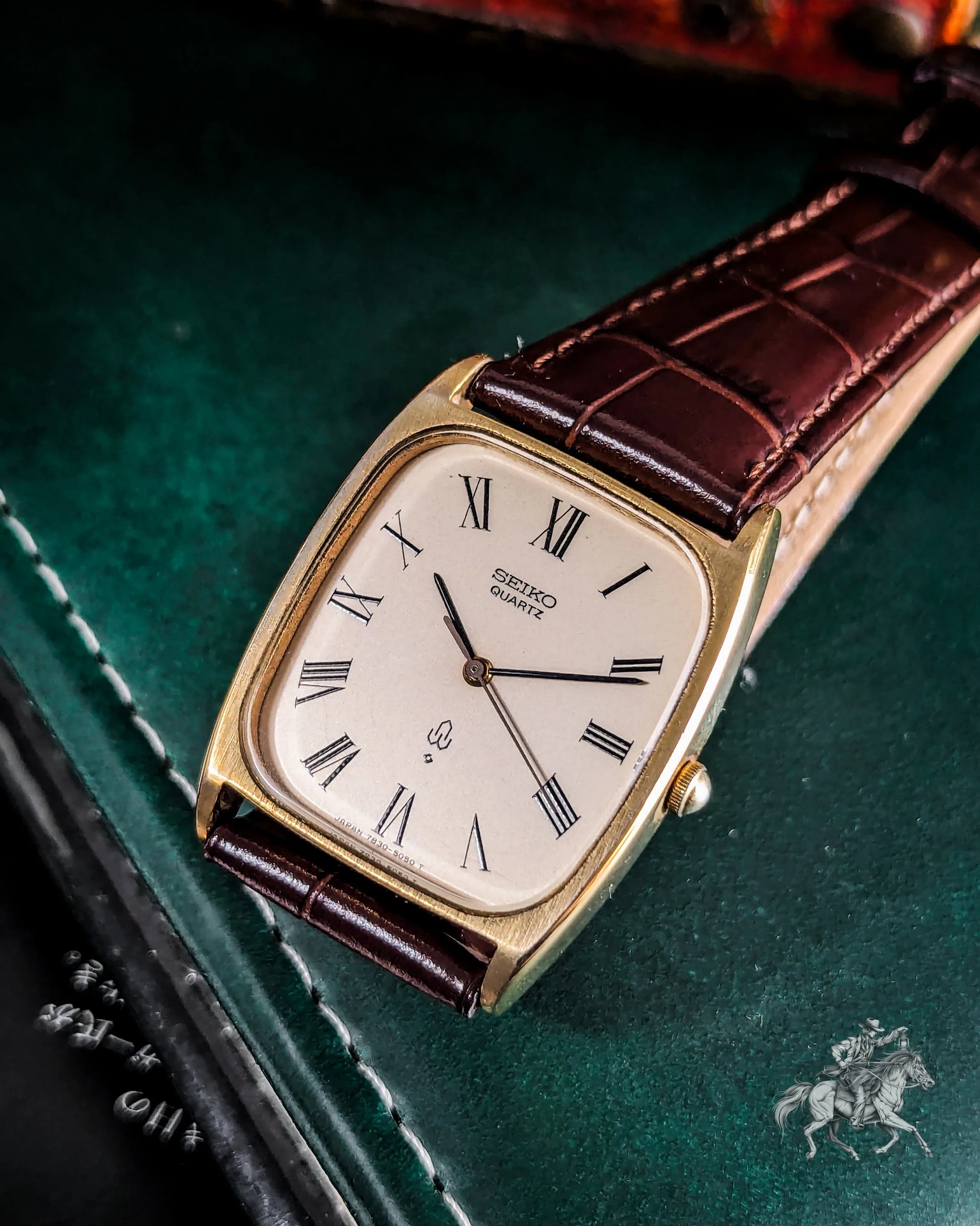 This is a fantastic find that proves classic style is always in fashion. This Seiko Quartz Tank is a beautiful example of minimalist, high-quality design from the 1980s JDM era. With its sophisticated cream dial adorned with timeless Roman numerals, and a polished, gold-toned tank case, it’s a watch that is both elegant and understated. It truly captures a moment in time when Seiko was a leader in quartz perfection.