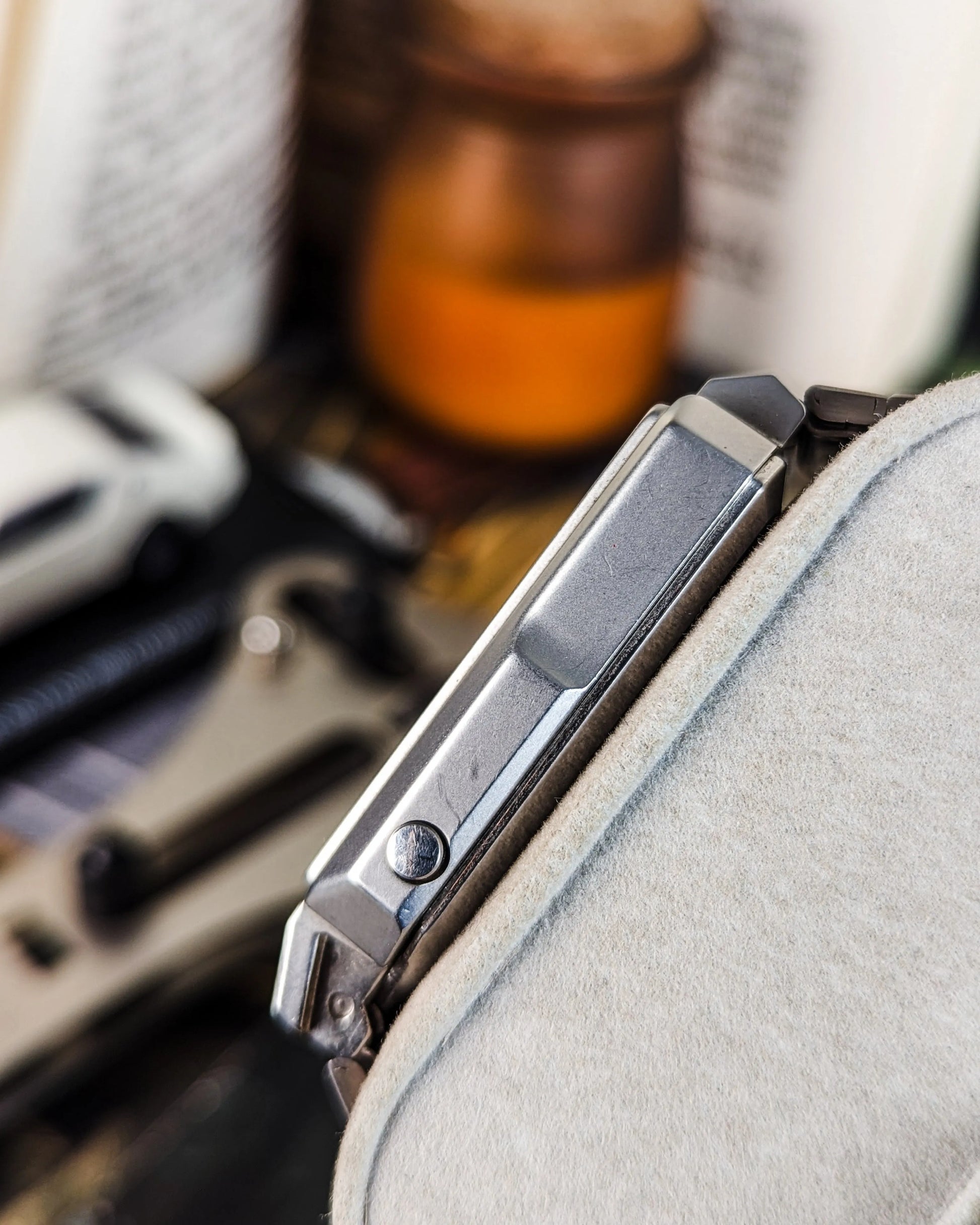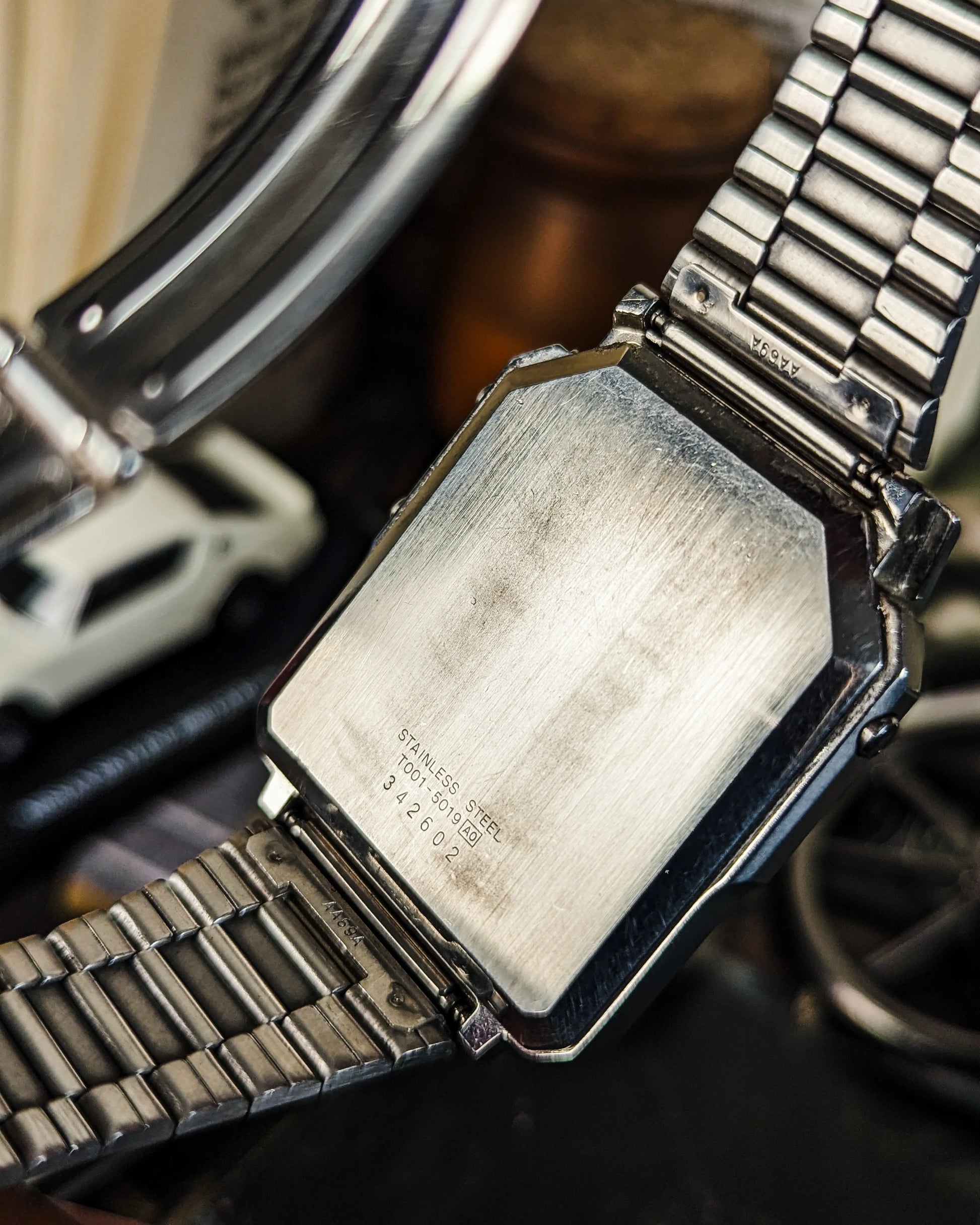 This Ultra-rare vintage Seiko "TV Watch," model number T001-5019 AO, is a fascinating piece of horological history from the 1980s. Often referred to as a "TV Watch" due to its rectangular case shape reminiscent of early televisions, this digital timepiece is a sought-after collectible. The watch features a digital display showing the time, day, and date, and offers functionalities such as a chronograph/stopwatch and alarm.