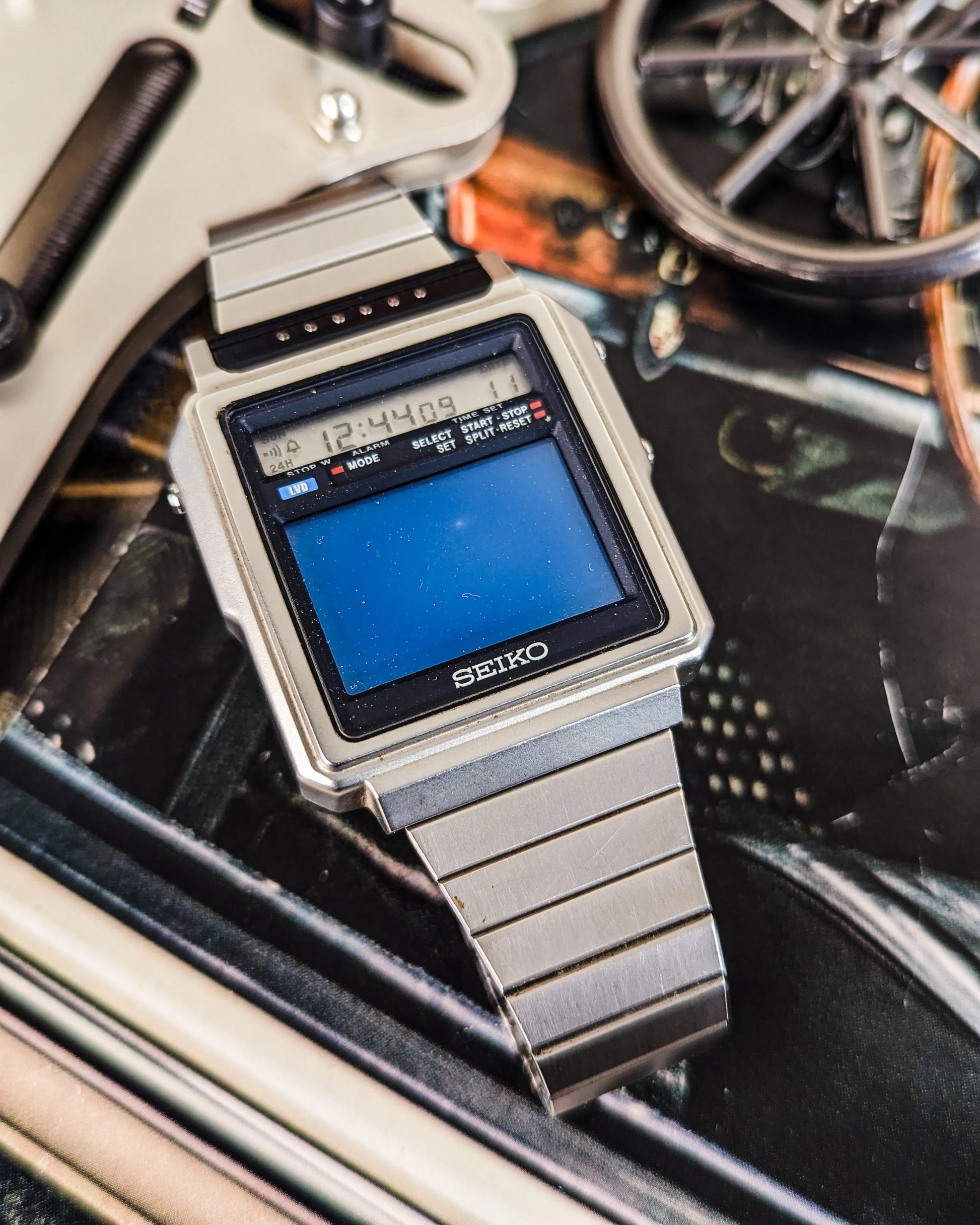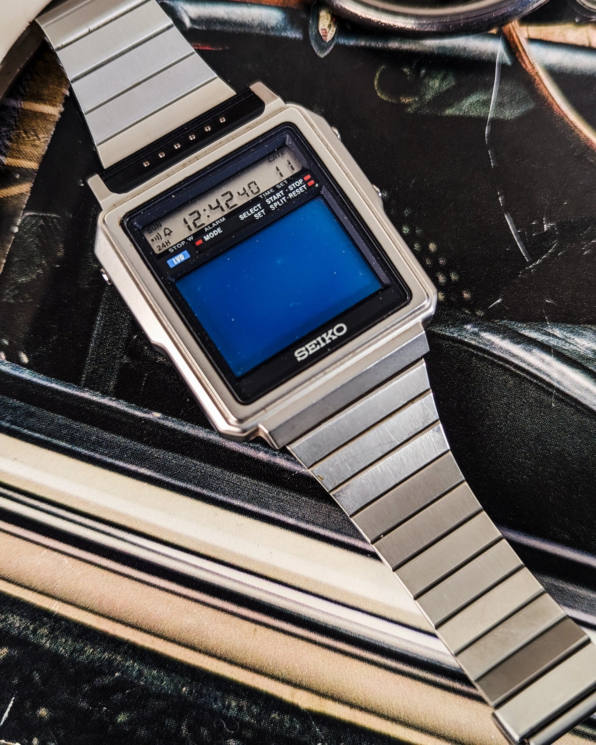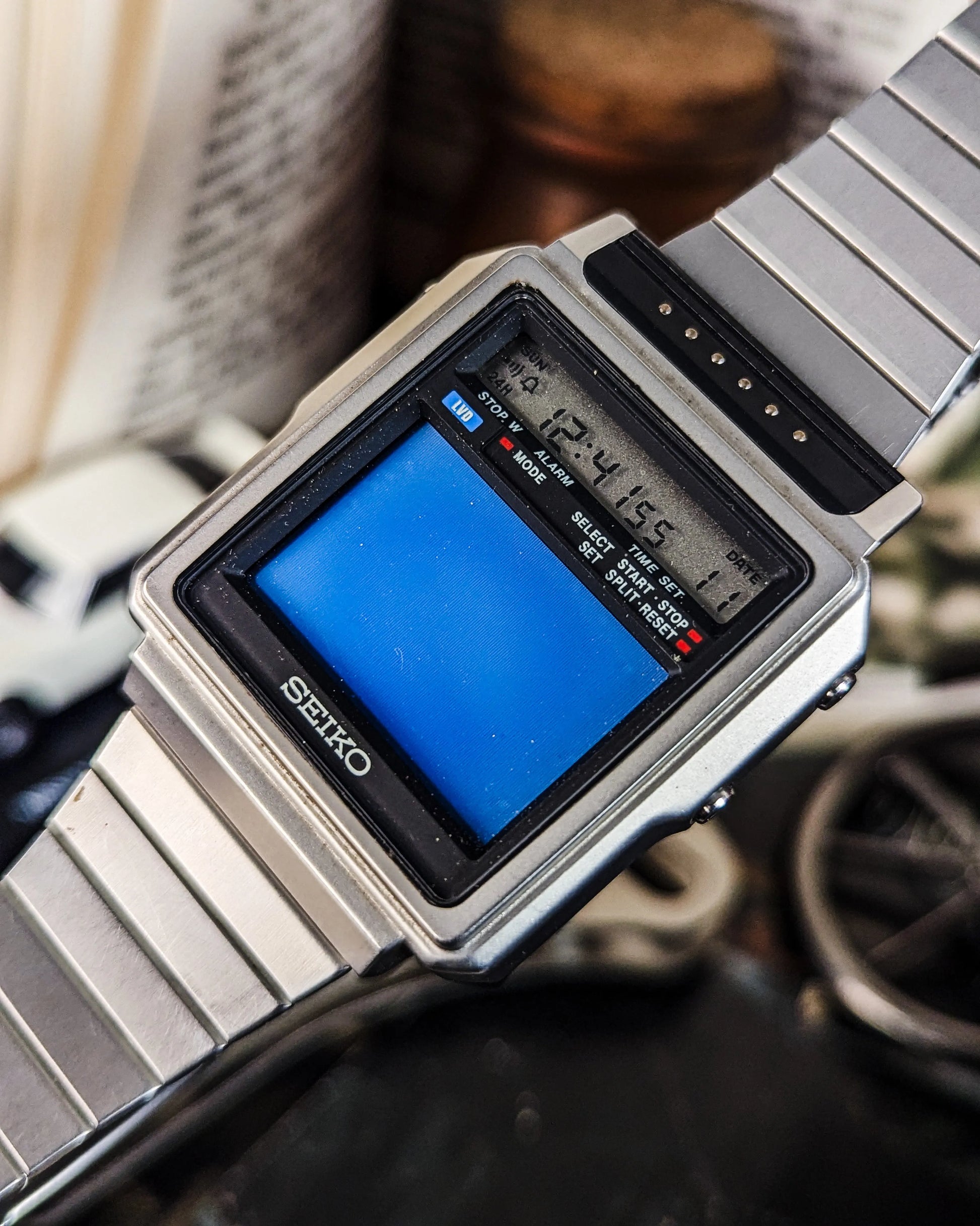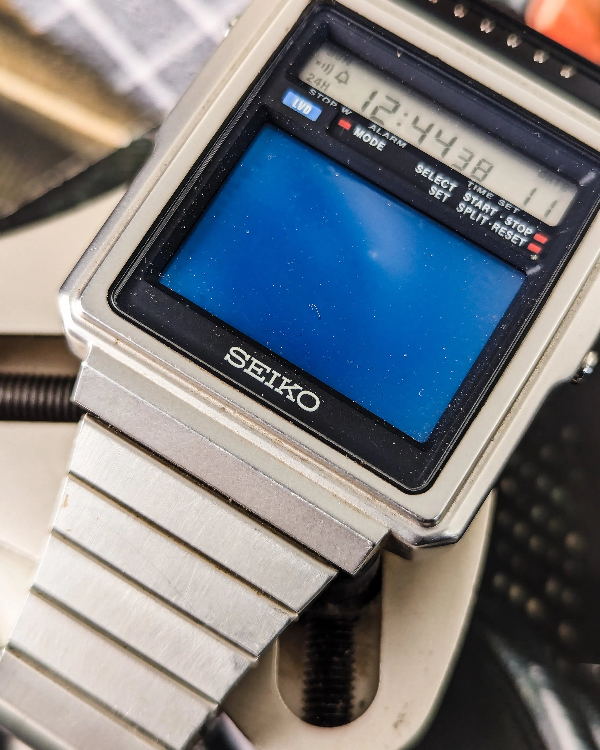 This pre-owned Seiko "TV Watch" is in excellent condition for its age, showing only slight surface scratches or wear. It keeps excellent time and is a testament to the early days of digital watch technology and Seiko's innovative spirit.
