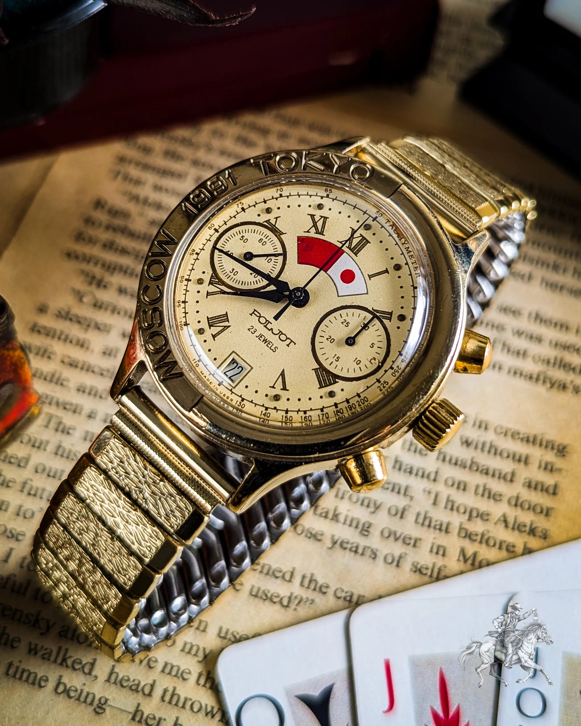 This is a rare and historically significant Vintage Poljot Chronometer 3133, a 23-jewel mechanical chronograph from the 1991 USSR. This exceptional timepiece represents a unique Moscow-Tokyo collaboration, making it a highly sought-after collector's item.