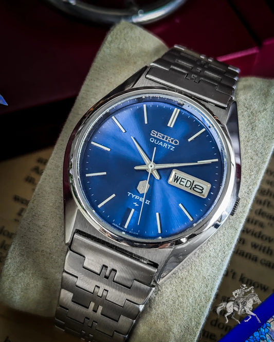 Seiko Type 2 - 0903-8110Vendor:Grammar of Design Case - Blue Sunburst Dial - Kanji Day/Date - 1976 JDMRegular price $345.00 AUDRegular priceUnit price / per$475.00 AUDSale price $345.00 AUDSale