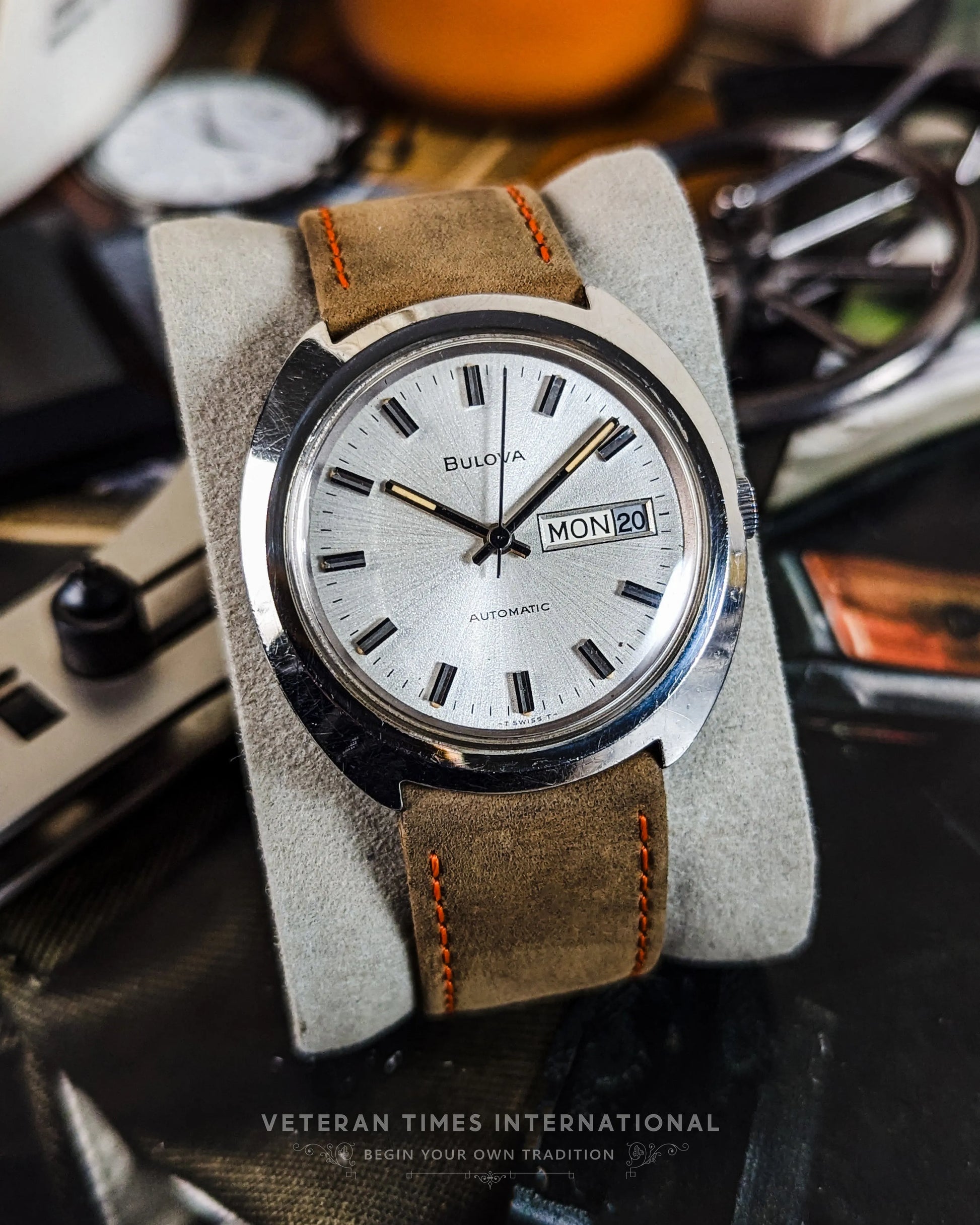 The stainless steel case is paired with a stainless steel one-piece strap, complementing the watch's overall design and offering durability. A 23-jewel automatic movement powers the watch, combining convenience with traditional watchmaking. This Swiss-made Bulova watch is a testament to Bulova's reputation for producing sophisticated and reliable timepieces during the 1970s. The 20mm lug width and matching strap enhance the watch's balanced proportions.
