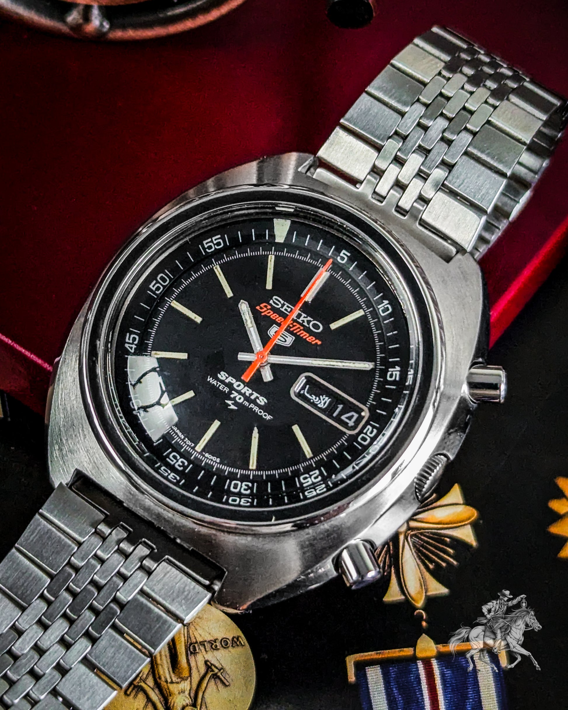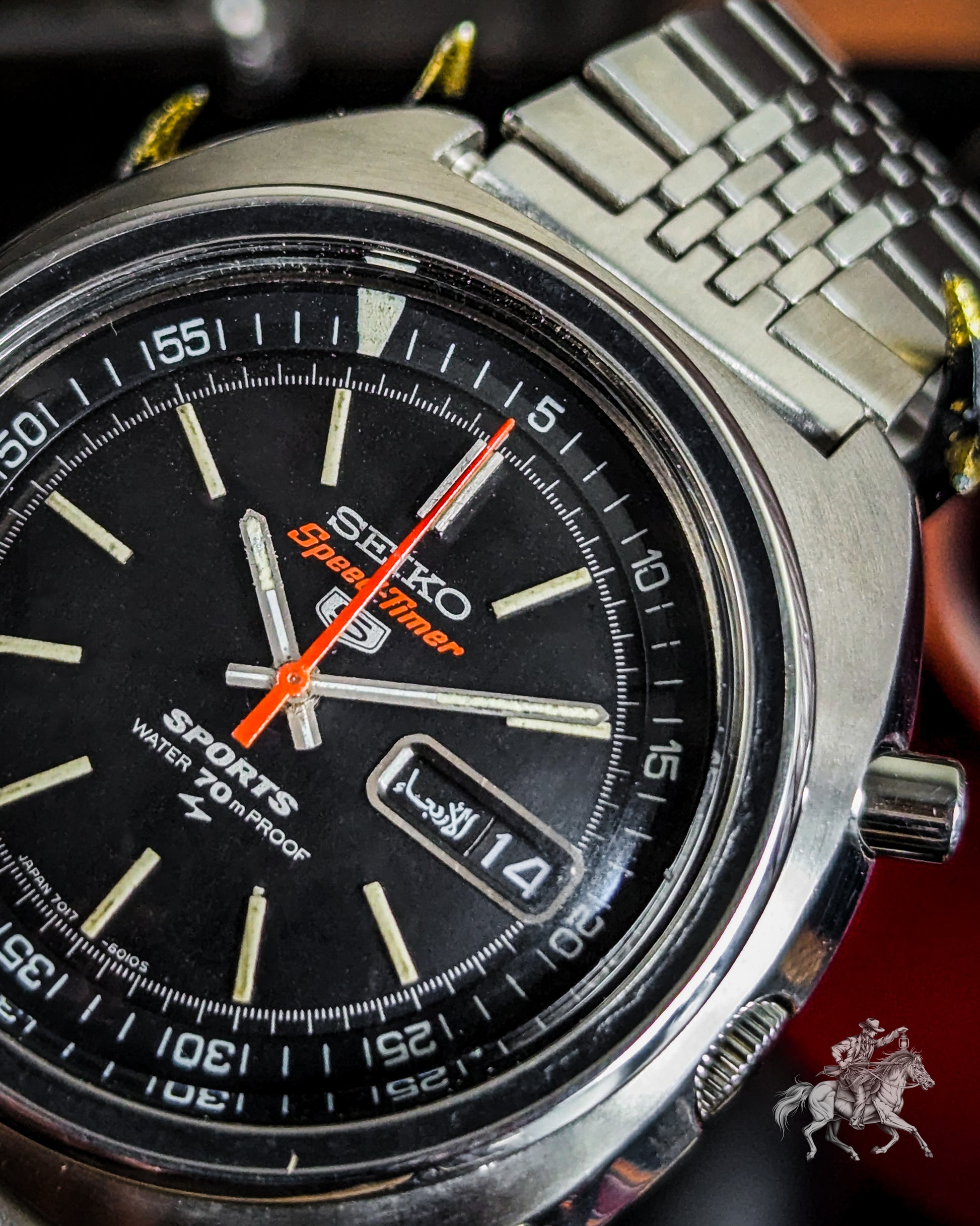 What makes this watch a true collector's piece is its flyback chronograph function, a high-end complication that lets you instantly reset and restart the timer with a single push. This is all thanks to the brilliant 21-jewel Caliber 7017 automatic movement, a testament to Seiko's engineering mastery. The robust cushion-style stainless steel case is in excellent vintage condition, and the integrated bracelet gives it a strong, cohesive presence. The Arabic day wheel is a cool detail that confirms its JDM roots.