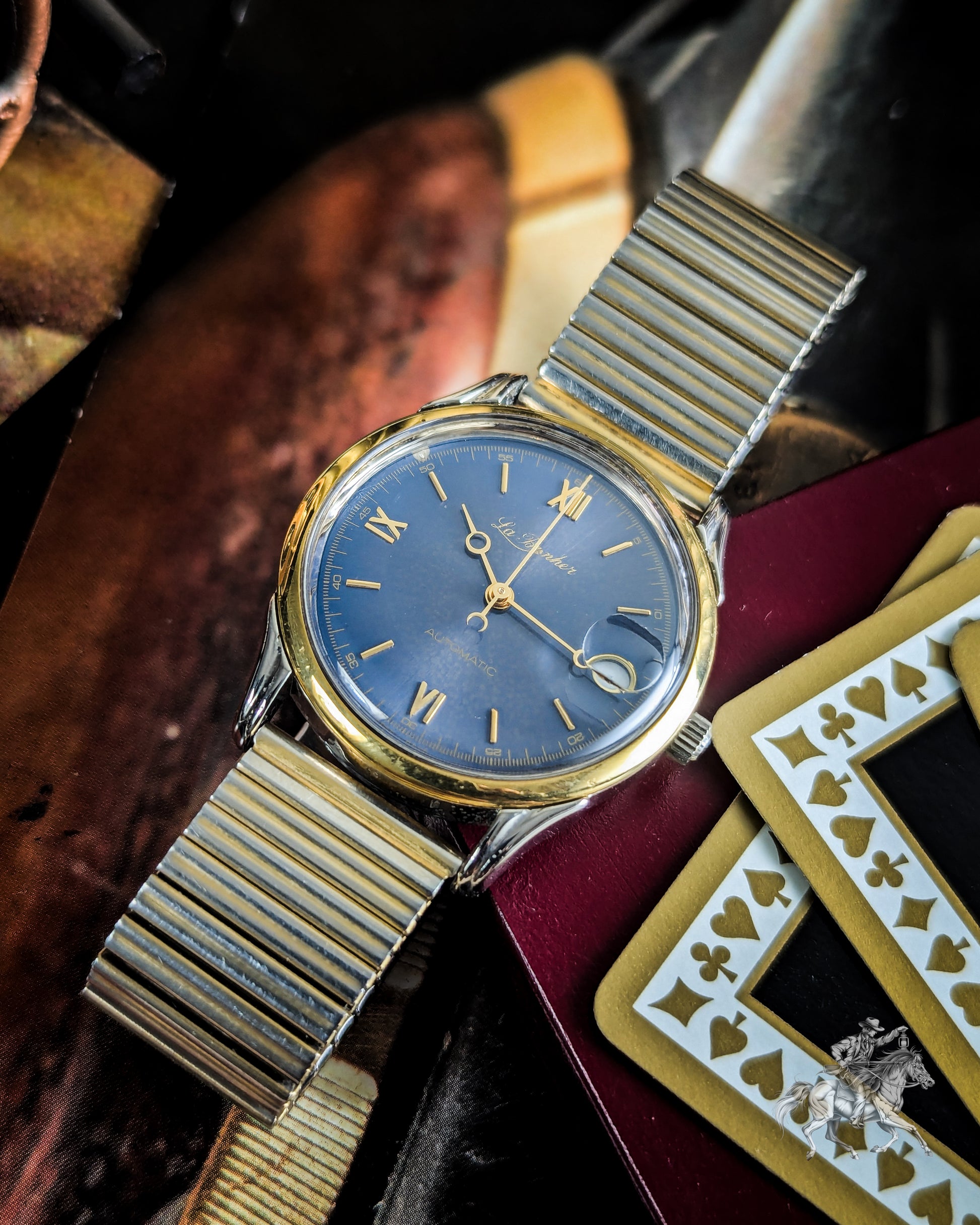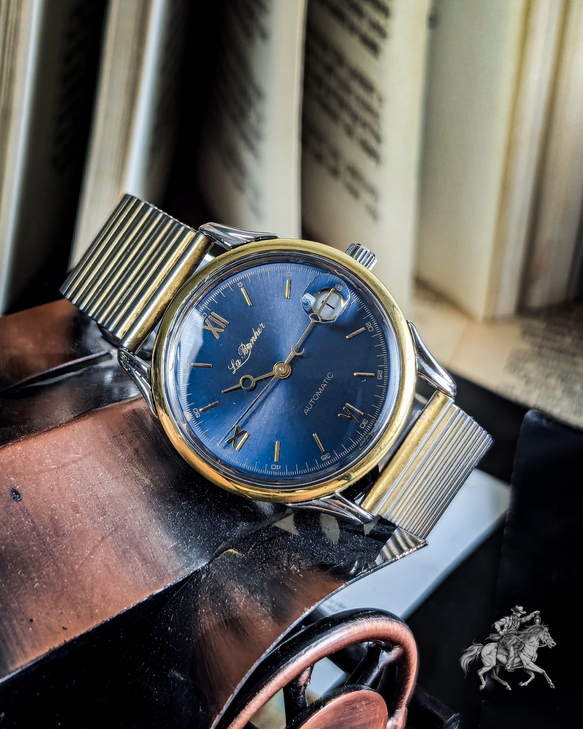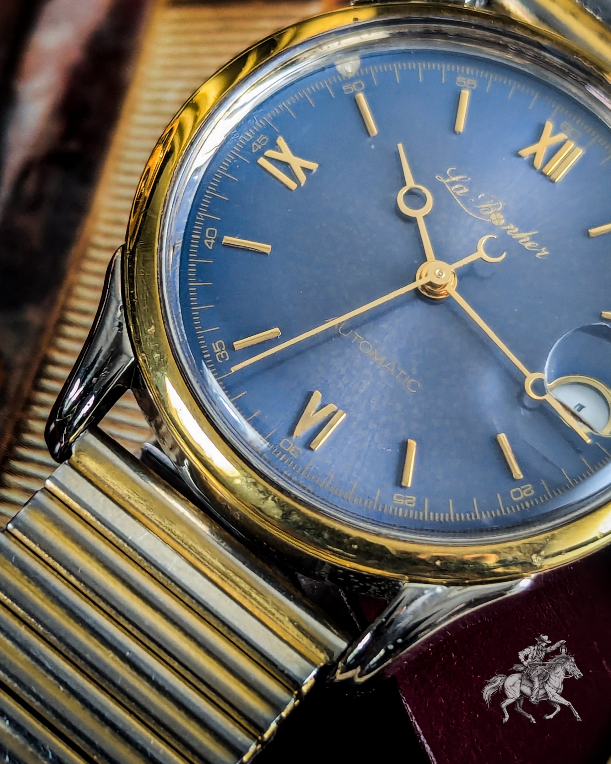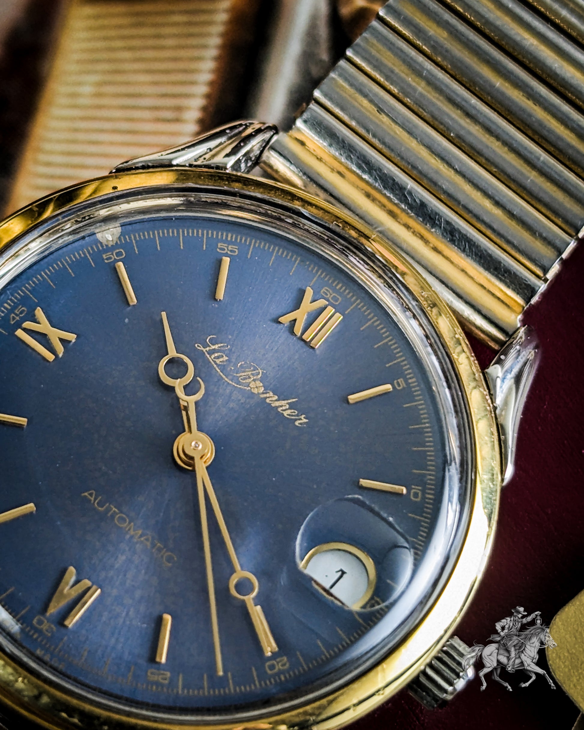 This elegant timepiece is a magnificent piece of Swiss mechanical tradition, representing the post-war era when automatic movements became accessible and refined. The La Bonher Automatic features a stunning deep blue sunburst dial framed by a polished gold-plated bezel and Roman numeral markers at 6 and 12 o'clock, which creates a classic- high-contrast look. The watch's core selling point is the mechanical heart- a reliable 25-Jewel Automatic Movement (likely a high-grade ETA or AS ébauche common in Swiss watches of the 1950s). The higher jewel count was a major marketing point in its day, signifying reduced friction and enhanced longevity. The dial is protected by a domed crystal, which adds a wonderful vintage depth, and the gold-plated case with elegant downturned lugs completes the refined profile. This is a wonderfully unique and sophisticated piece for the collector seeking mechanical quality and beautiful mid-century design outside of the major houses.