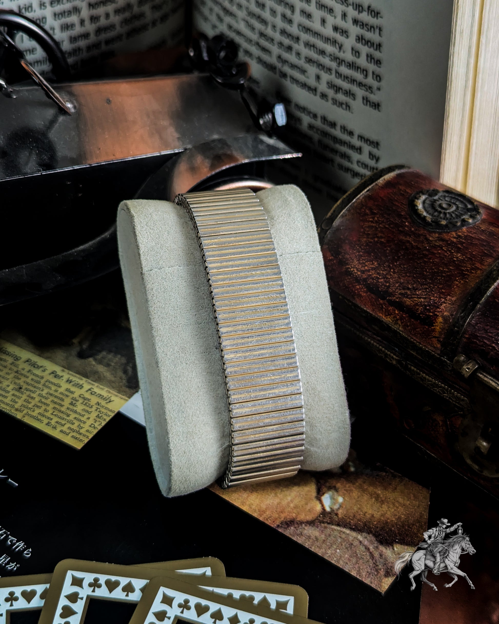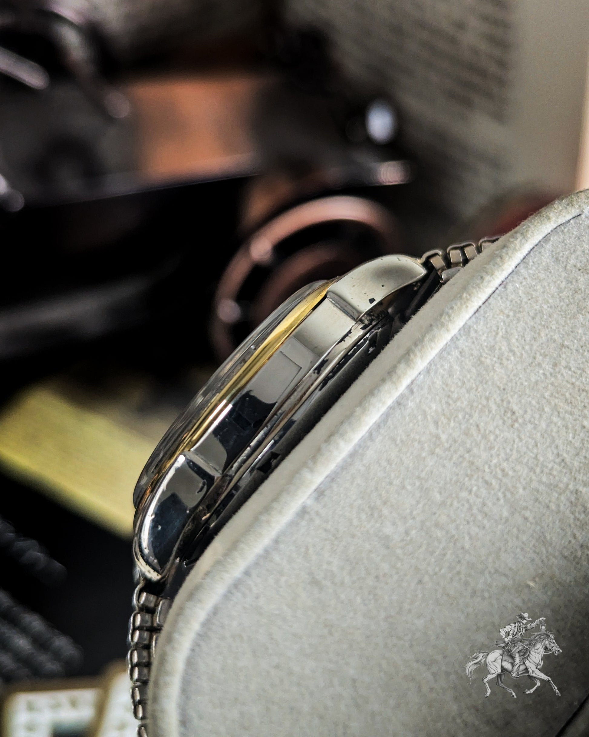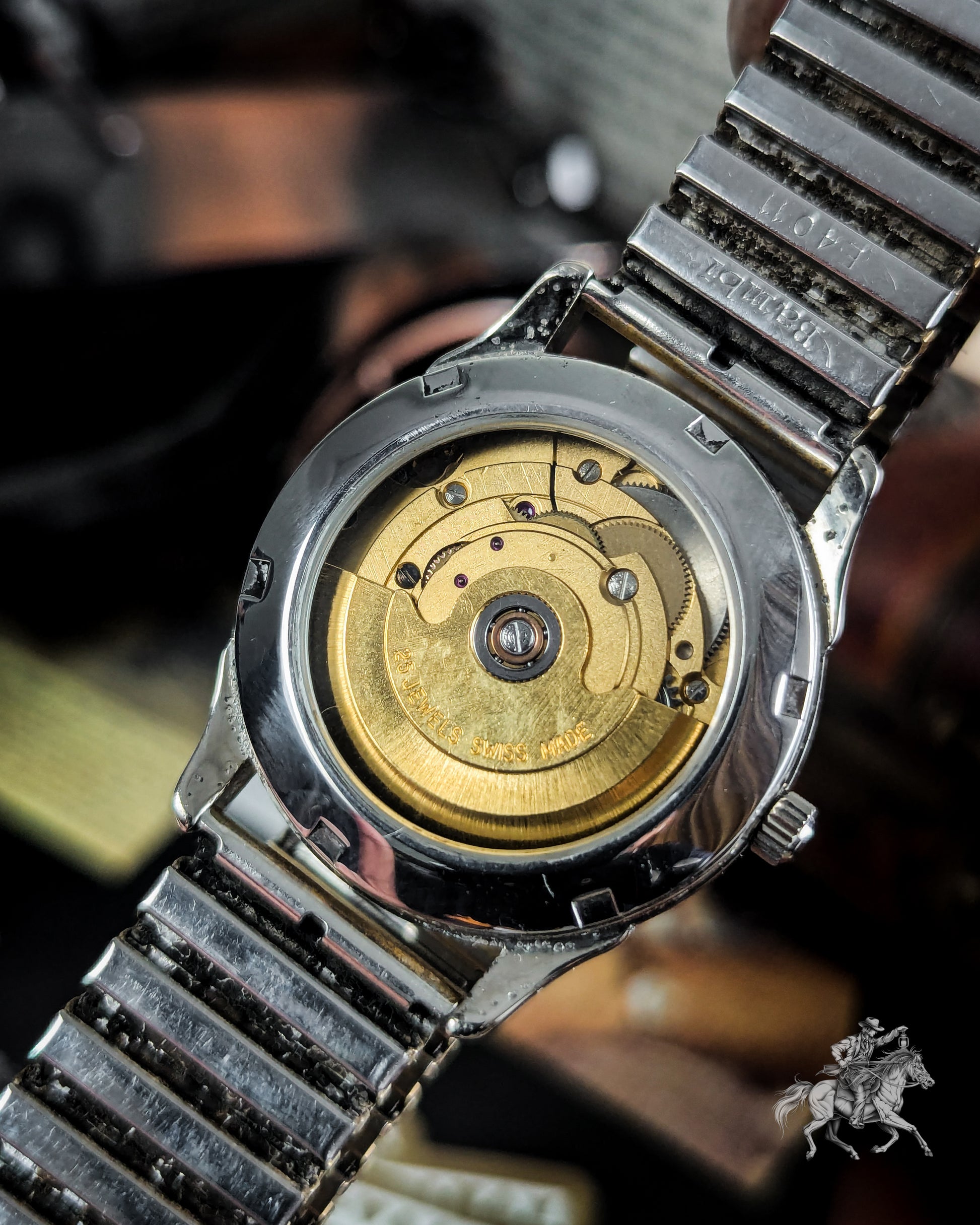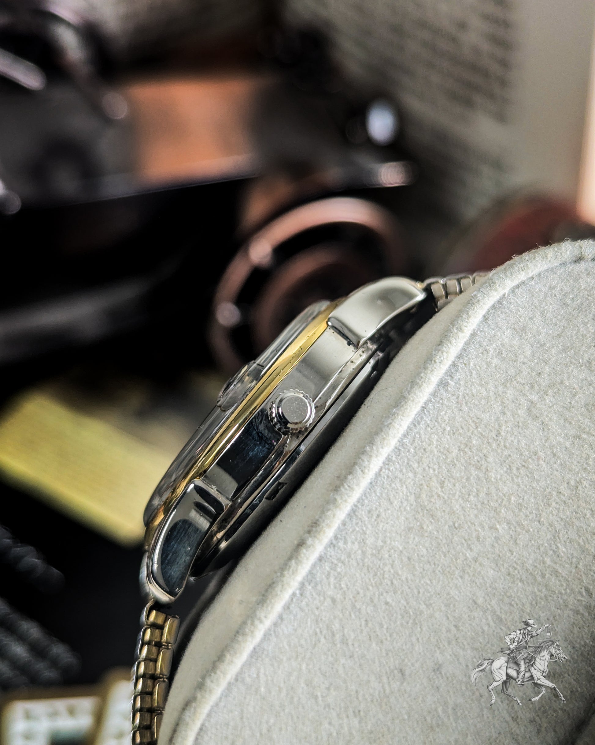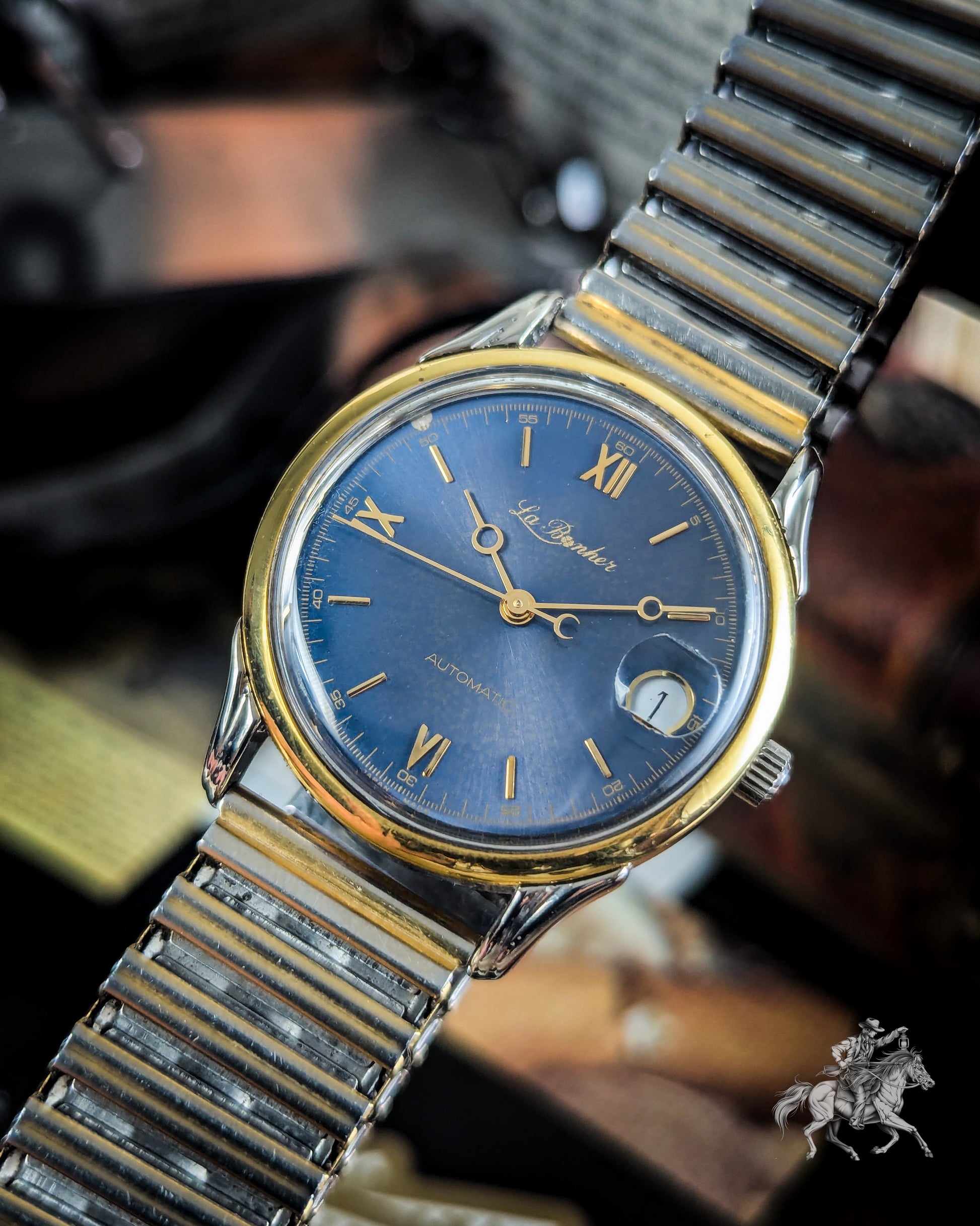 This elegant timepiece is a magnificent piece of Swiss mechanical tradition, representing the post-war era when automatic movements became accessible and refined. The La Bonher Automatic features a stunning deep blue sunburst dial framed by a polished gold-plated bezel and Roman numeral markers at 6 and 12 o'clock, which creates a classic- high-contrast look. The watch's core selling point is the mechanical heart- a reliable 25-Jewel Automatic Movement (likely a high-grade ETA or AS ébauche common in Swiss watches of the 1950s). The higher jewel count was a major marketing point in its day, signifying reduced friction and enhanced longevity. The dial is protected by a domed crystal, which adds a wonderful vintage depth, and the gold-plated case with elegant downturned lugs completes the refined profile. This is a wonderfully unique and sophisticated piece for the collector seeking mechanical quality and beautiful mid-century design outside of the major houses.
