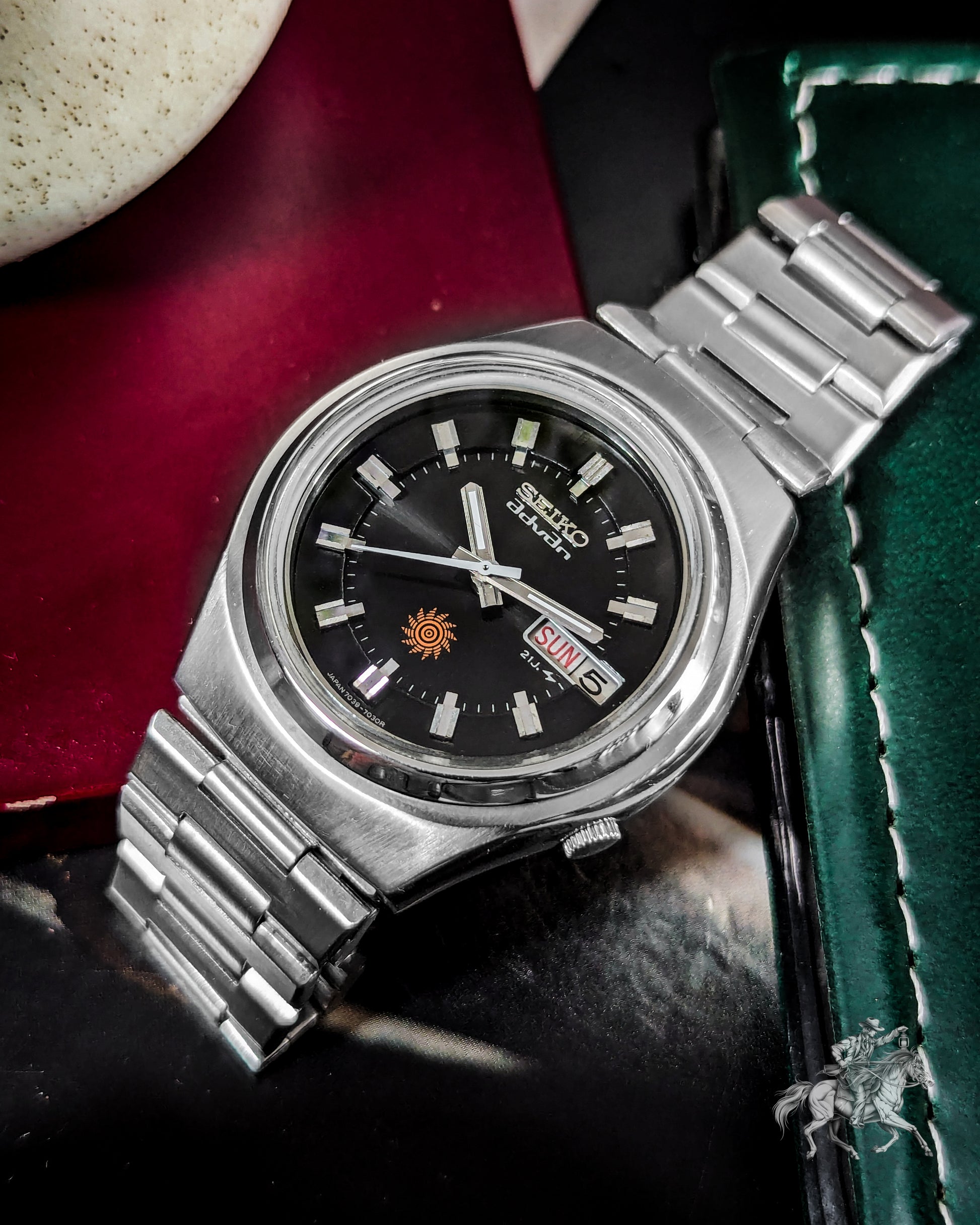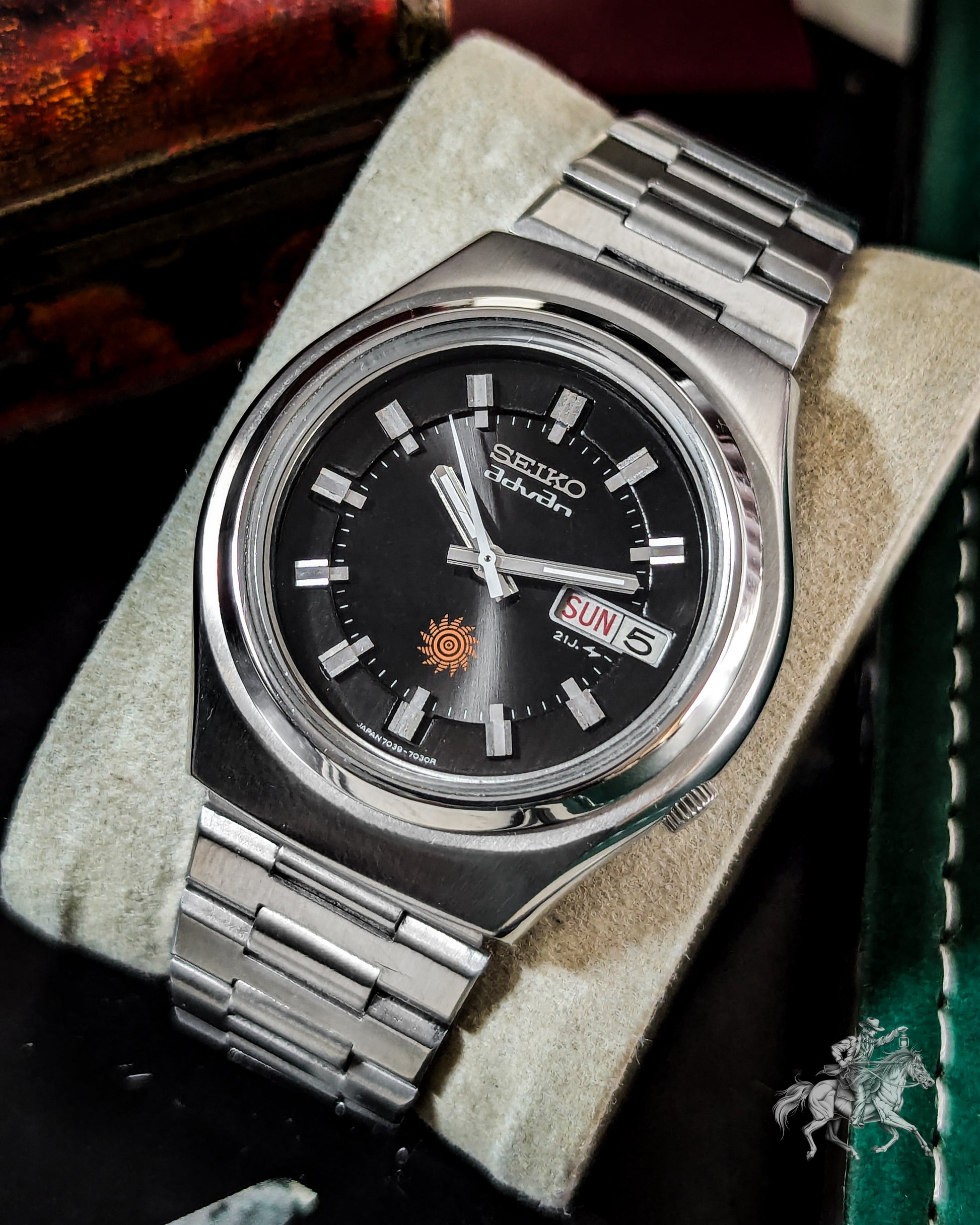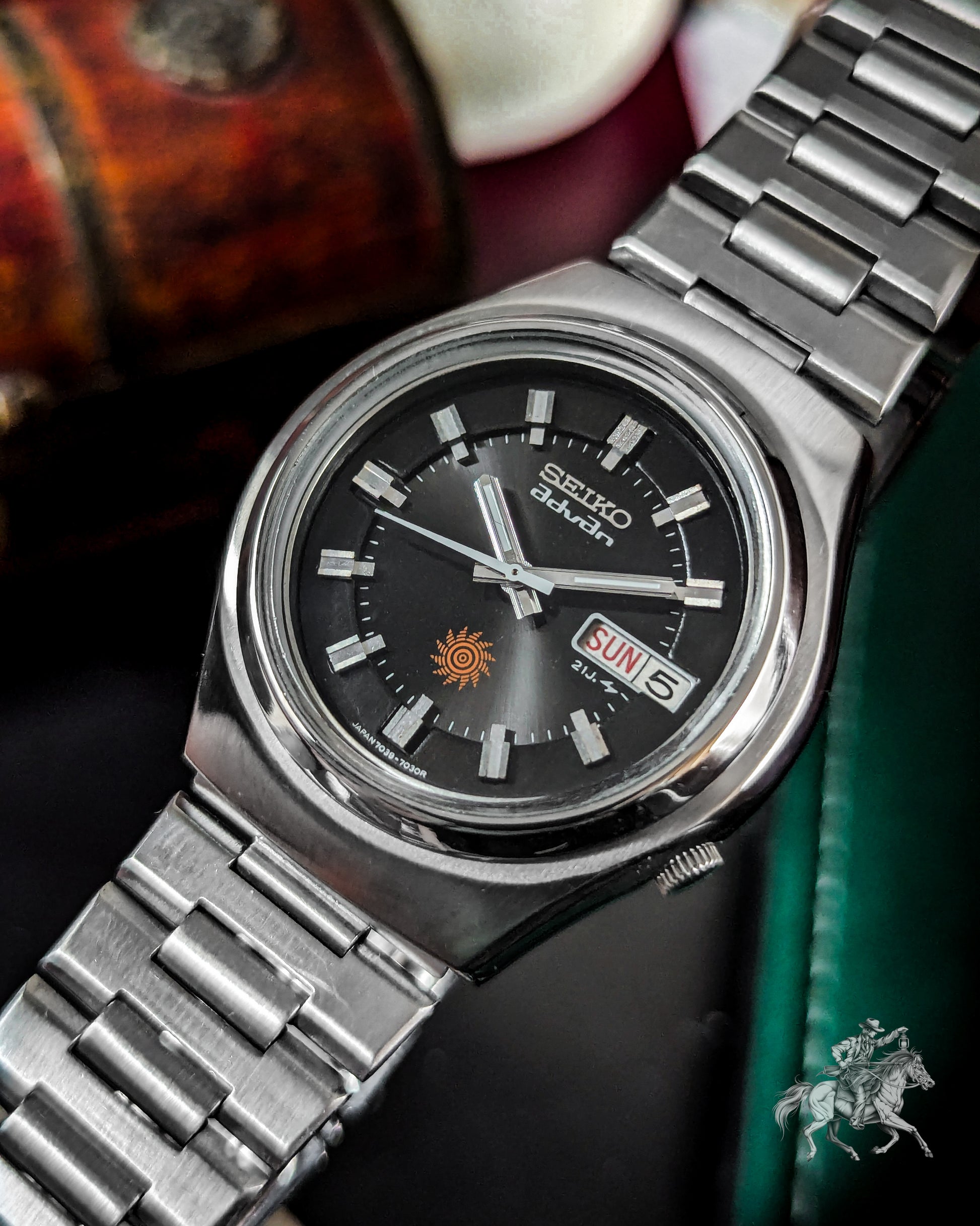 This timepiece is a prime example of Seiko's design daring in the 1970s! The Seiko Advan line was created exclusively for the Japanese Domestic Market (JDM) to showcase futuristic design paired with reliable mechanical movements. The immediate selling point is that incredible, deep blue "Woven Basket" or "Tapestry" dial. This highly textured, two-dimensional pattern makes the dial appear to shift and shimmer in the light, a complex visual effect that instantly elevates the watch into a high-art piece.