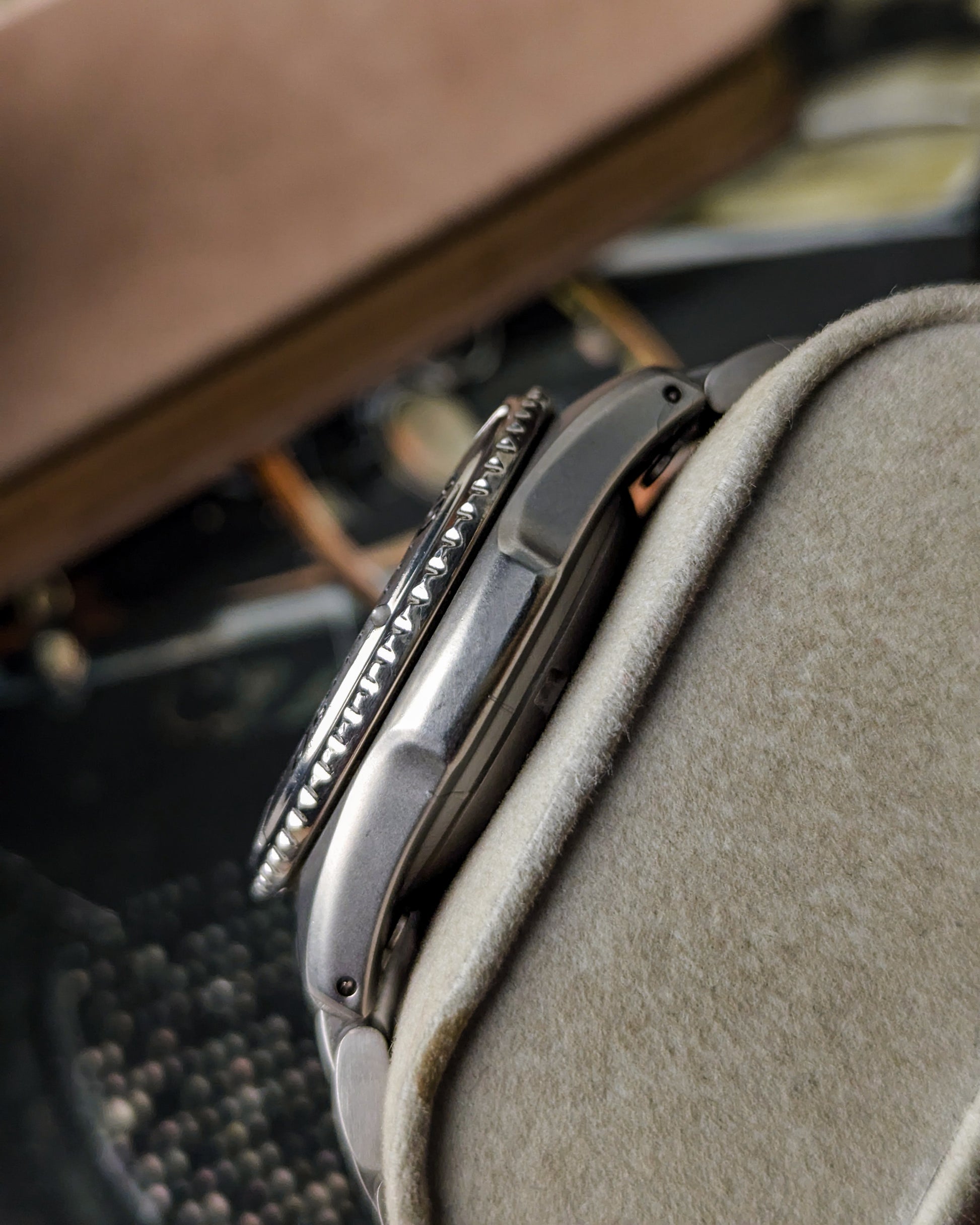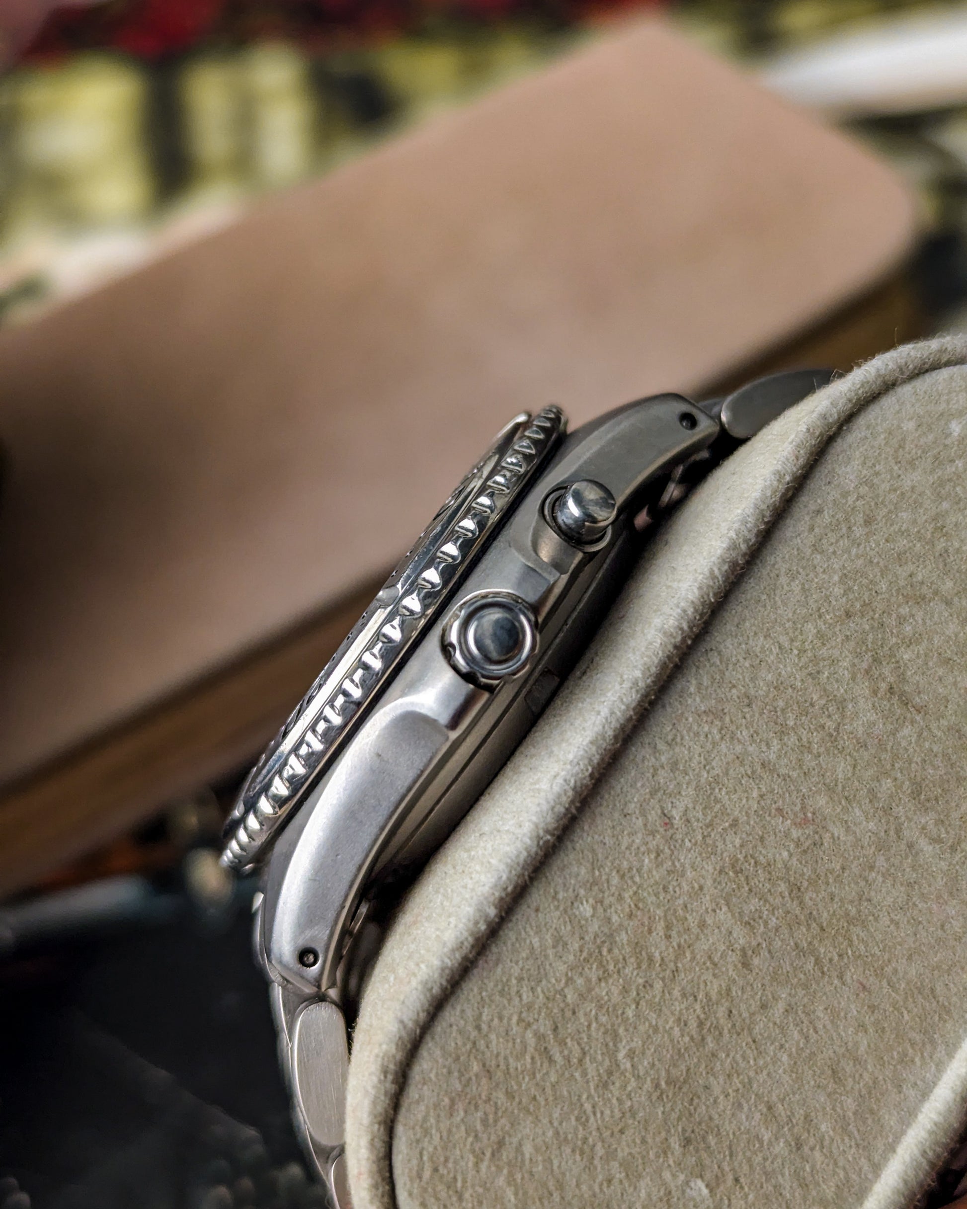 The watch is built for serious professional use, featuring a 200m Air Diver rating and a unidirectional rotating bezel. Crucially, the entire watch (case and bracelet) is constructed from Titanium, making it incredibly lightweight, hypoallergenic, and highly resistant to saltwater corrosion- ideal for a professional scuba watch. The dial has a unique textured, speckled grey finish which complements the matte titanium case. The serial number 905427 suggests a production date of May 1999 (based on the first digit '9' and the second digit '0' for the month). This is an outstanding piece for a collector who appreciates cutting-edge hybrid technology and a professional-grade tool watch.