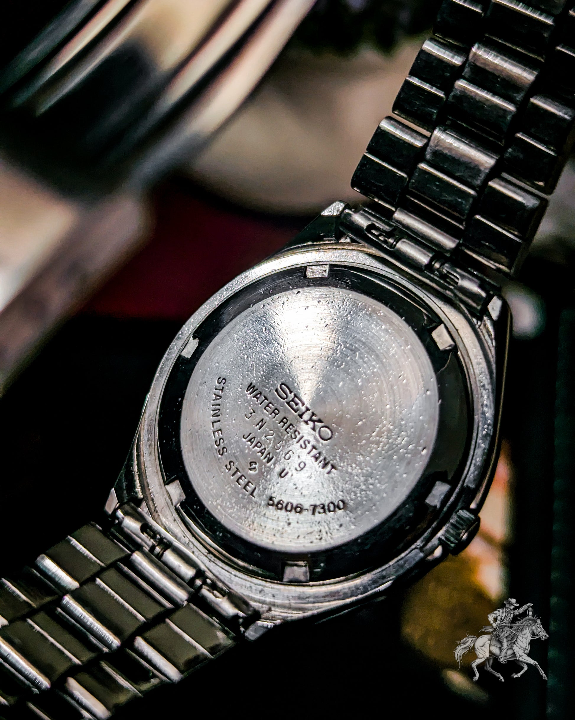The final detail for the informed buyer is the case back reference 5606-6000. This reference number signifies one of the earliest and most classic versions of the LM series. The presence of the fully functioning bilingual calendar (English and Kanji, showing the Japanese characters for the day of the week) is a desirable JDM touch, and the "Water Resistant" marking confirms its intended everyday durability.