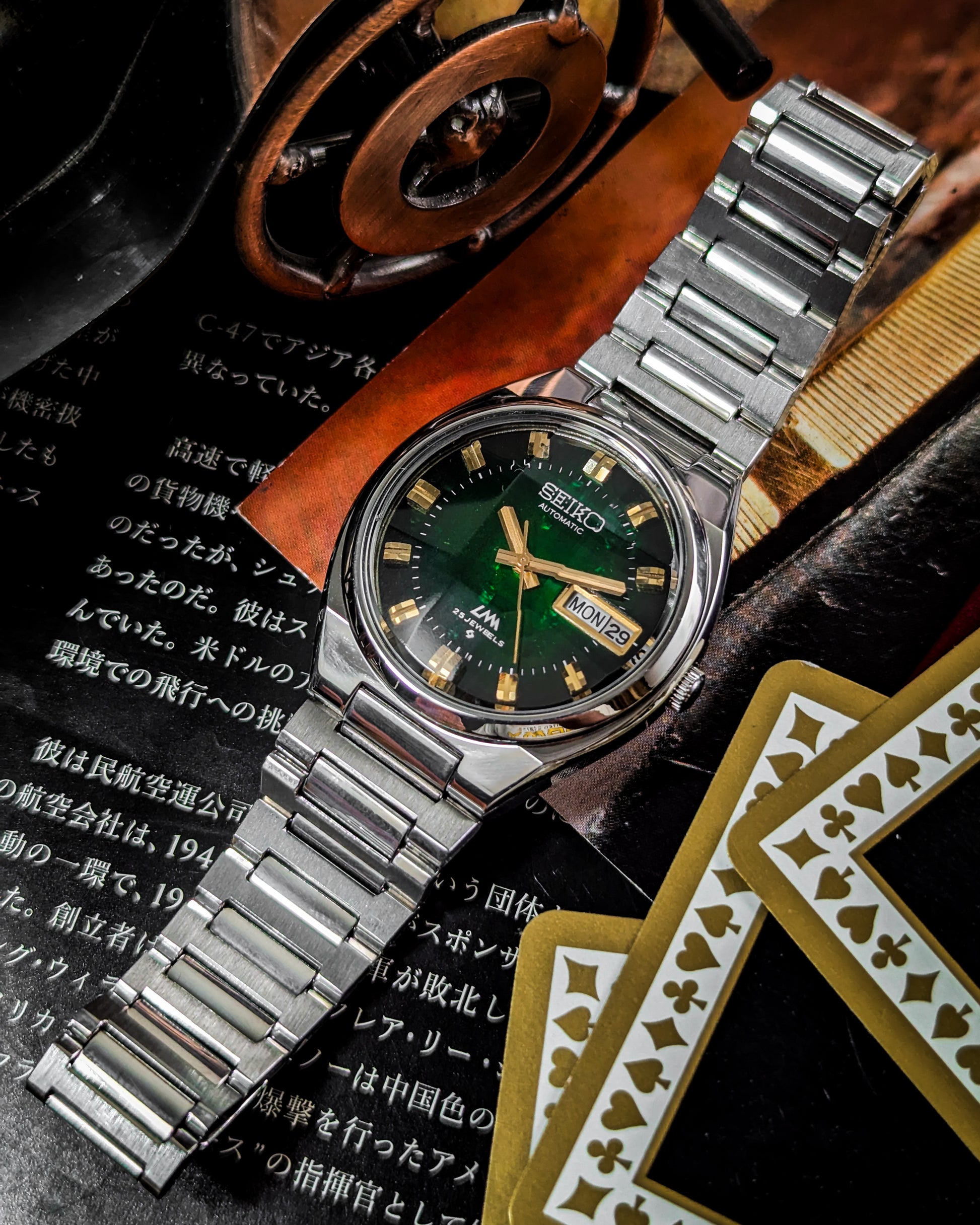 This elegant timepiece is a stunning example of Japanese Domestic Market (JDM) dress watch quality from the mid-1970s. The Lord Matic (LM) line was highly prestigious, positioned just below the King Seiko, and renowned for its thin, refined, automatic movements. This model, reference 5606-5340, is defined by its striking gold-toned case and a beautiful deep green sunburst dial, which catches the light dramatically. The watch is powered by the excellent Seiko Caliber 5606, an in-house automatic movement which operates at a smooth $21,600 \text{ VPH}$ and is highly respected for its slim profile.