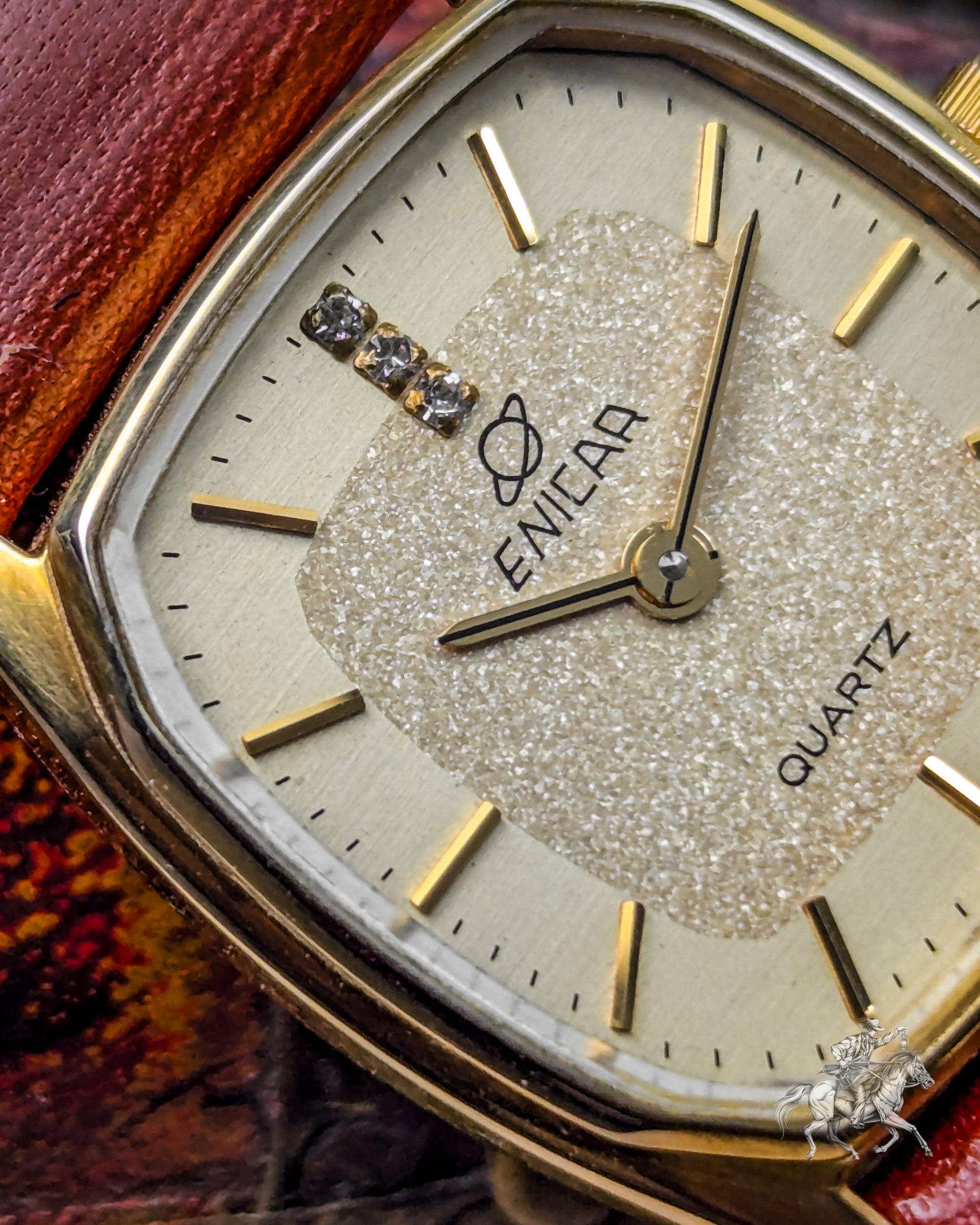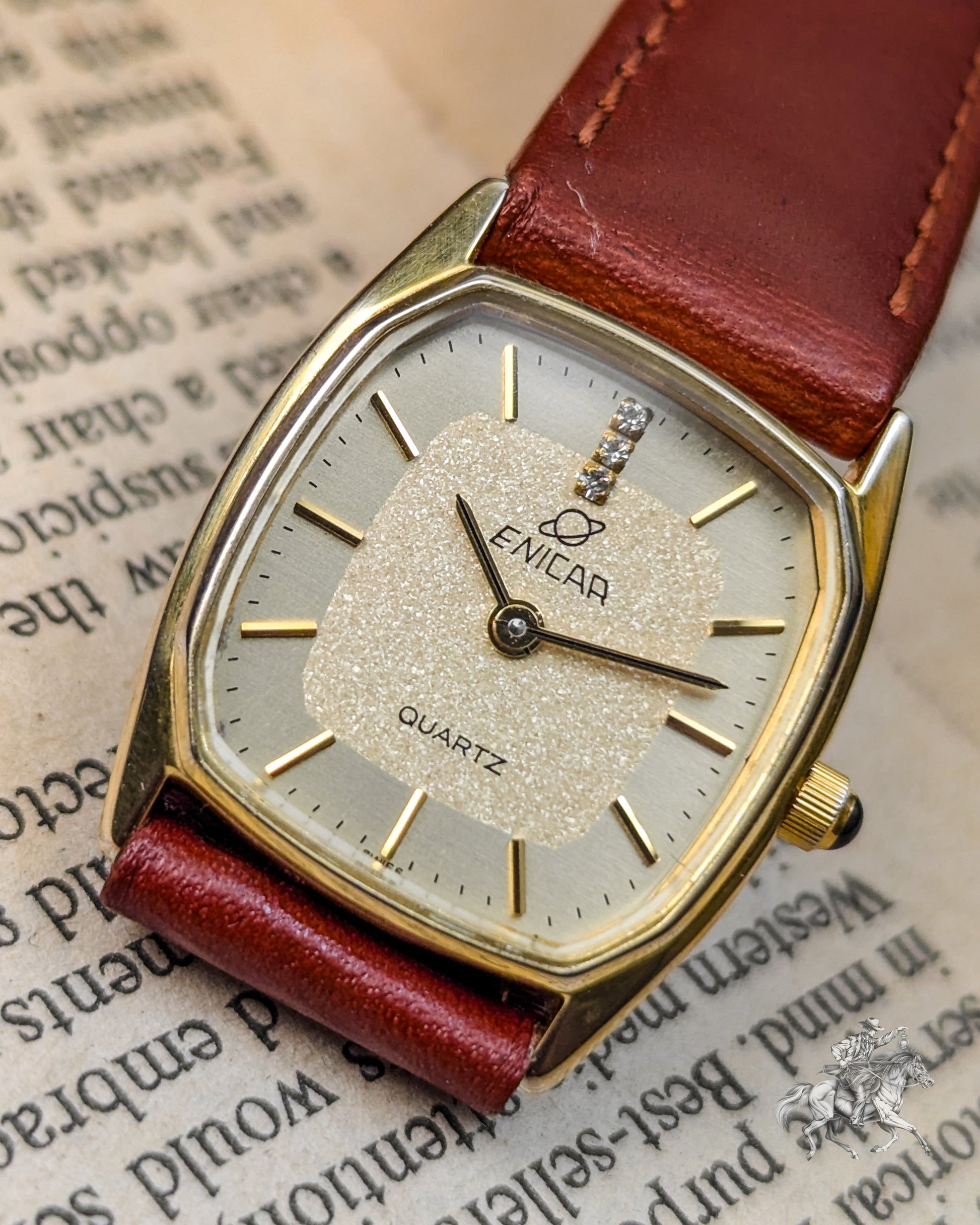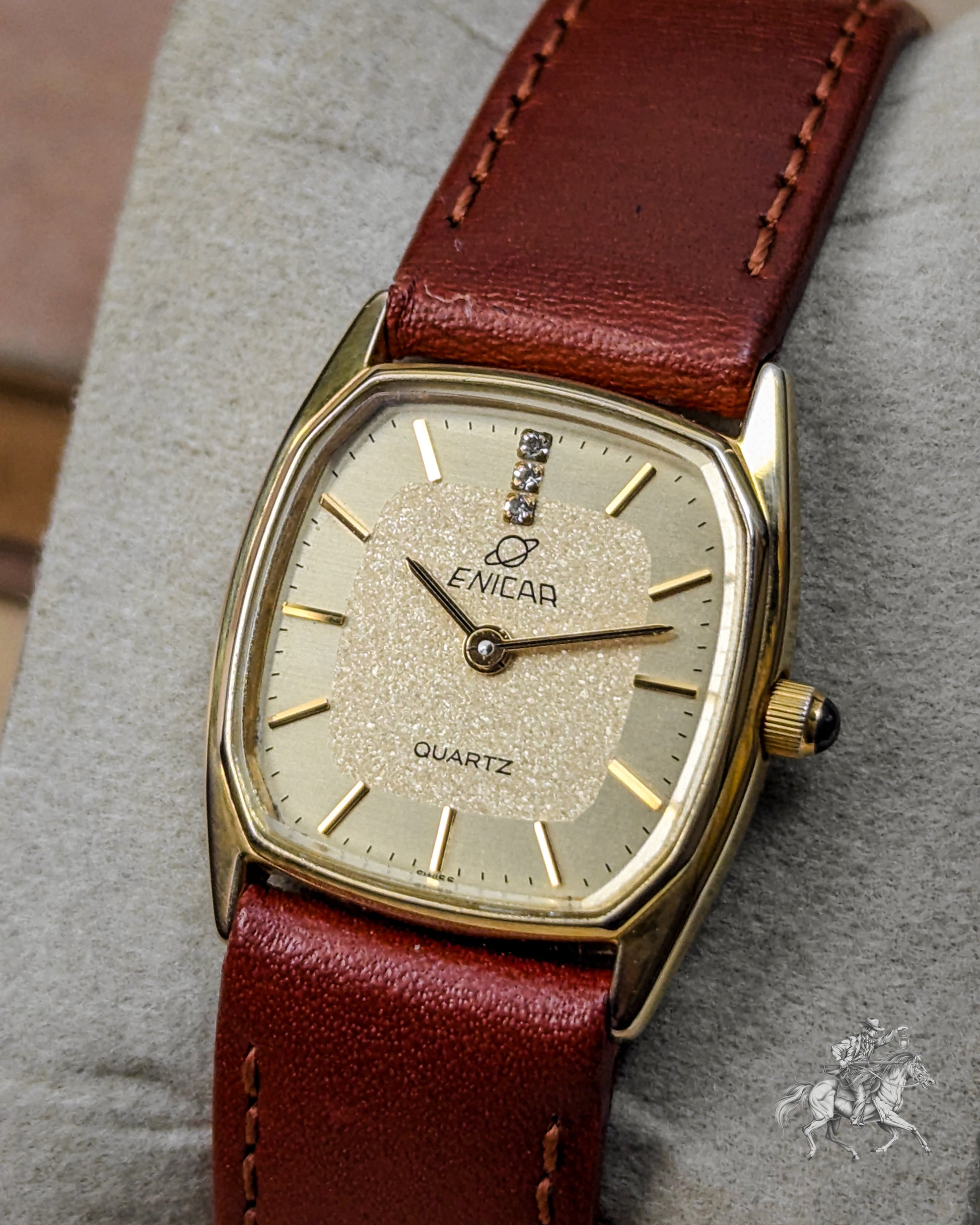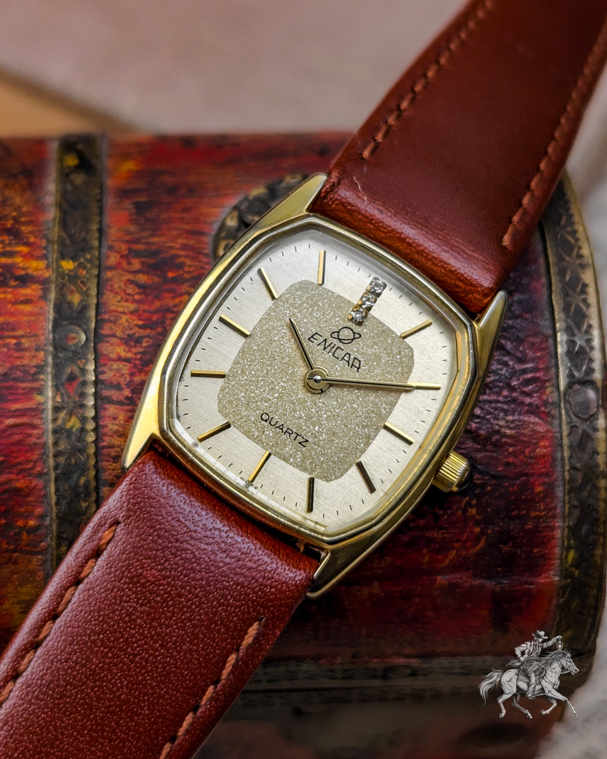 This elegant timepiece is a magnificent piece of Swiss precision, stemming from the famous Enicar brand, known for its Sherpa and chronometer-grade watches. While the original Enicar company ceased operations in 1988, this watch belongs to the period when the brand used high-quality, reliable external movements (likely from ETA or FHF) to meet market demands in the 1980s. The gold-plated case has a pleasing rectangular shape with rounded sides- often referred to as a Tonneau or Cushion Tank- which frames the beautiful, finely textured gold dial. The dial features applied gold-toned baton indices and two tiny, integrated rhinestones or diamonds, providing a touch of sophisticated, high-end luxury that was popular in the era. The reliable Quartz movement ensures excellent grab-and-go accuracy, making it a perfect functional dress watch.