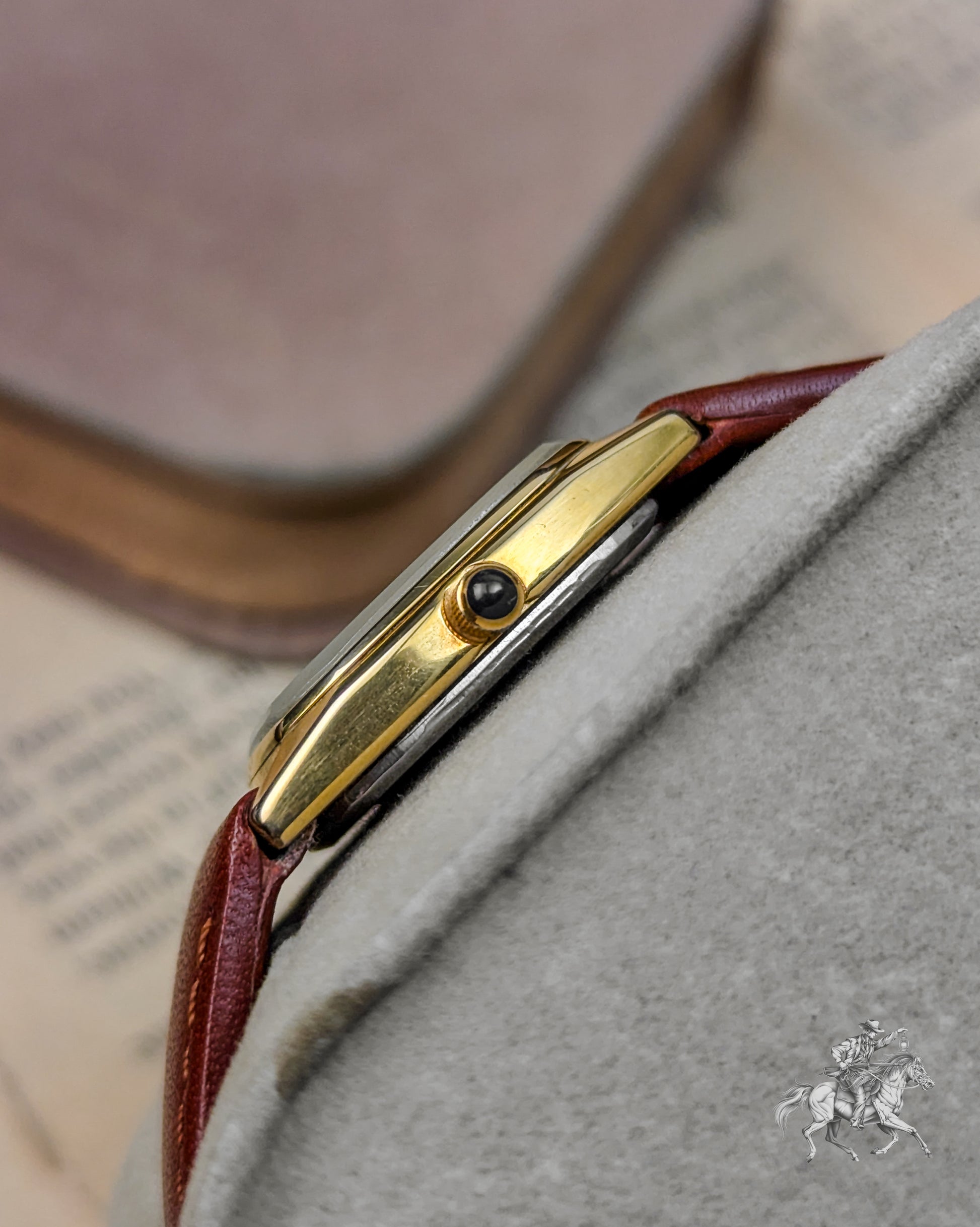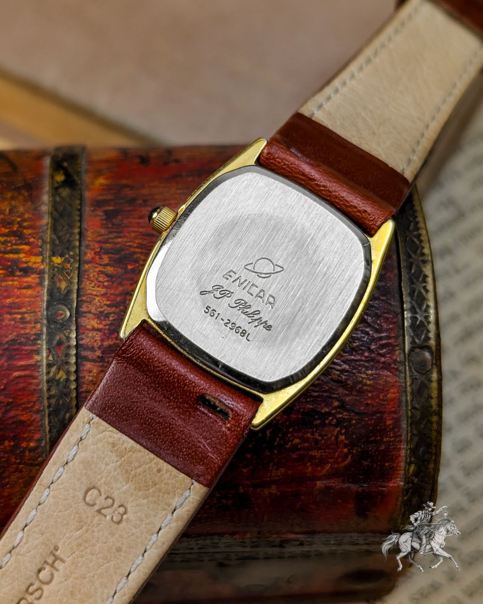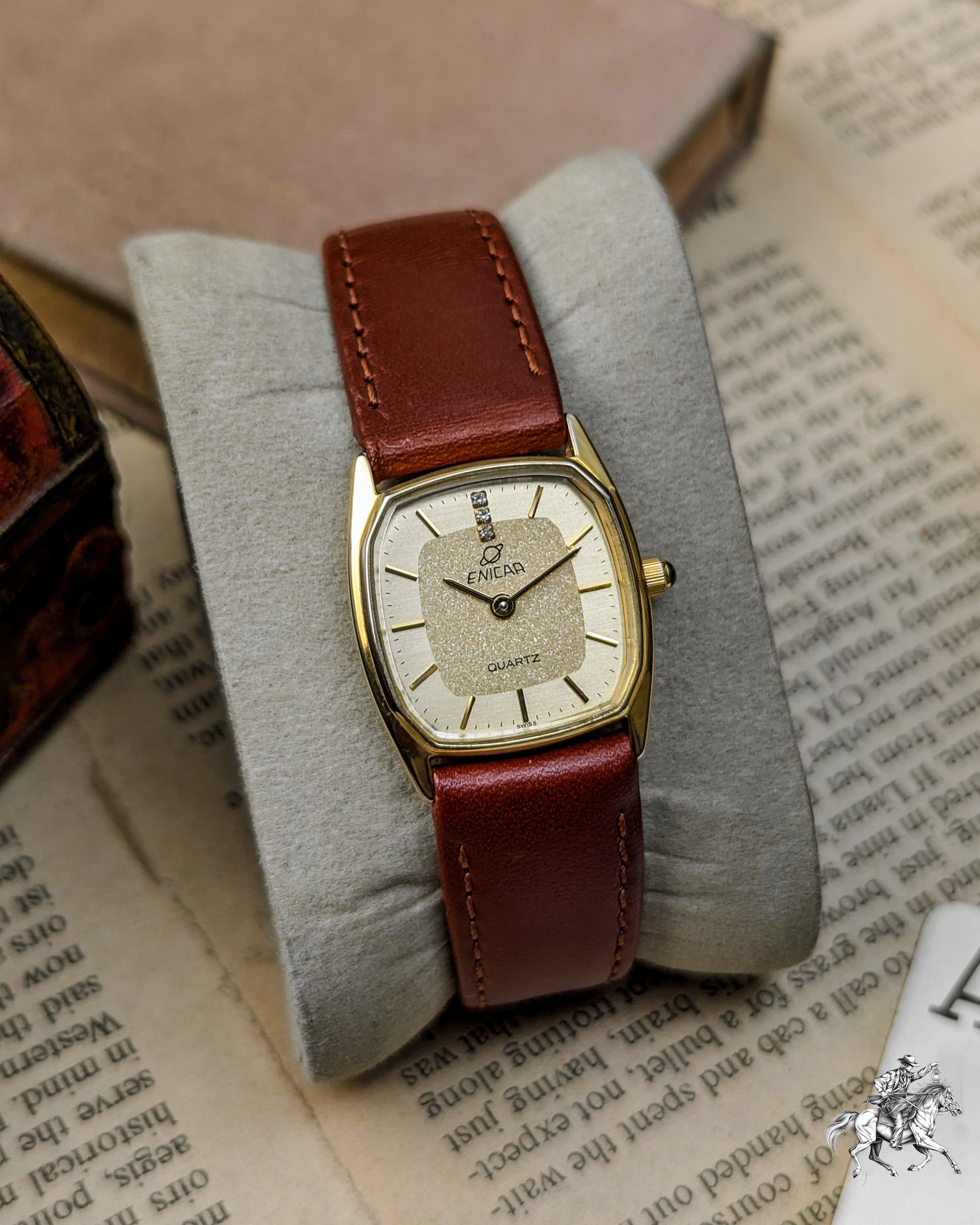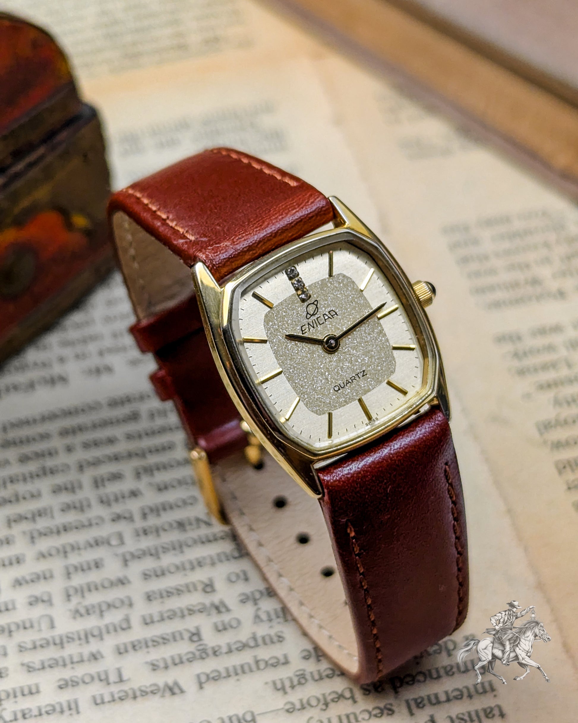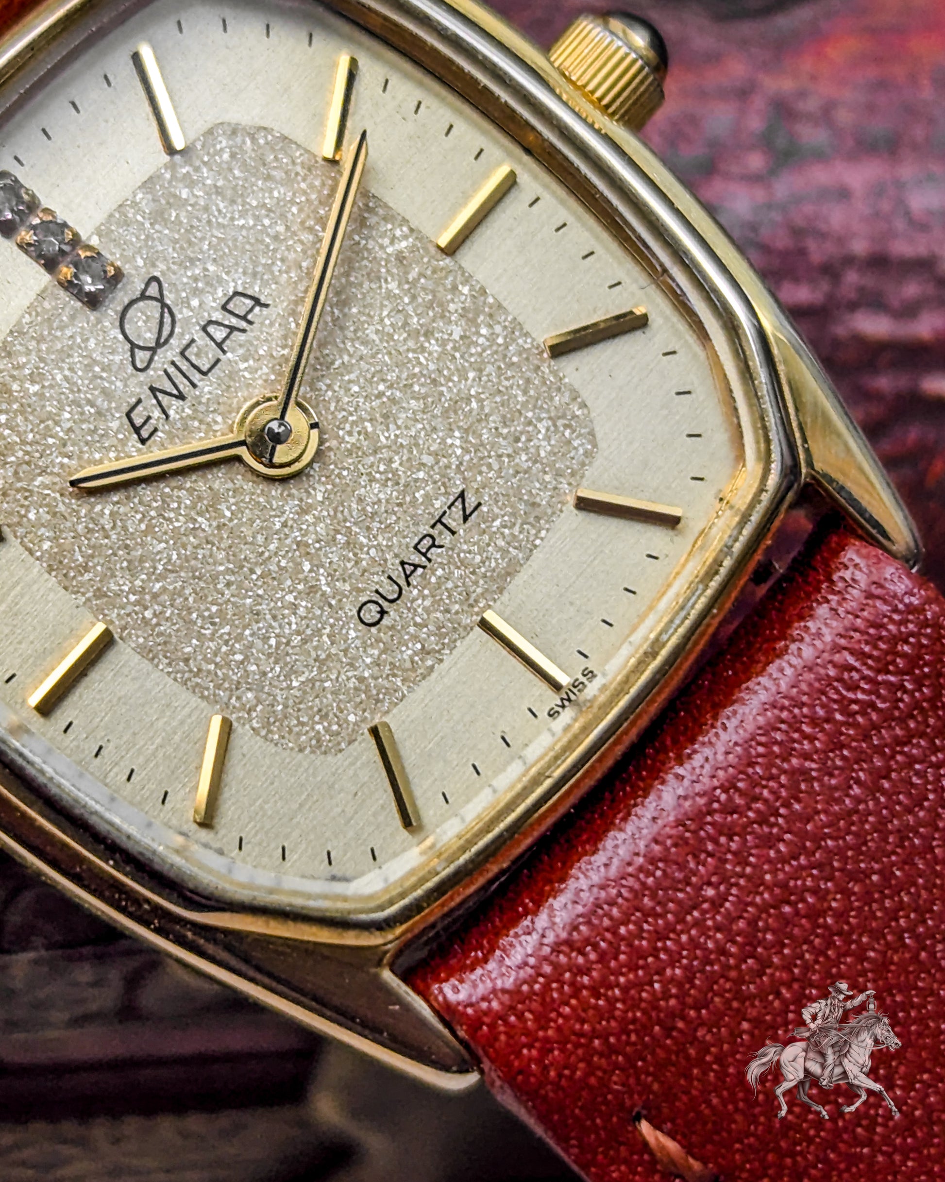 This elegant timepiece is a magnificent piece of Swiss precision, stemming from the famous Enicar brand, known for its Sherpa and chronometer-grade watches. While the original Enicar company ceased operations in 1988, this watch belongs to the period when the brand used high-quality, reliable external movements (likely from ETA or FHF) to meet market demands in the 1980s. The gold-plated case has a pleasing rectangular shape with rounded sides- often referred to as a Tonneau or Cushion Tank- which frames the beautiful, finely textured gold dial. The dial features applied gold-toned baton indices and two tiny, integrated rhinestones or diamonds, providing a touch of sophisticated, high-end luxury that was popular in the era. The reliable Quartz movement ensures excellent grab-and-go accuracy, making it a perfect functional dress watch.