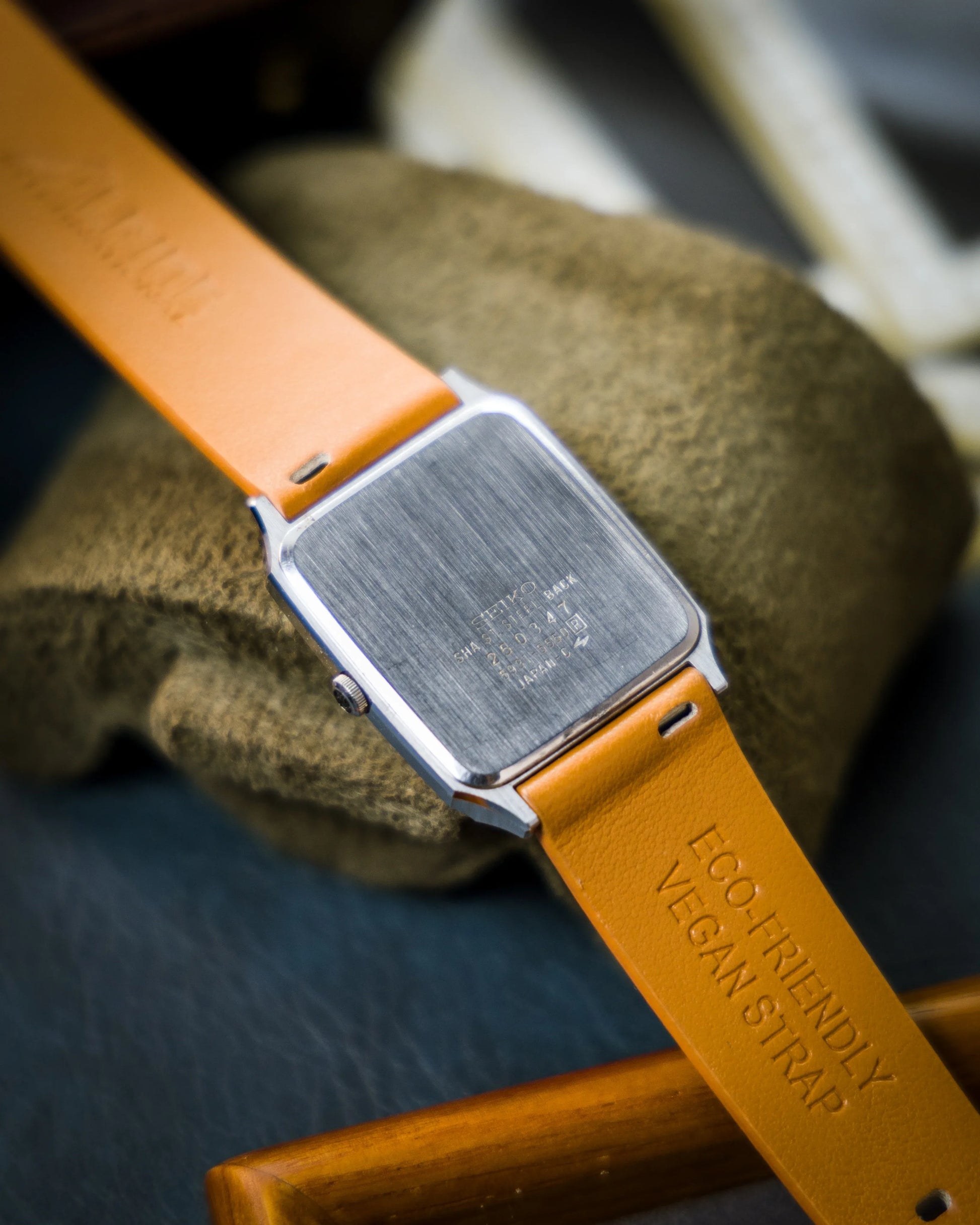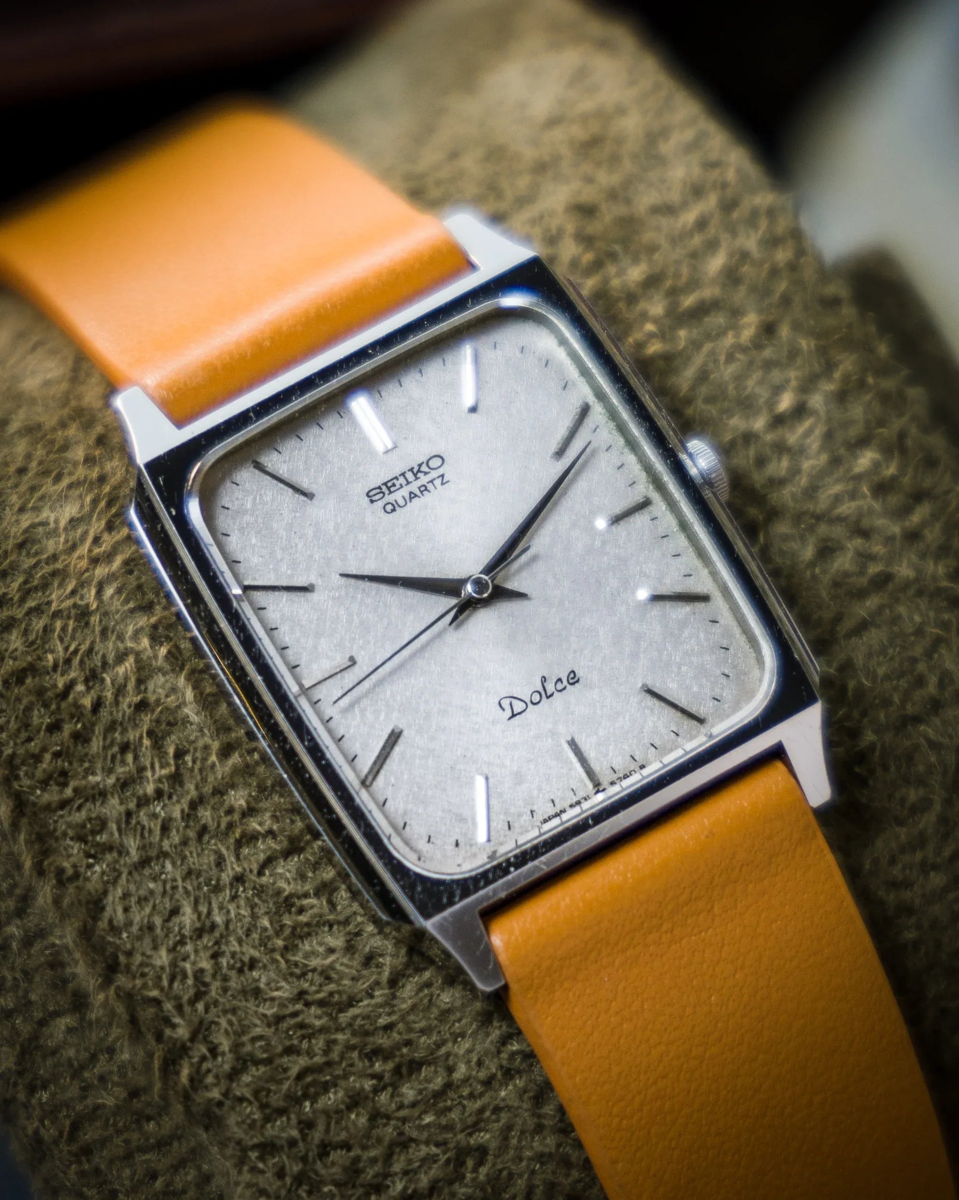 The architecture is quintessentially mid-century minimalist, featuring a sharp, square "tank" style case with polished facets and a sapphire crystal that sits perfectly flush with the bezel. The dial is a work of understated luxury, featuring hand-applied silver baton indices and the elegant "Dolce" script, which was Seiko's premier line for sophisticated dress watches in the JDM. Flipping the watch over reveals the crisp caseback engraving with the reference and the serial number 250347, definitively confirming its authentic Japanese Domestic Market (JDM) heritage. This is an essential acquisition for a connoisseur who appreciates refined Japanese aesthetics, the mechanical soul of a precision heart, and the timeless, understated class of the vintage Seiko Dolce line.
