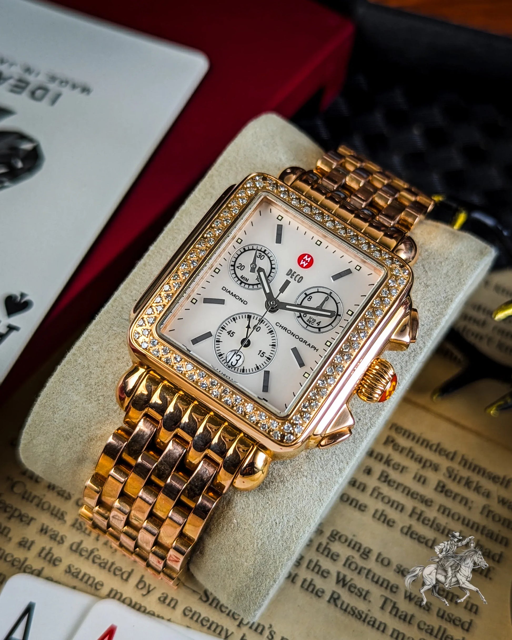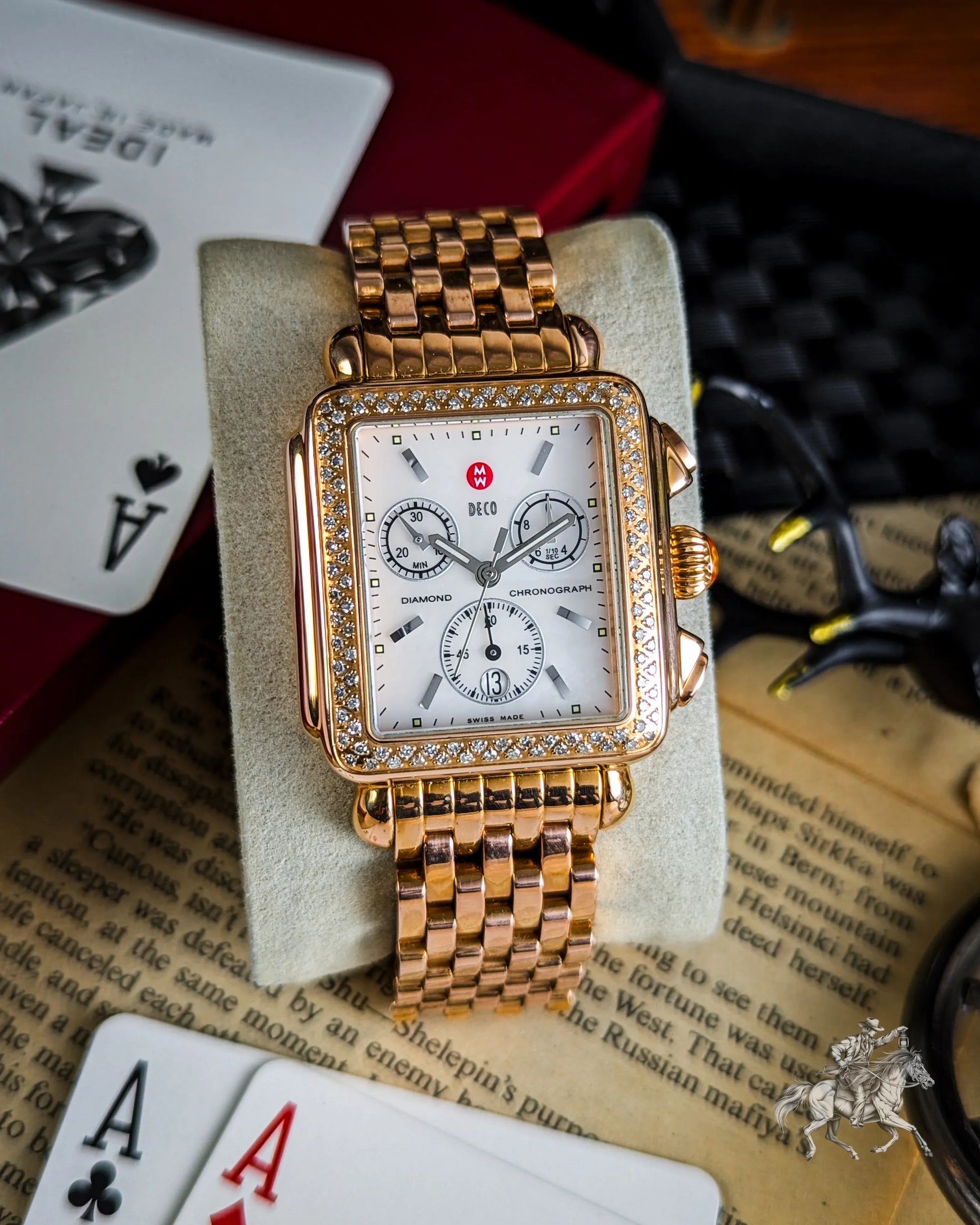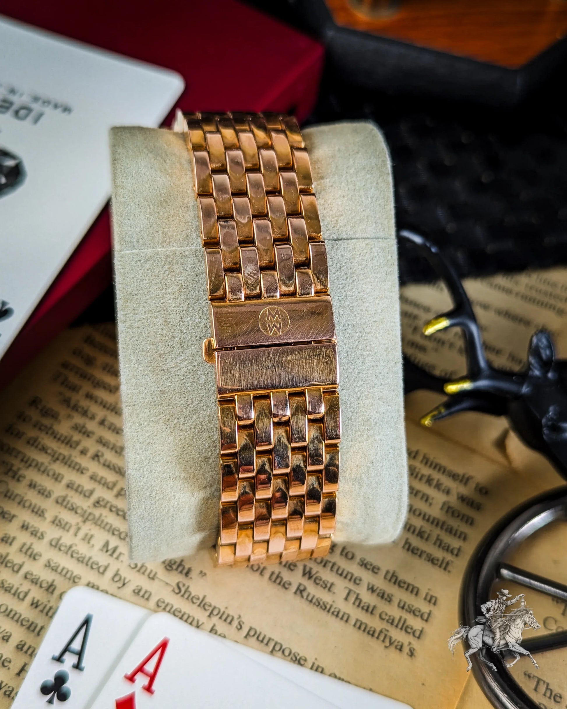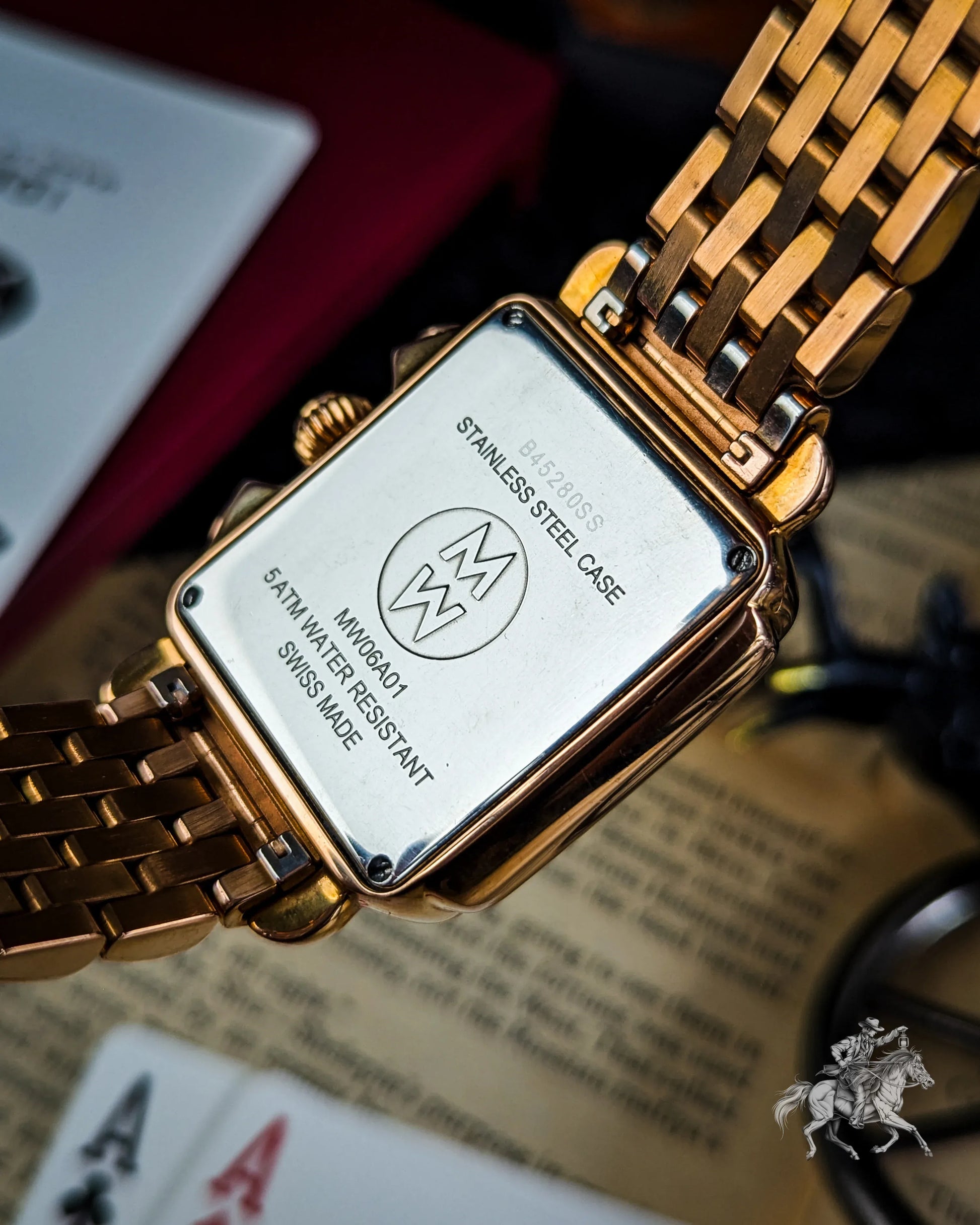 Powered by a precise Swiss Quartz movement, this Michele Deco ensures reliable and accurate timekeeping. The "Deco" collection is celebrated for its distinctive art deco inspired aesthetic and customizable nature, reflecting Michele's commitment to luxurious and fashionable timepieces. It comes paired with a matching rose gold toned bracelet, completing its glamorous and refined presence.