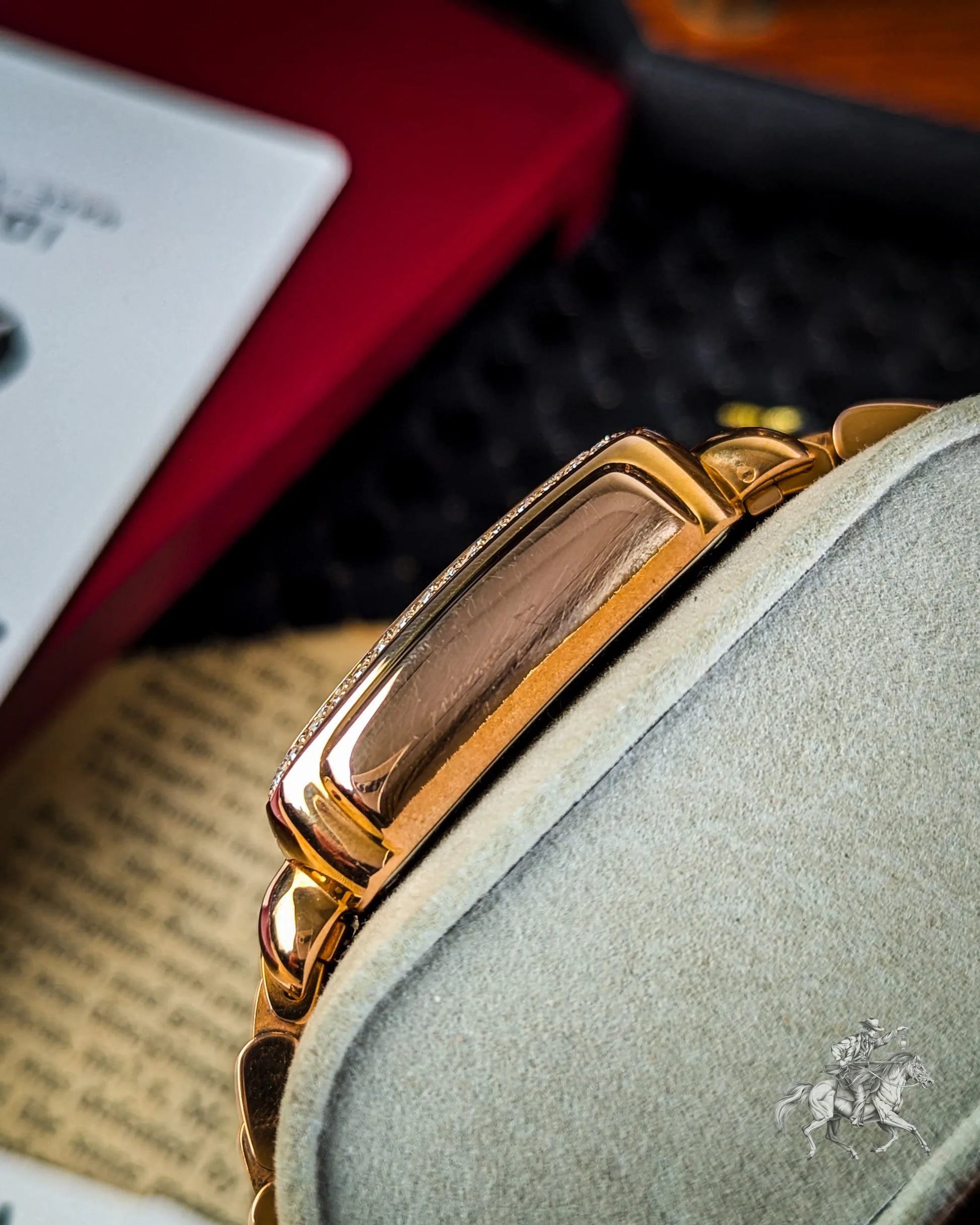 The rectangular rose gold case is meticulously set with dazzling diamonds along its bezel, exuding sophisticated sparkle. The mother of pearl dial, with its subtle iridescence, beautifully complements the polished sub dials and hour markers. This watch combines the functionality of a chronograph with opulent design elements.