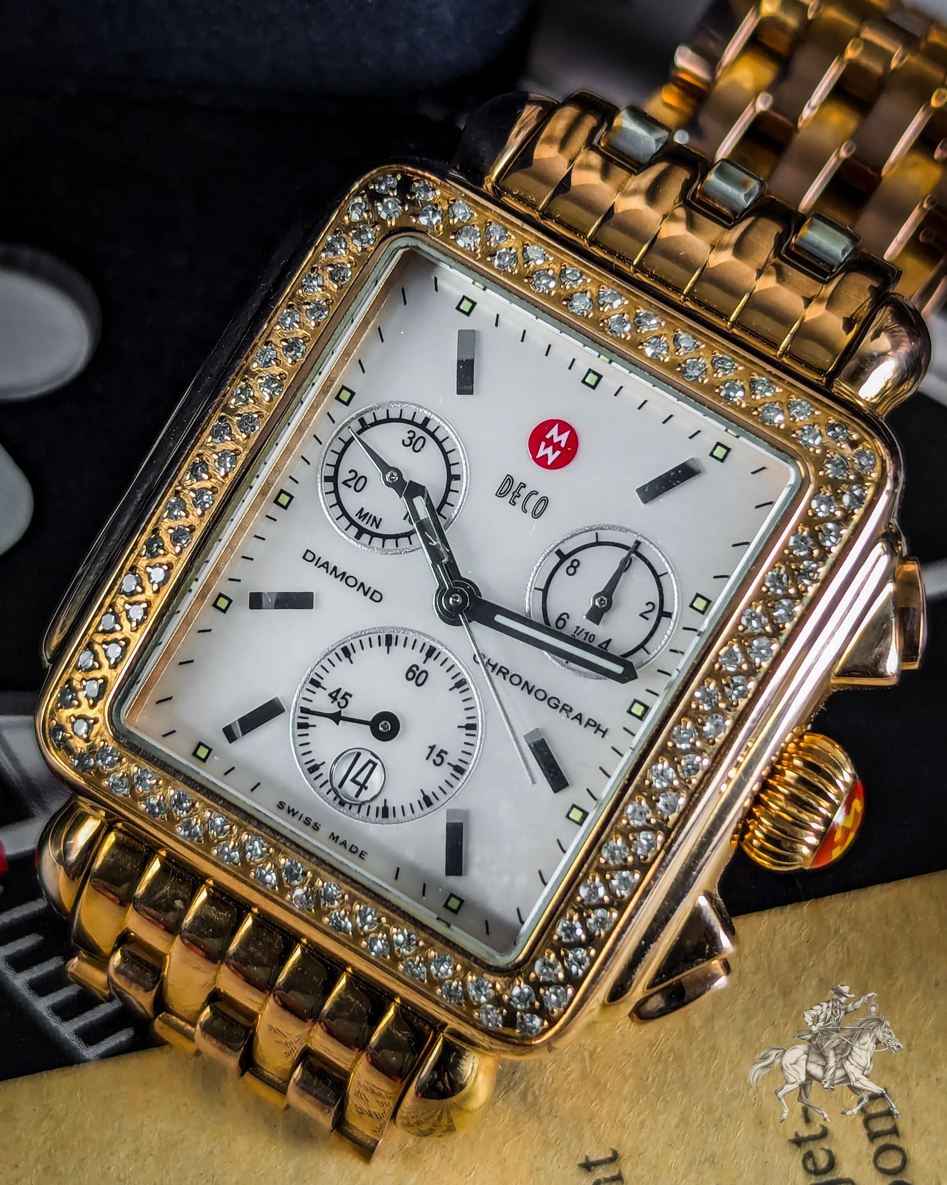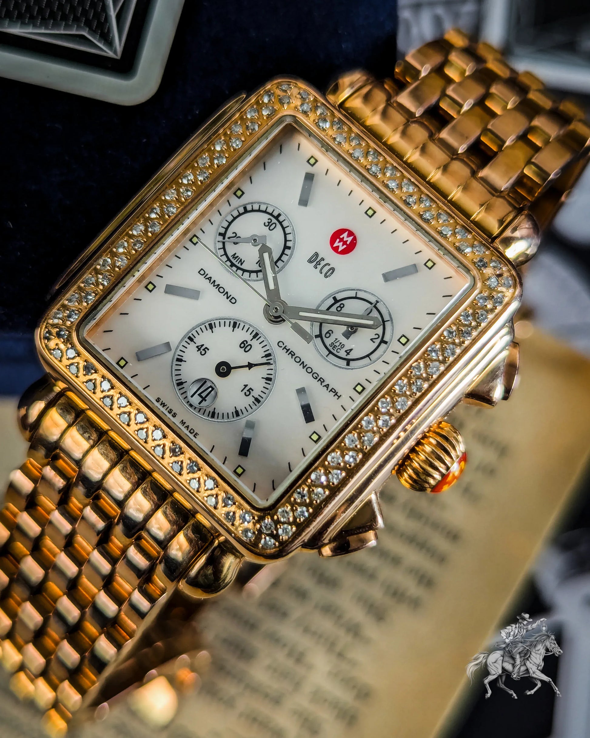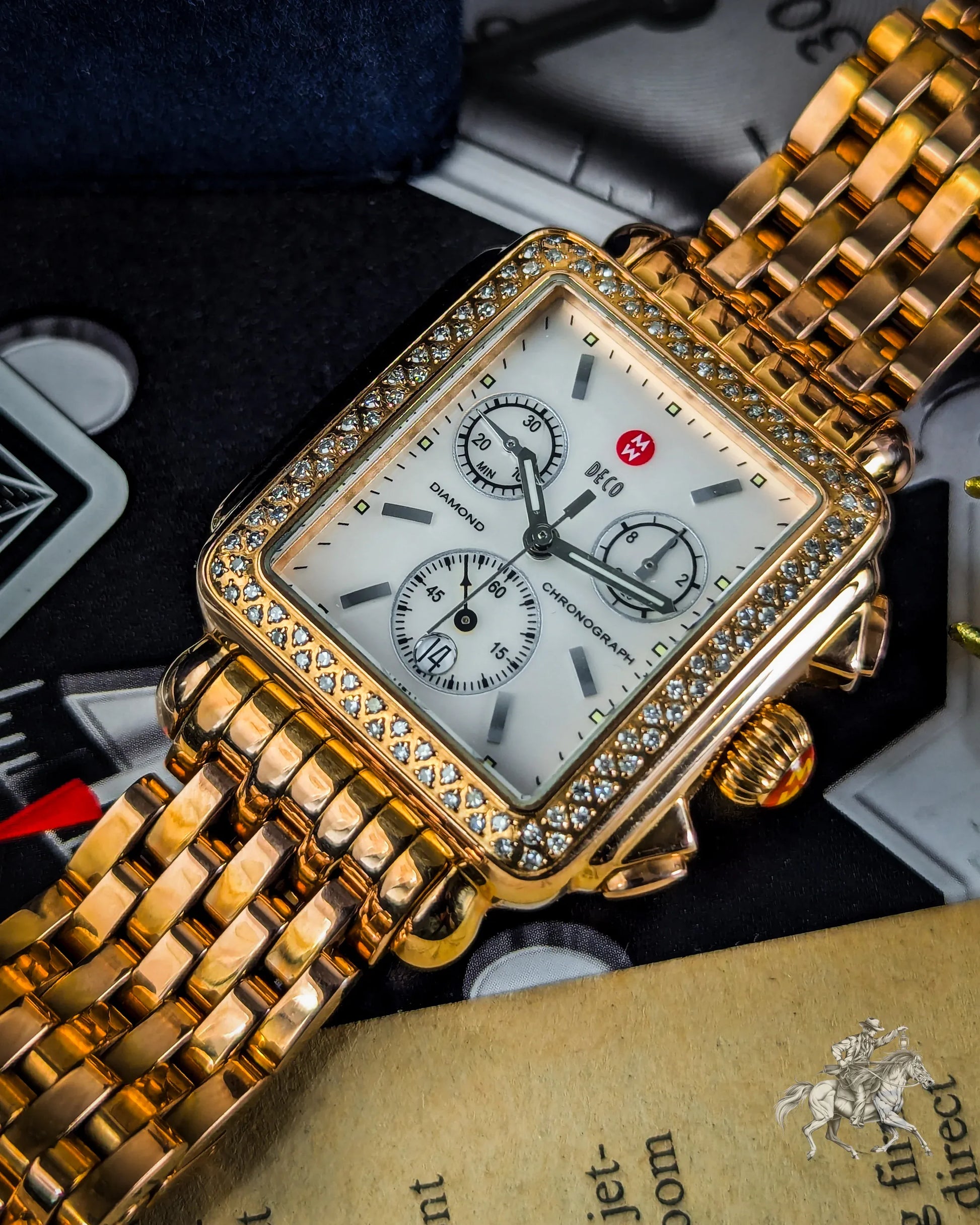A luxurious Michele Deco Diamond MW06A01 from the 2000s Swiss era, this timepiece is an exquisite blend of elegance and modern design. It features a stunning Rose Gold Case and a radiant Pearl White Dial, accented by brilliant Diamond Chronograph detailing.