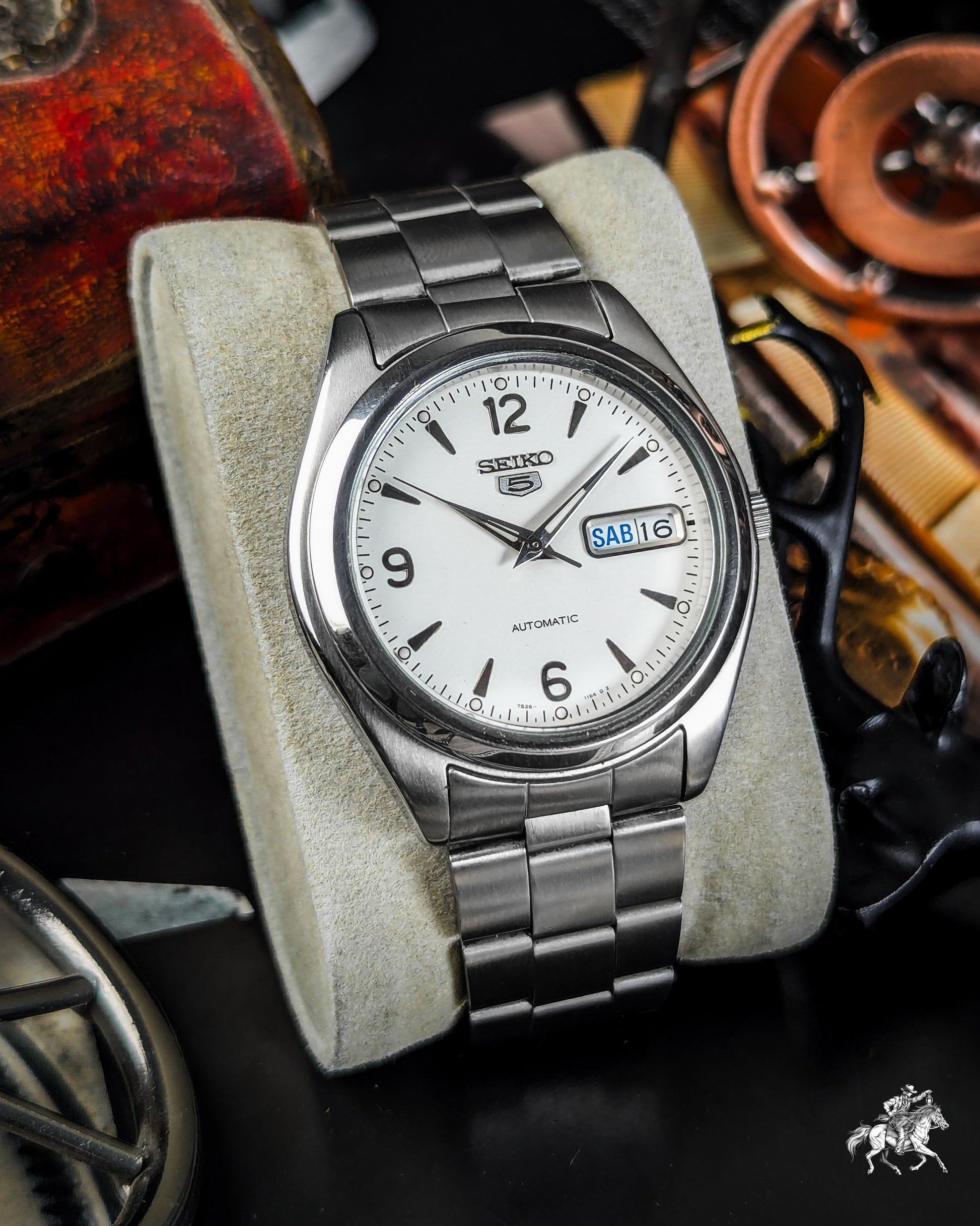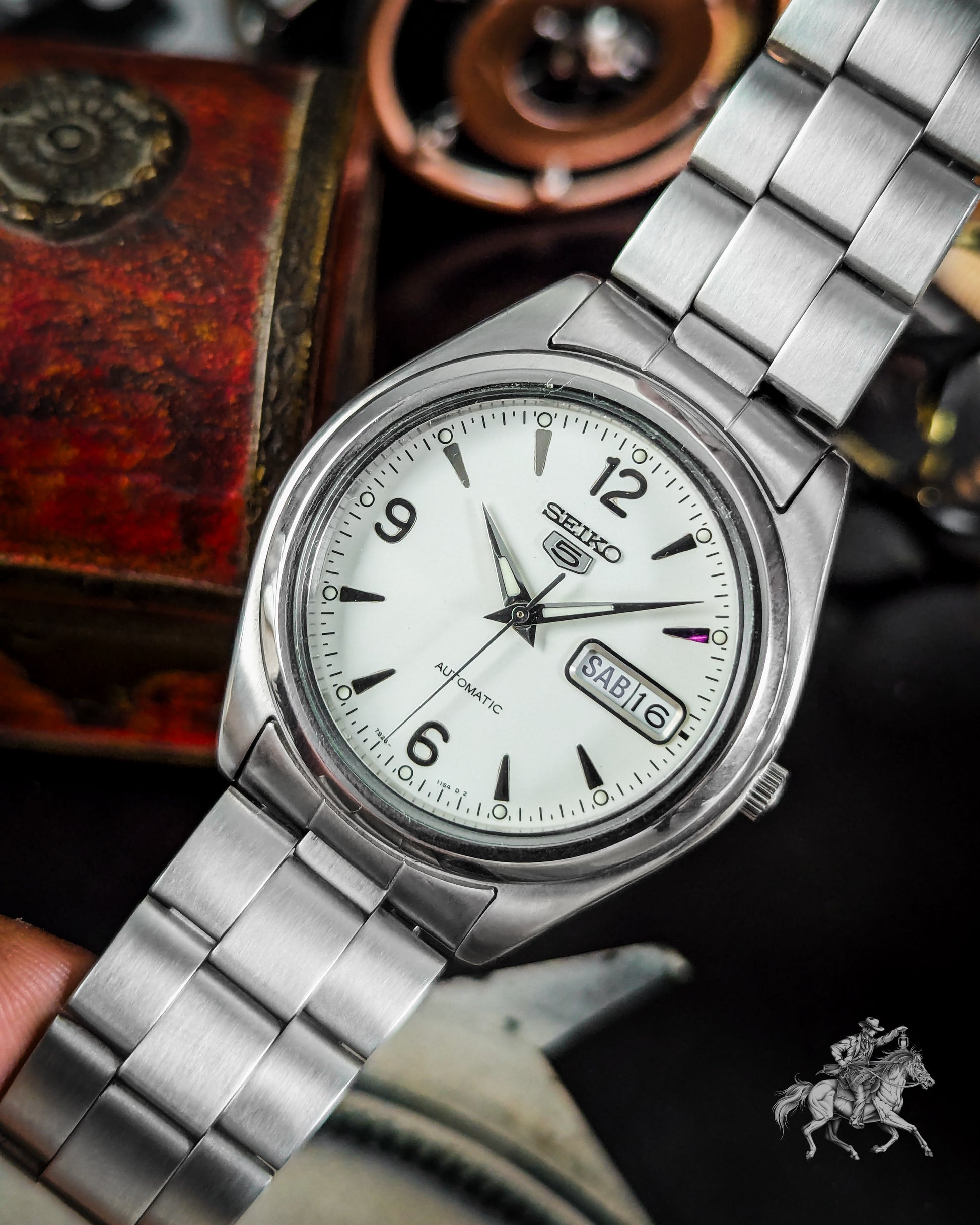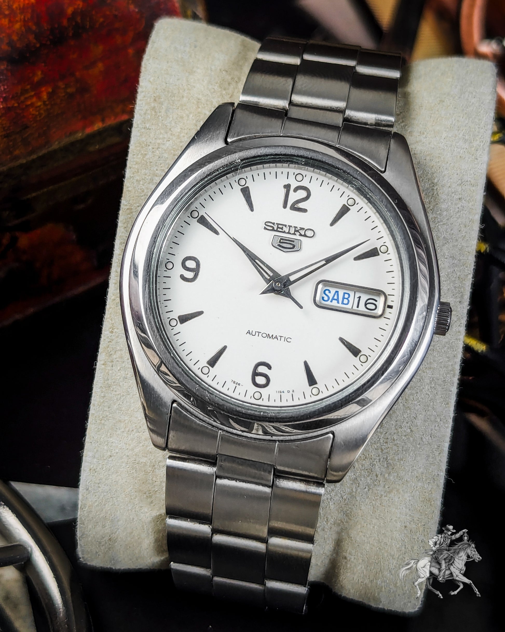 JDNA classic Seiko 5 Automatic 7S26-0060 from 1997 JDM, this timepiece is a perfect example of a durable and reliable everyday watch. It features a clean White Dial with a highly legible Day and Date display, embodying the practical spirit of the Seiko 5 line.