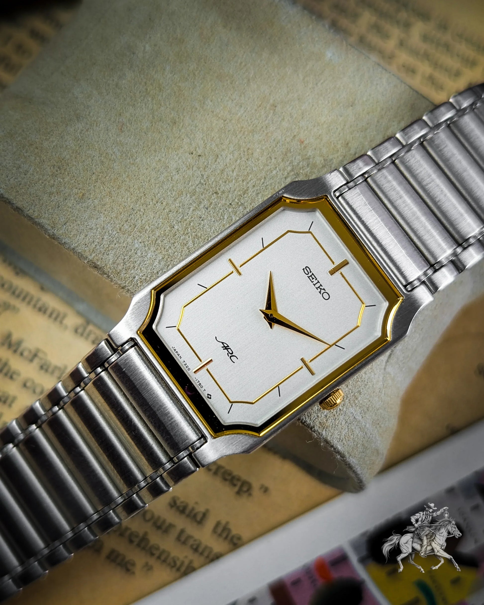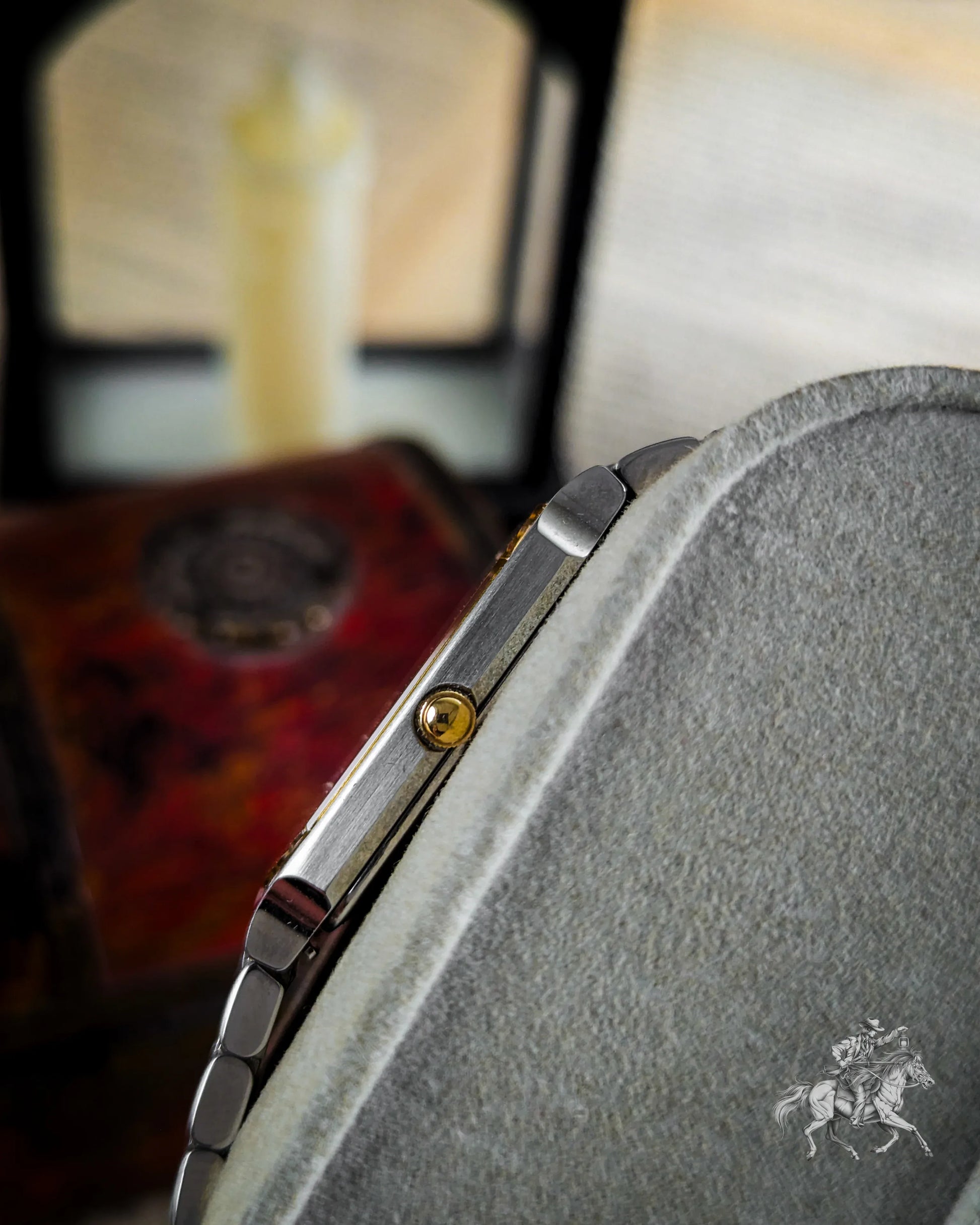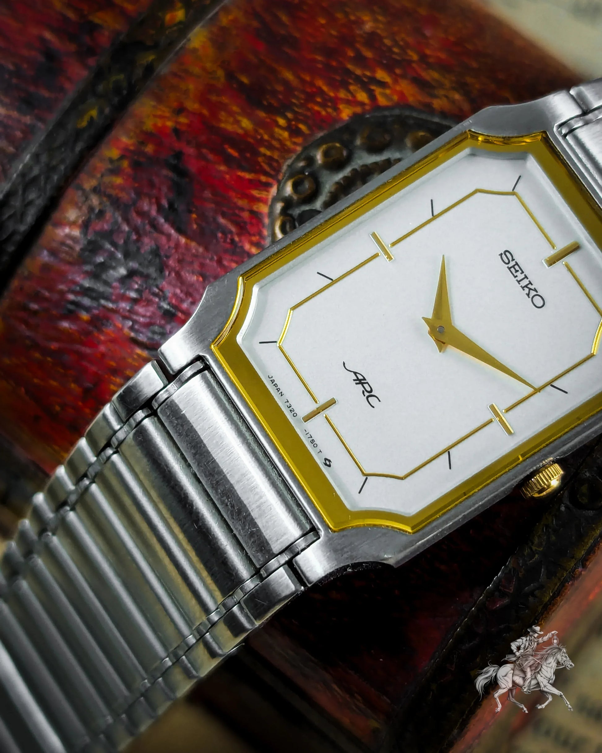 A classic Seiko VRC 7320-6460 from the 1980s JDM, this timepiece embodies the elegant design of its era. It features a sophisticated two-tone aesthetic with a distinctive tank case and a seamlessly integrated bracelet.