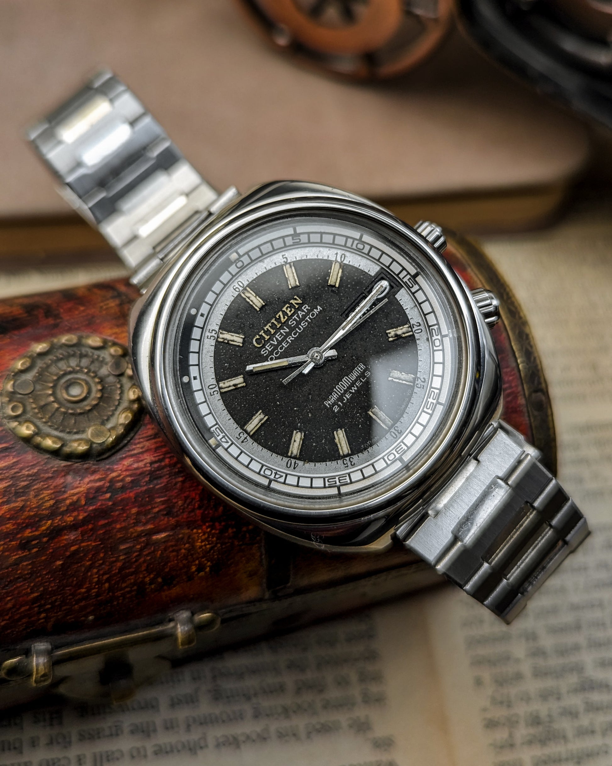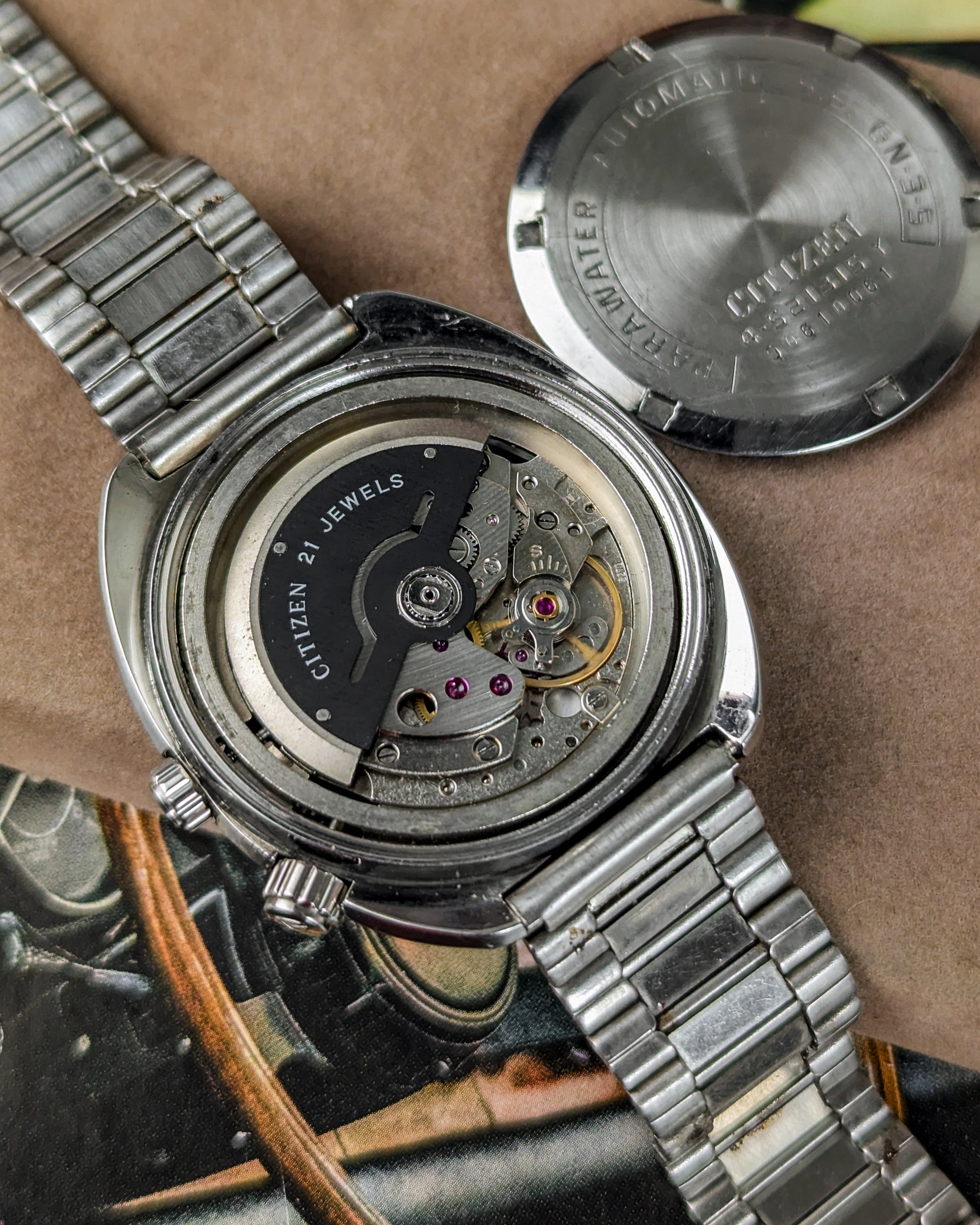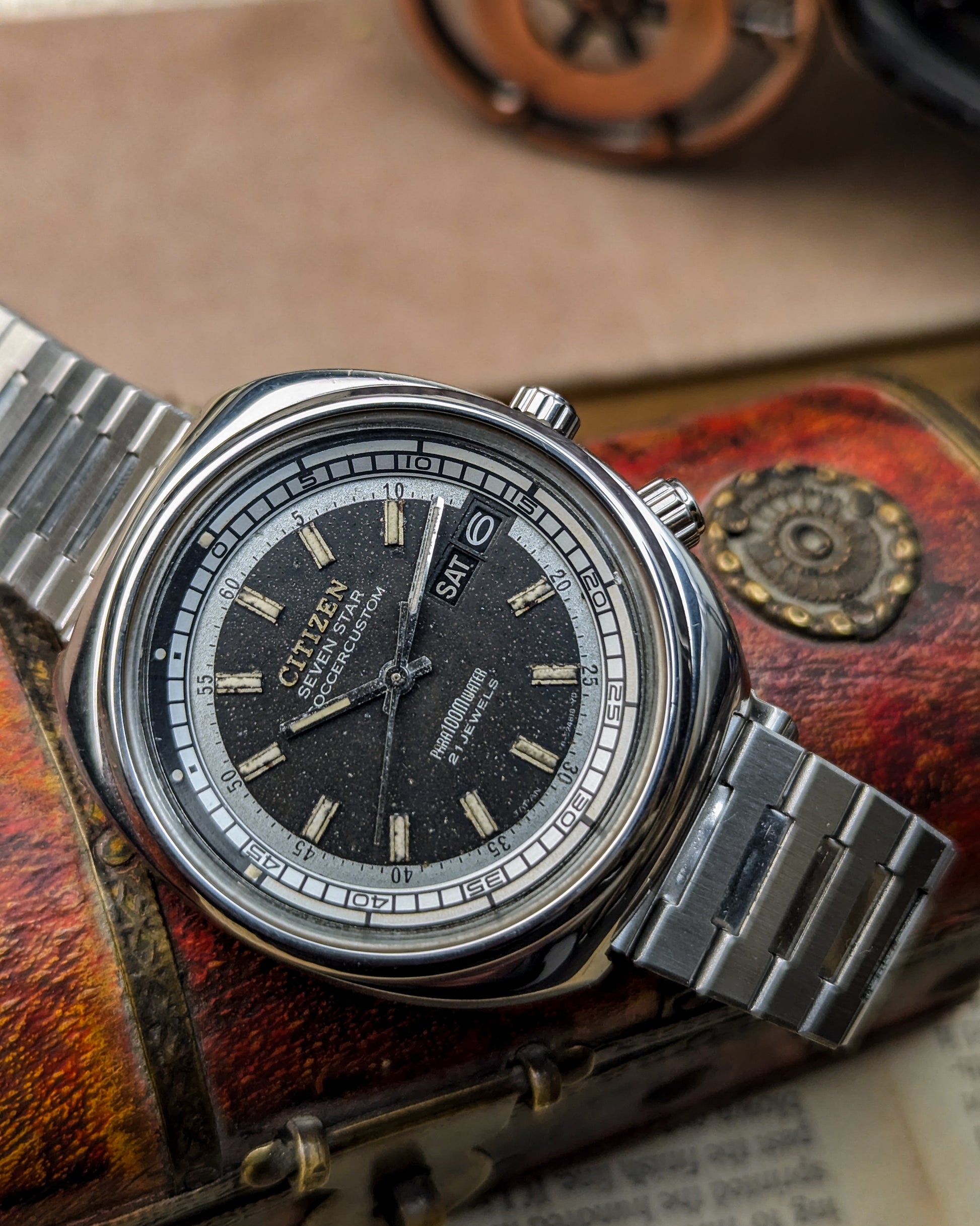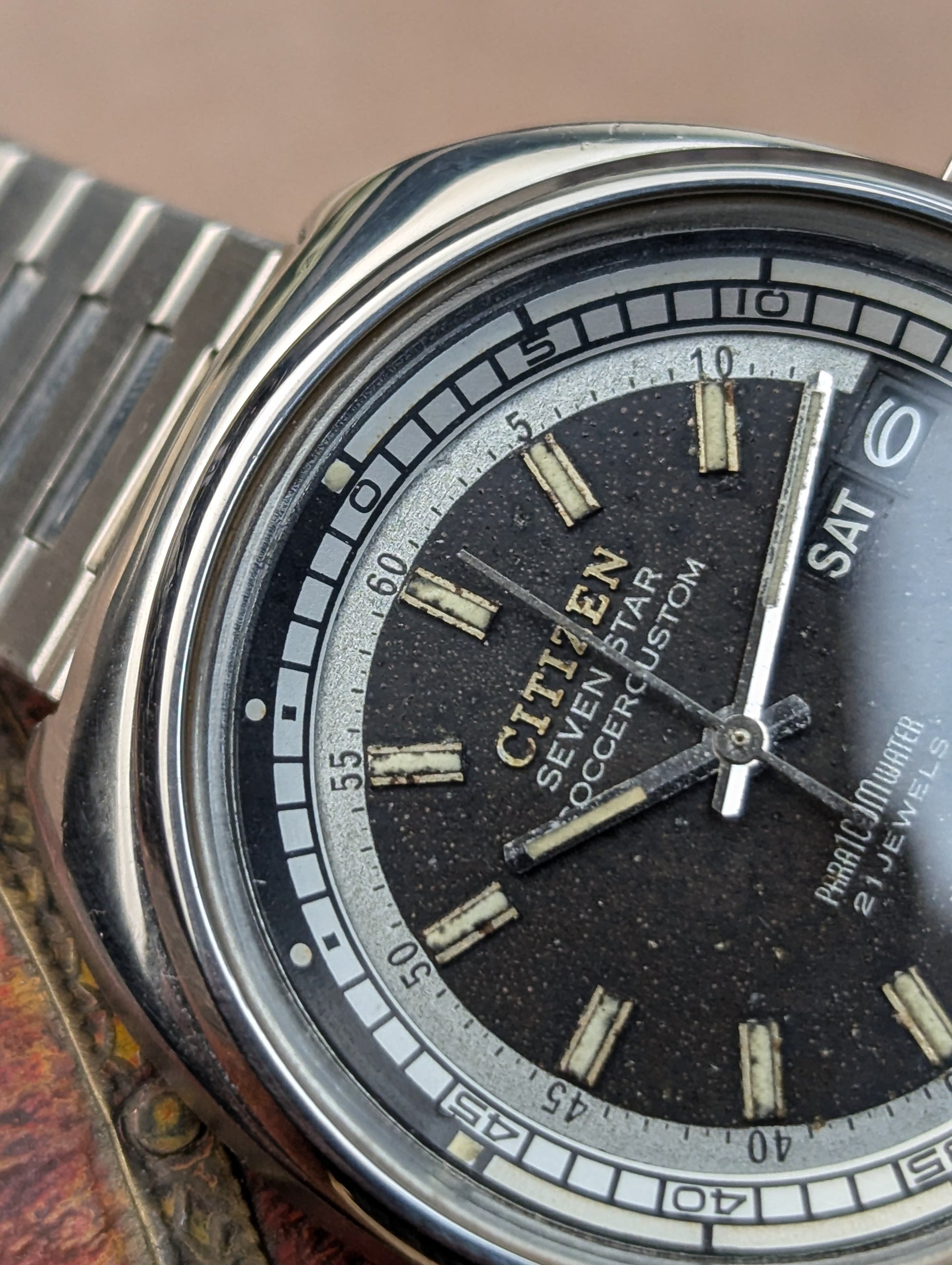 This timepiece is a fascinating blend of practical utility and unique 1970s JDM styling, marking Citizen's shift towards professional and sports watches! The Citizen Seven Star line was the brand's premium automatic offering in the late 1960s and early 1970s, showcasing robust construction with the screw-down "Parawater" caseback- Citizen's early designation for water resistance.