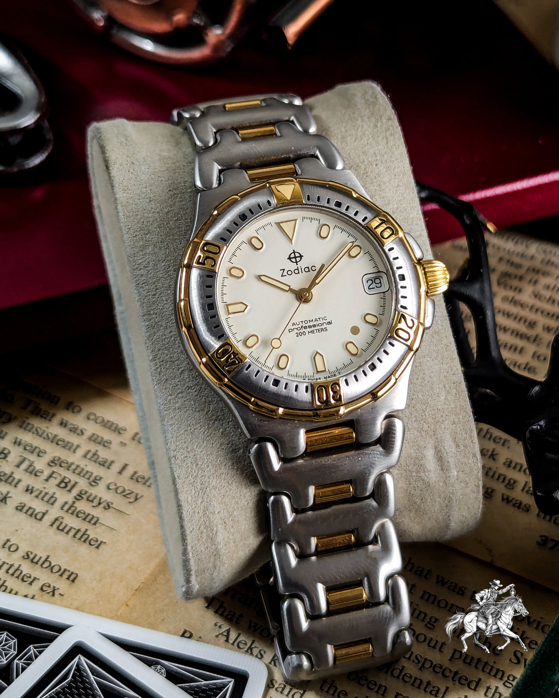 The tactile pleasure of the screw-down crown (essential for that 200m water resistance) and the robust, integrated two-tone bracelet cannot be overstated. This bracelet style is iconic to the era, feeling solid, secure, and incredibly comfortable on the wrist. This watch isn't just a diver; it's a testament to Zodiac’s enduring legacy and offers Swiss automatic prestige and rugged utility at a level that is deeply undervalued today. It's a must-have for any enthusiast looking for a high-quality, Swiss automatic diver with unmistakable vintage charisma.
