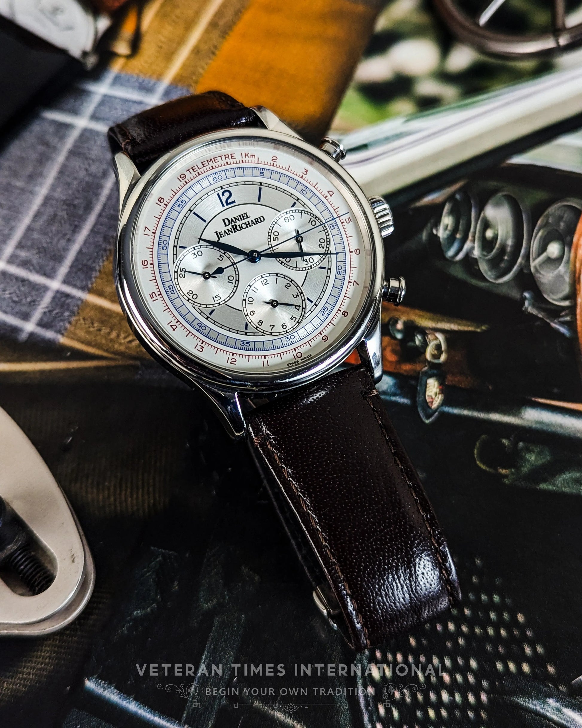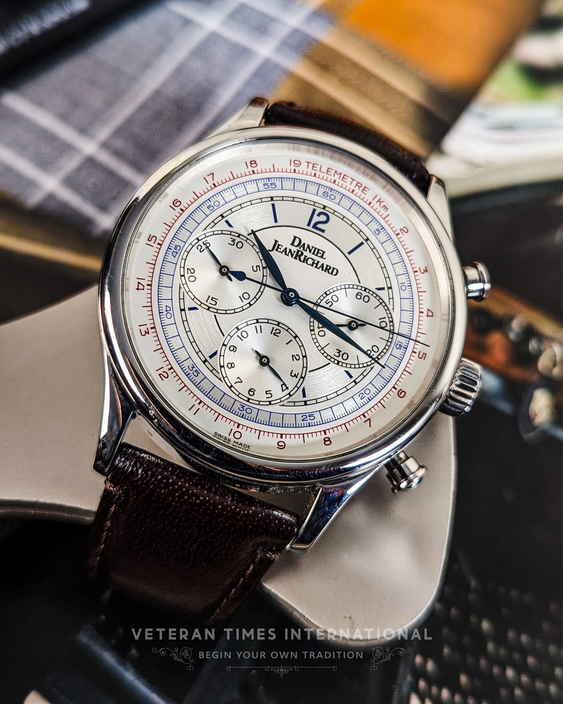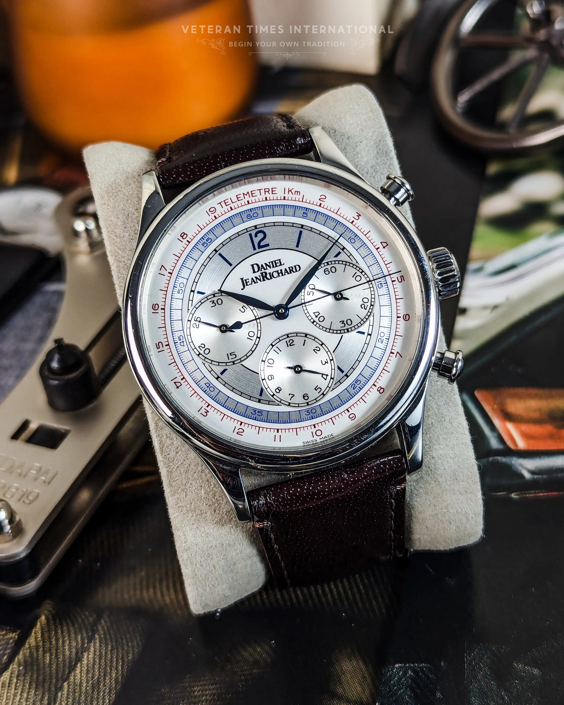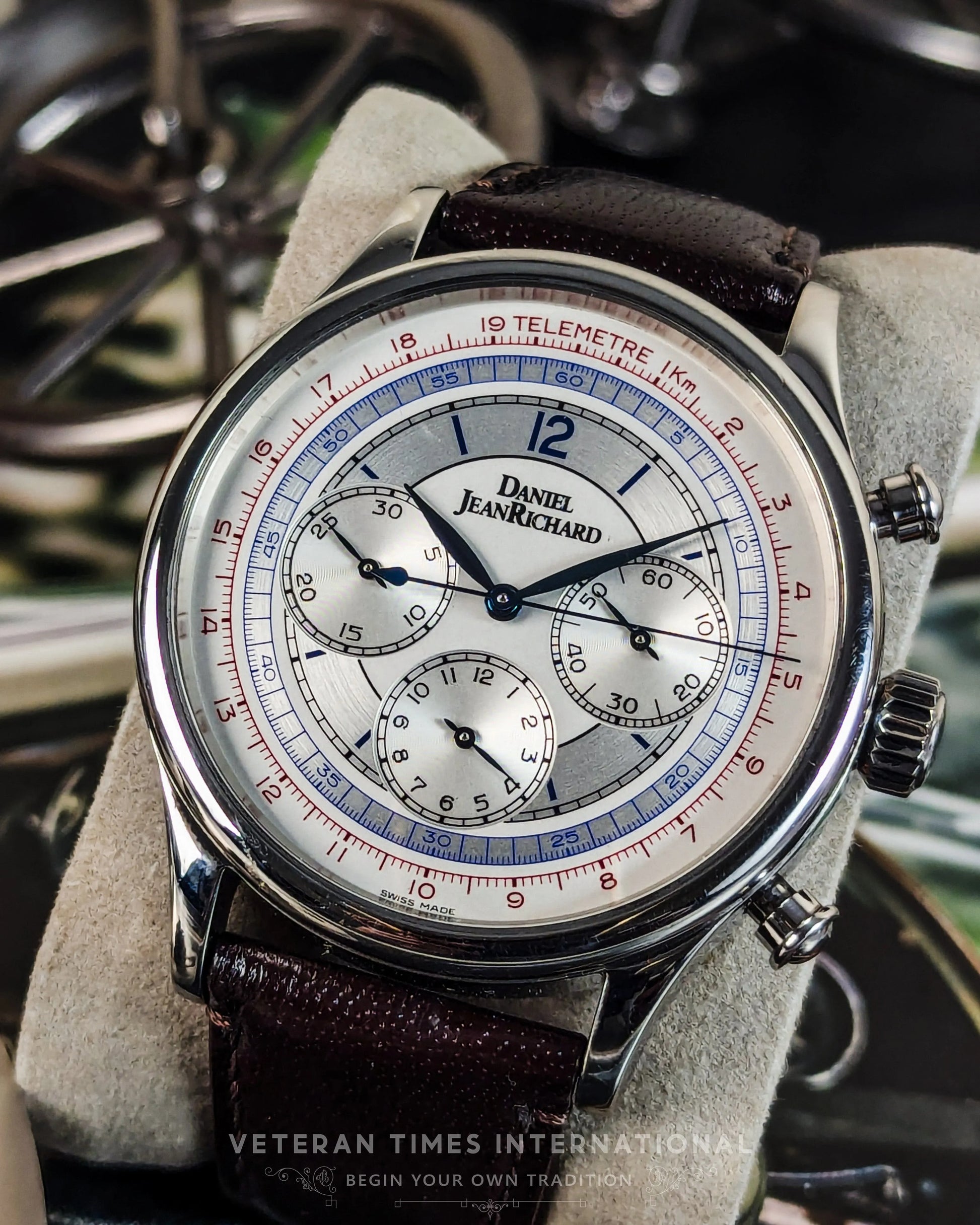 This Daniel JeanRichard chronograph, reference 25012, showcases a harmonious blend of sporty functionality and classic design. The watch features a detailed dial with subdials for chronograph functions, a date window, and both tachymeter and telemeter scales, offering a range of useful complications. Luminous hands and markers ensure excellent legibility in various lighting conditions.