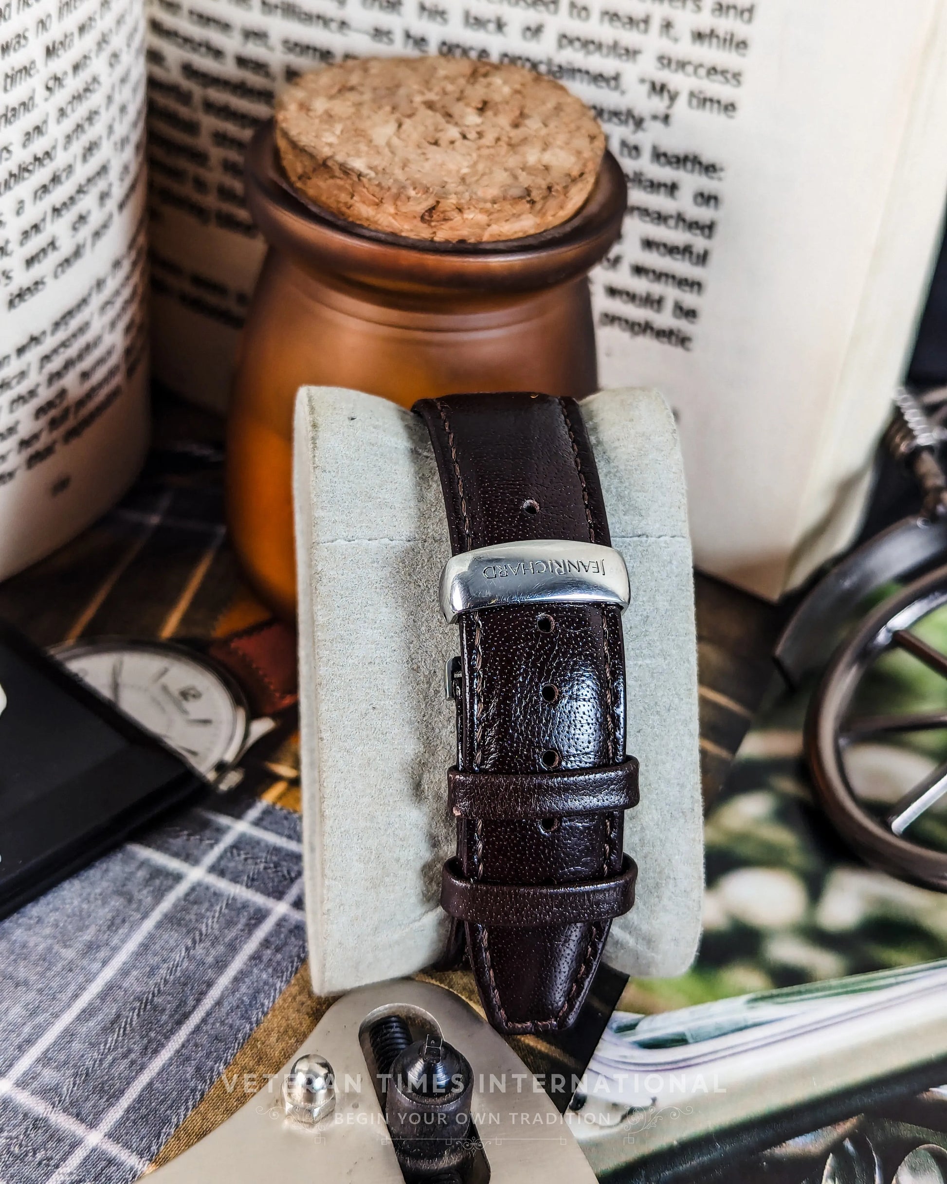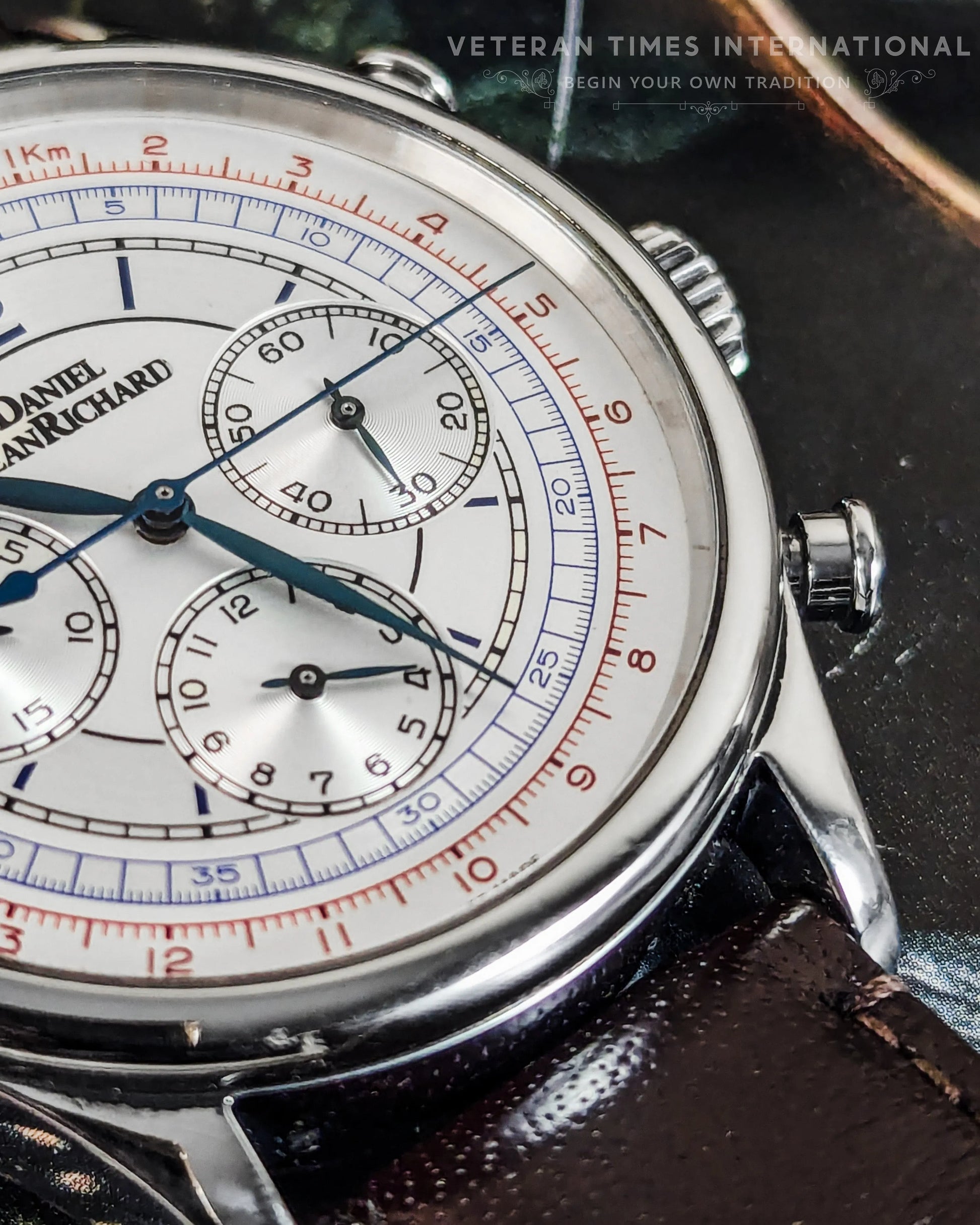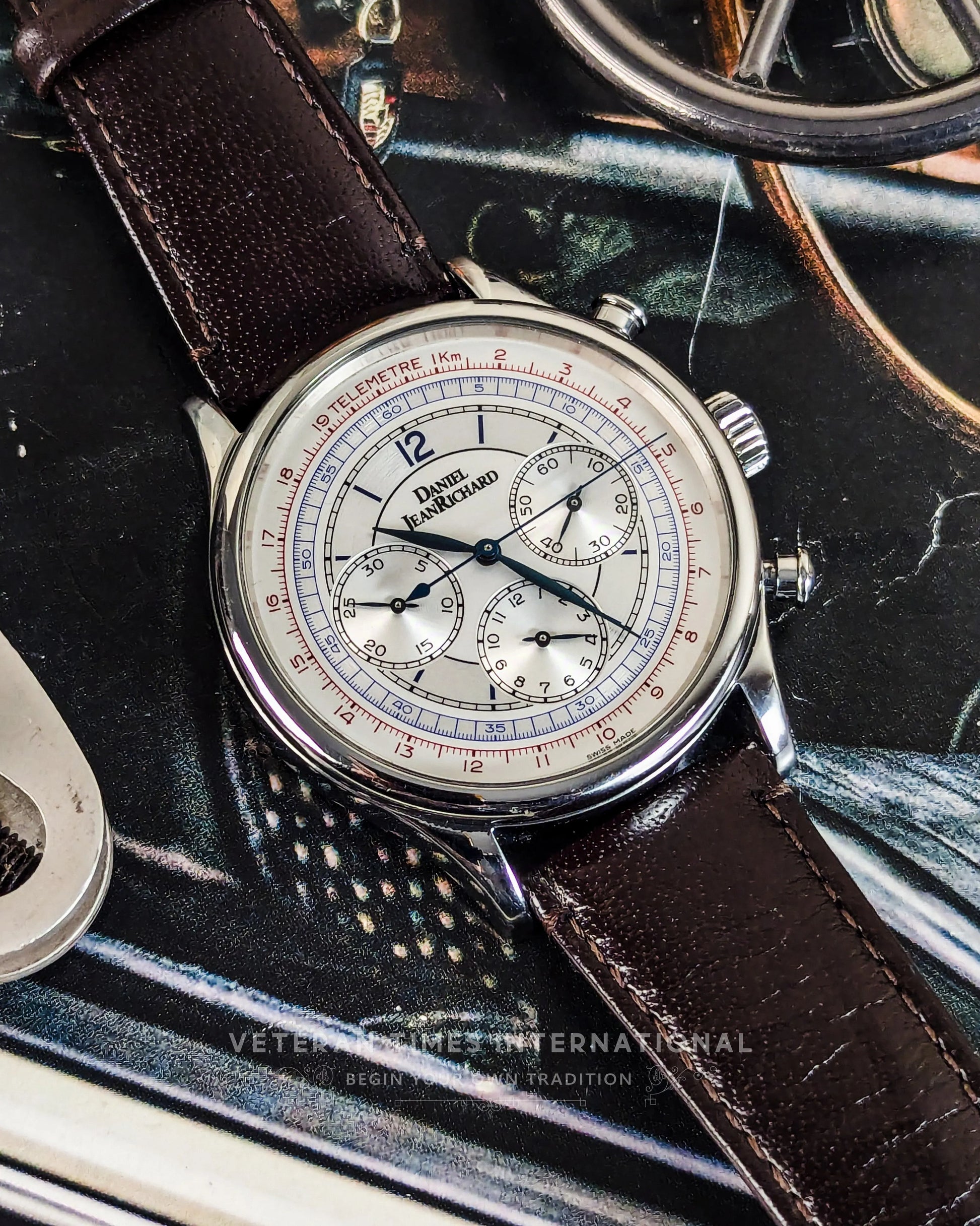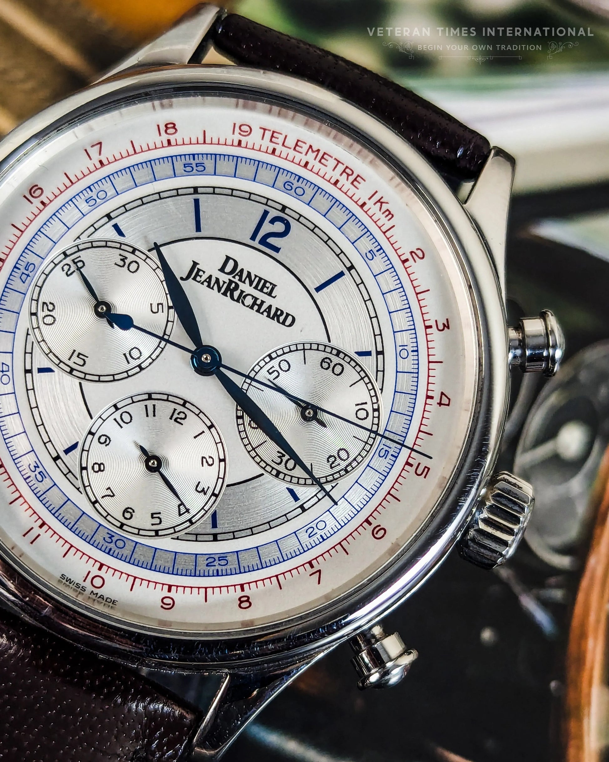 This Daniel JeanRichard chronograph, reference 25012, showcases a harmonious blend of sporty functionality and classic design. The watch features a detailed dial with subdials for chronograph functions, a date window, and both tachymeter and telemeter scales, offering a range of useful complications. Luminous hands and markers ensure excellent legibility in various lighting conditions.