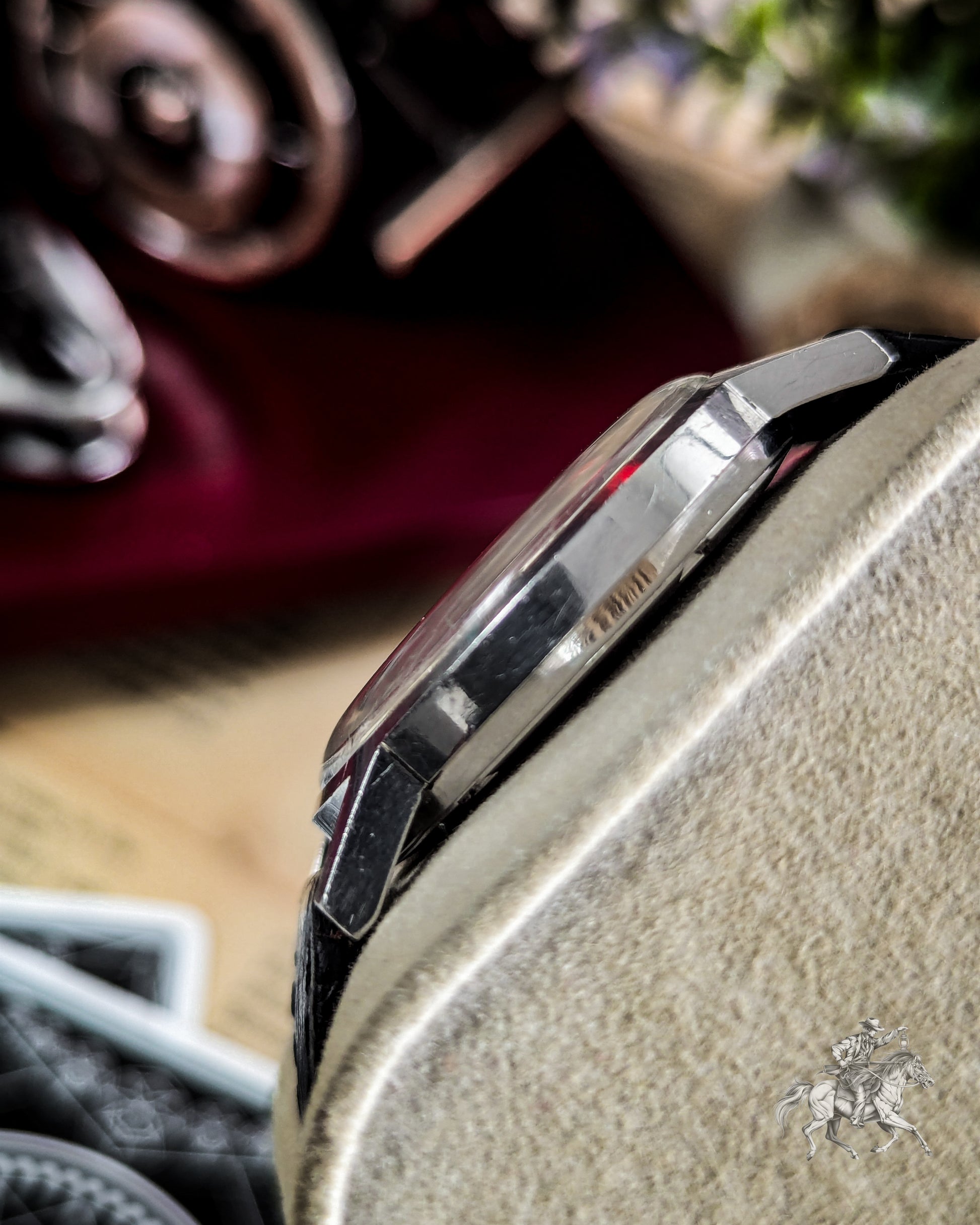The most unique and unrepeatable feature is that gorgeous, slightly textured, aged dial. The fine speckling of patina across the silver surface gives it a desirable "Stardust" or "Tropical" effect—a natural sign of its age and authenticity that simply cannot be replicated by modern manufacturing. This warm character is what separates a true vintage piece from a sterile reissue, and it's a detail that collectors actively seek out and prize.