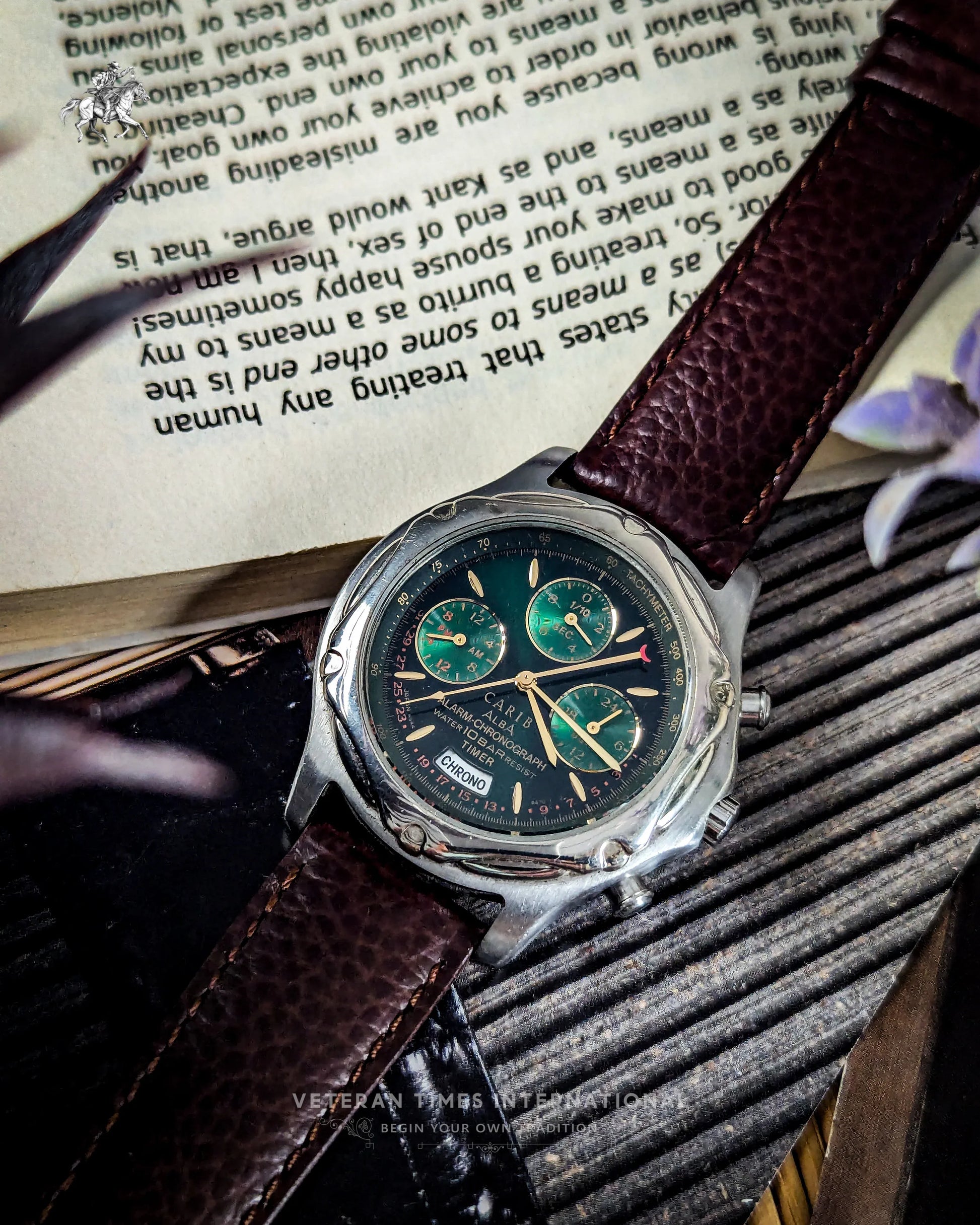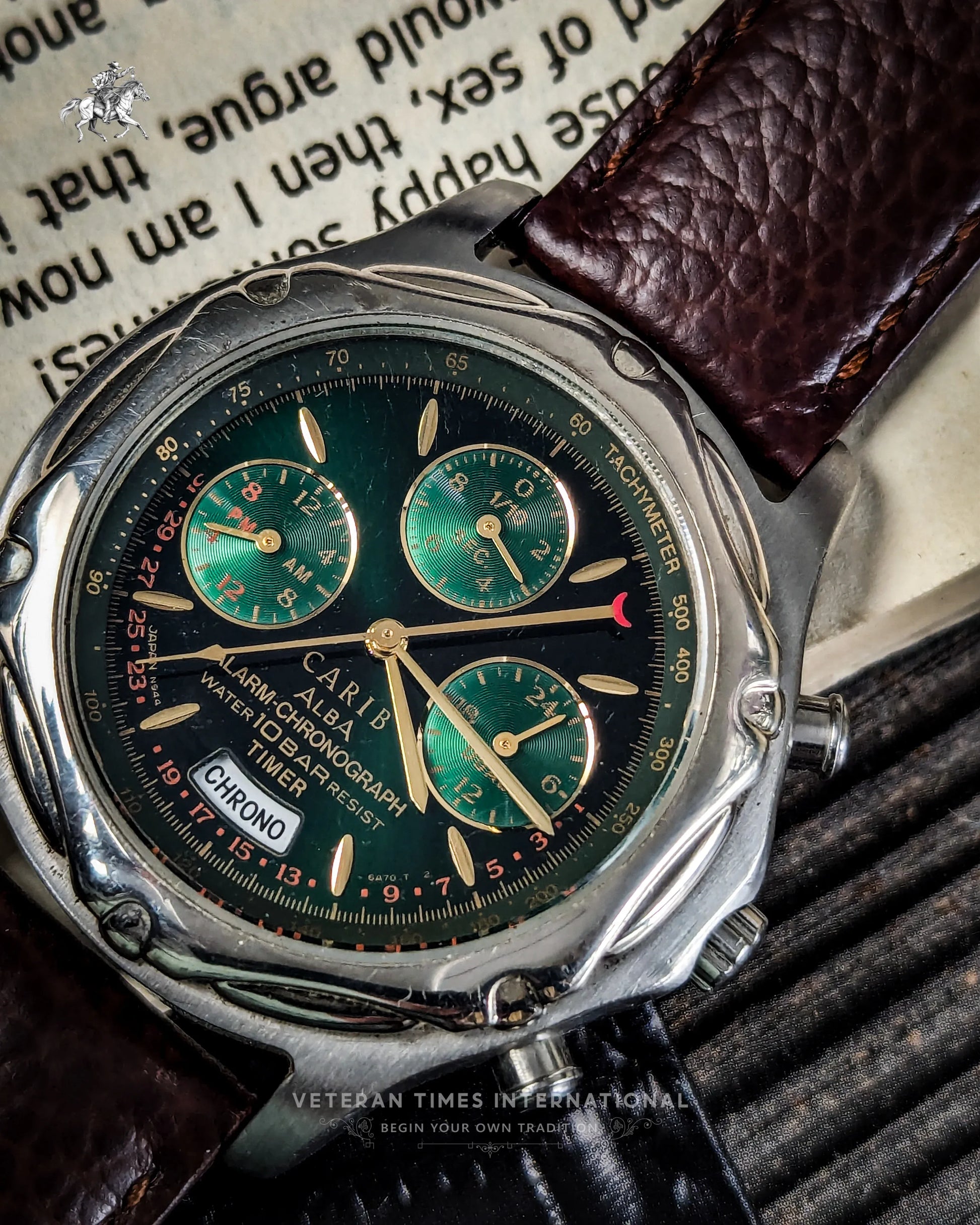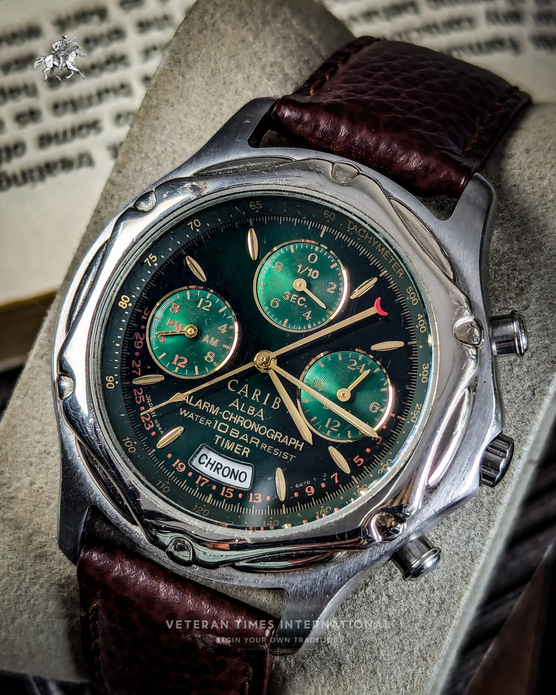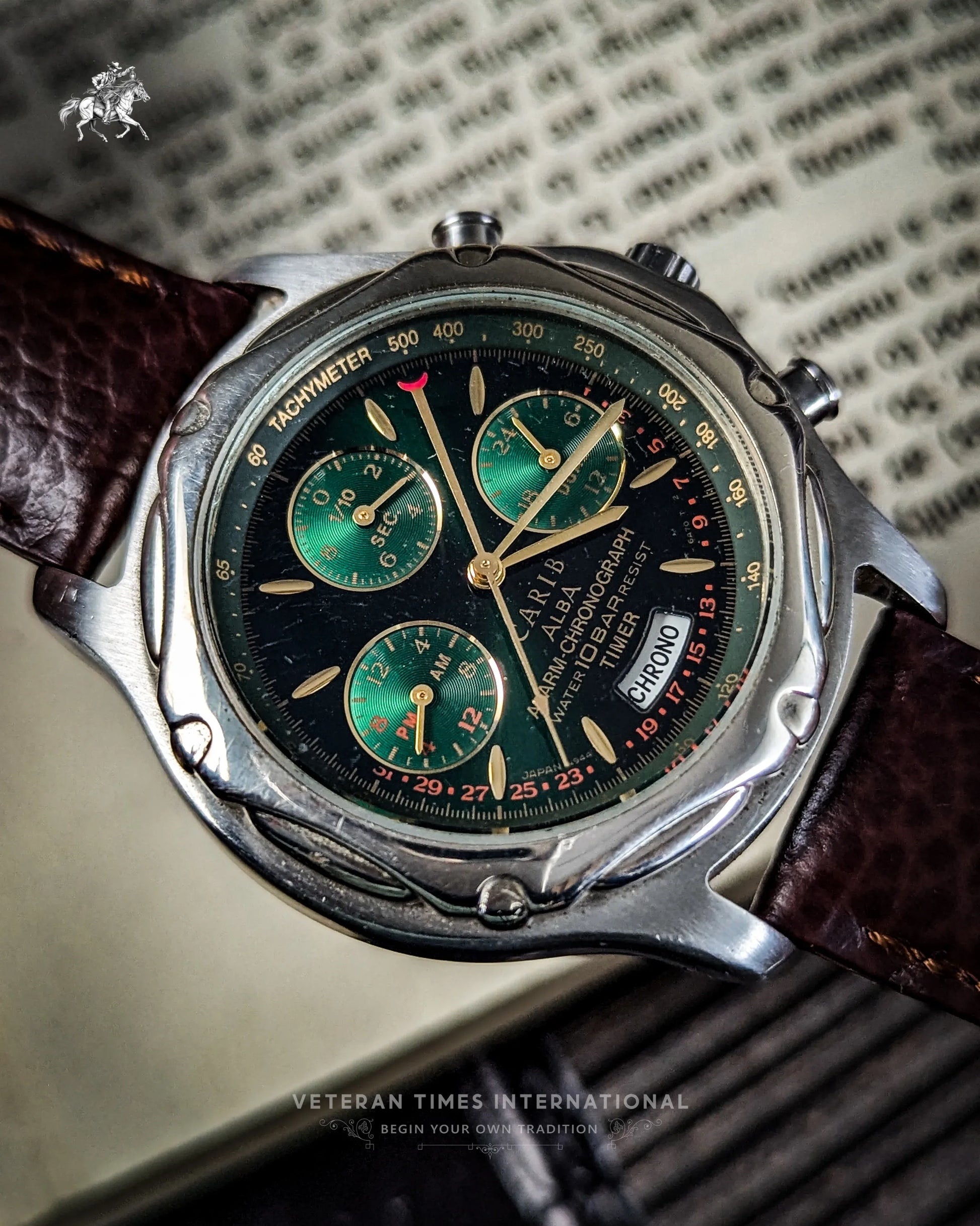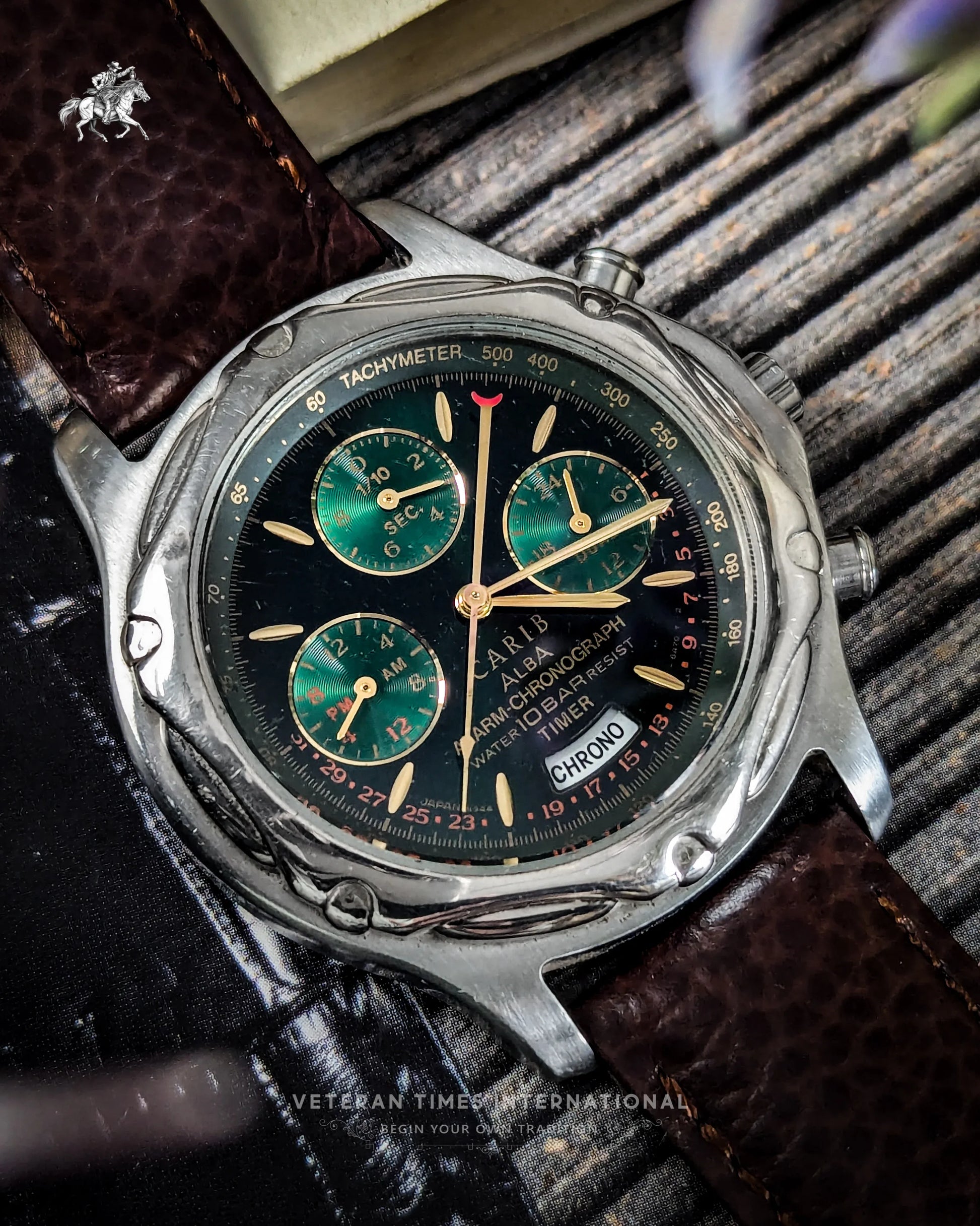 The Seiko Carib Alba N944-6A40 is a bold standout from the golden era of 1990s quartz chronographs. With its striking black dial and vivid green metallic subdials, it delivers instant visual impact. The gold-tone indices and hands pop beautifully against the dark backdrop, while the full chronograph setup, 24-hour indicator, and alarm function, powered by the reliable Seiko Cal. 944A, prove that this watch isn’t just about aesthetics. It’s a tool, and one with serious vintage charisma.