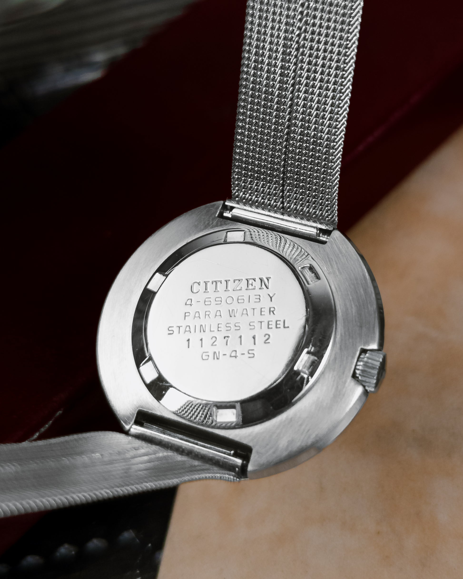 The construction is incredibly robust, featuring the historic "Para Water" designation on the case back, which was Citizen’s proprietary term for their early water-resistant watches, a hallmark highly prized by vintage collectors today. The stainless steel case is paired with a delicate and stylish mesh bracelet, making it a perfect blend of a durable tool watch and a high-fashion accessory. The case back reveals the serial number 1127112, which definitively dates the production of this unit to January 1971. This is an exceptional acquisition for a collector who appreciates high-beat mechanical ingenuity, rare "Para Water" heritage, and classic 1970s Japanese elegance.